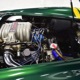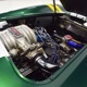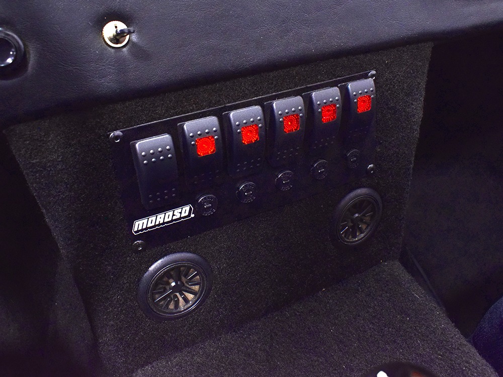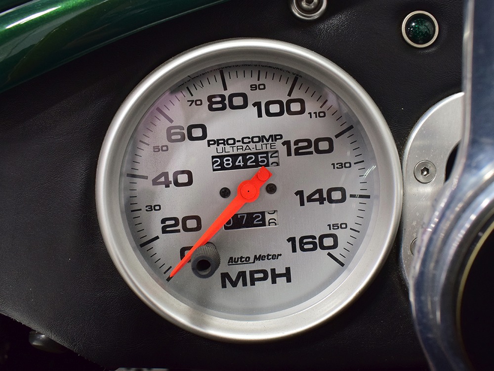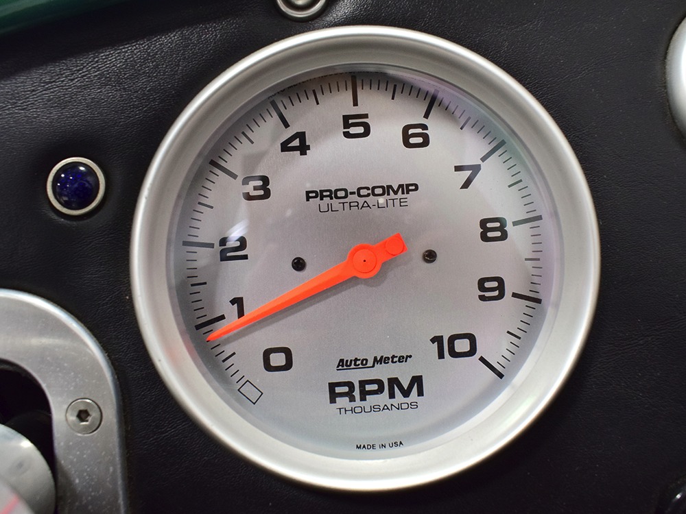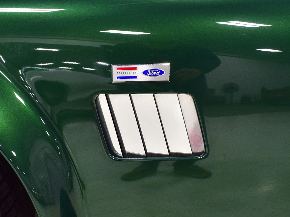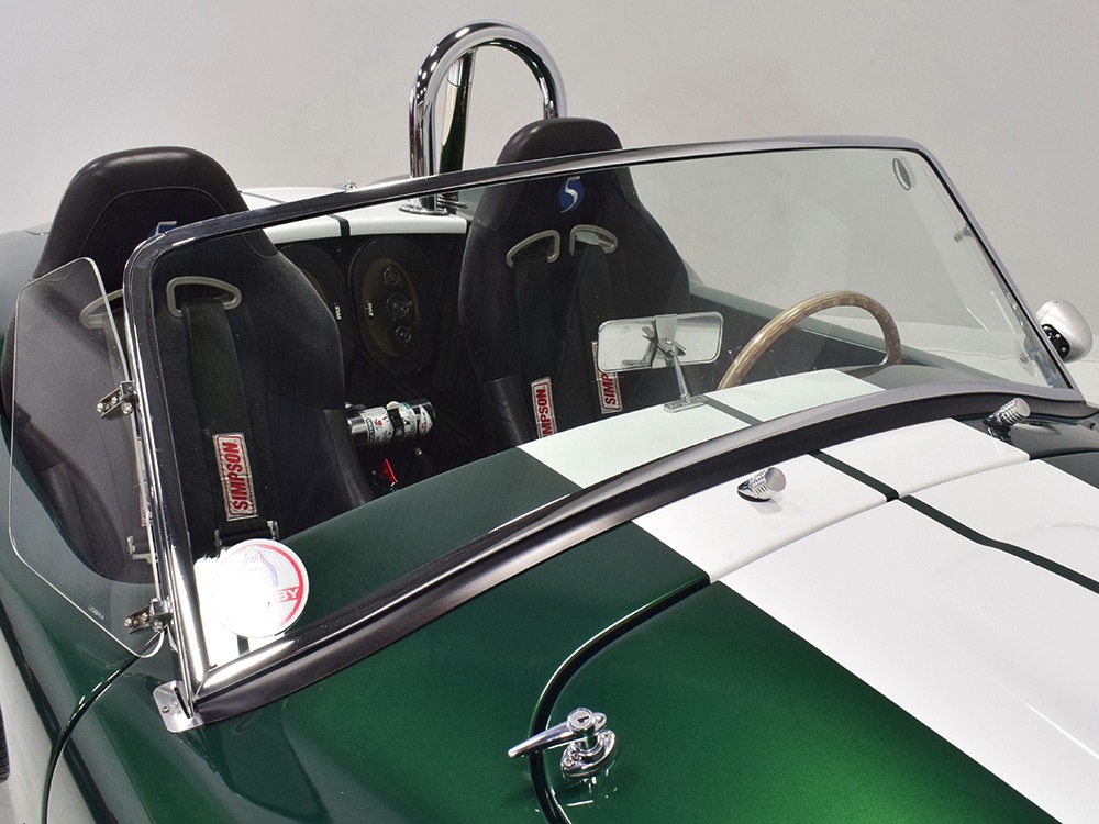 This gorgeous Factory 5 Cobra is a great illustration of the virtues of factory engineering. It was built a few years ago but you can see that they guys doing the fiberglass work really did a nice job, because it’s smooth, the panels fit well, and there’s just no evidence that it’s ‘glass until you rap your knuckles on it. All the kit makers take a few liberties with the Cobra shape (nobody can tell without an original sitting nearby anyway), but the Factory 5 cars are more accurate than most and the stance on this one looks downright predatory. With two extra inches of wheelbase, there’s a bit more room inside, but again, you’ll never notice just standing next to it and the driver will be eternally grateful for the upgrade. The metallic green paint with white stripes is a traditional Cobra look and we like the somewhat subtle color combination. The addition of yellow hashmarks on the front fender is a nice touch, and recalls when these were actual race cars—hash marks were often used to help spotters tell the cars apart from a distance or at night. Other thoughtful details include the jacking stubs, mesh grilles over the headlights, and those massive KC Highlighter driving lights in the grille opening—talk about flamethrowers! For authenticity, this Cobra also wears appropriate “Powered by Ford” badges, bullet-style side mirror, and a flip-up gas cap on the rear quarter. Nobody will mistake it for anything else and it’s quite nicely finished and ready to rock.