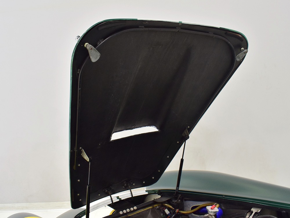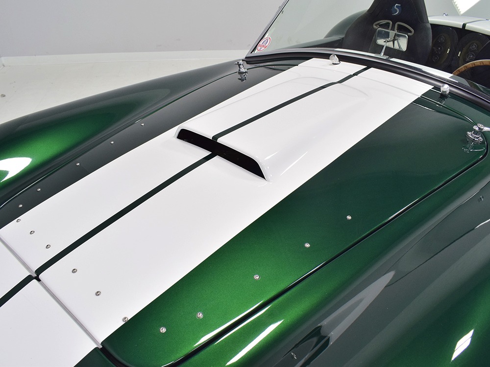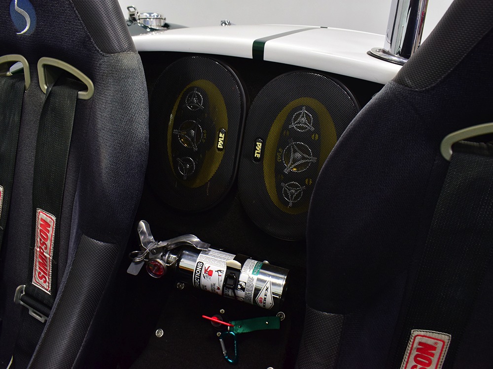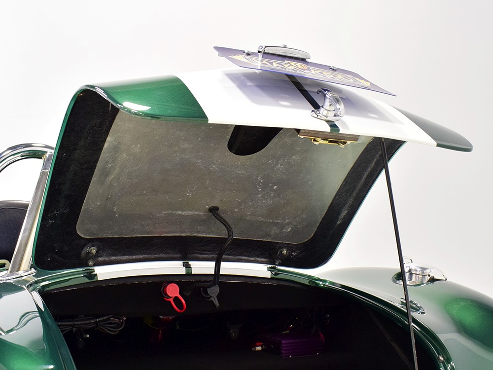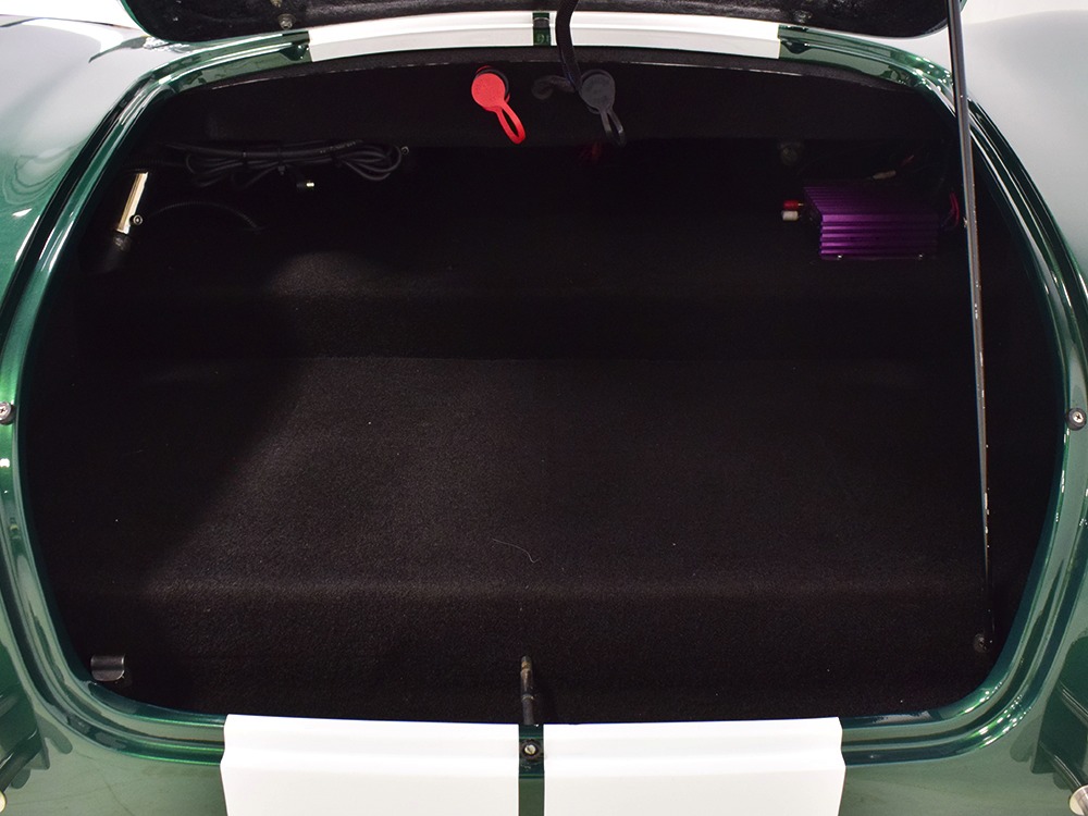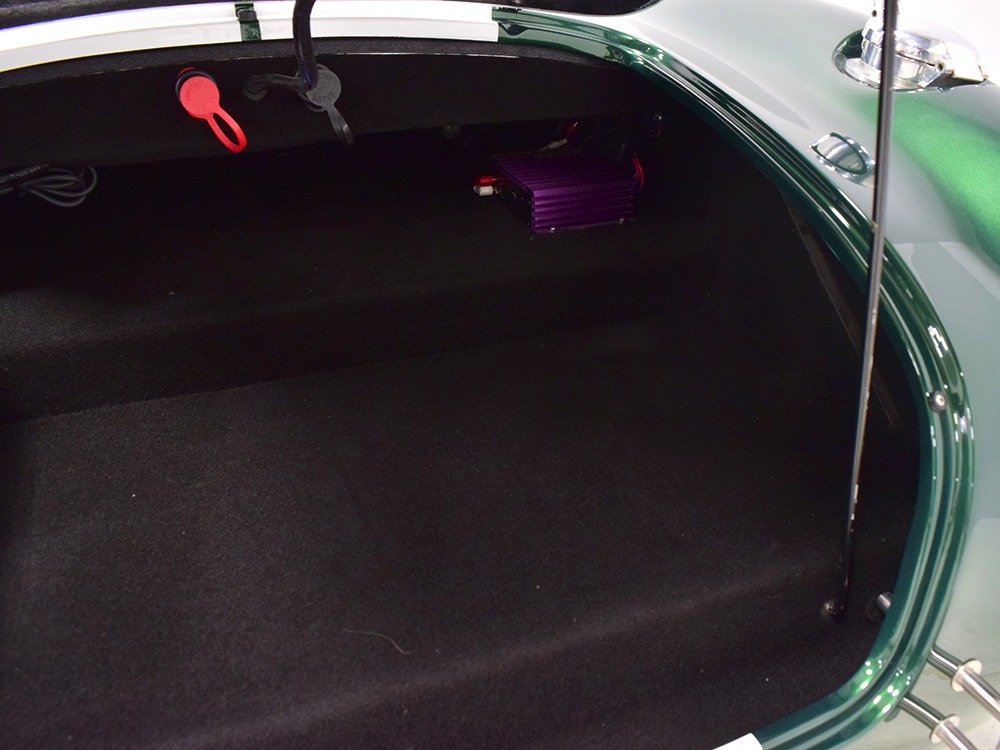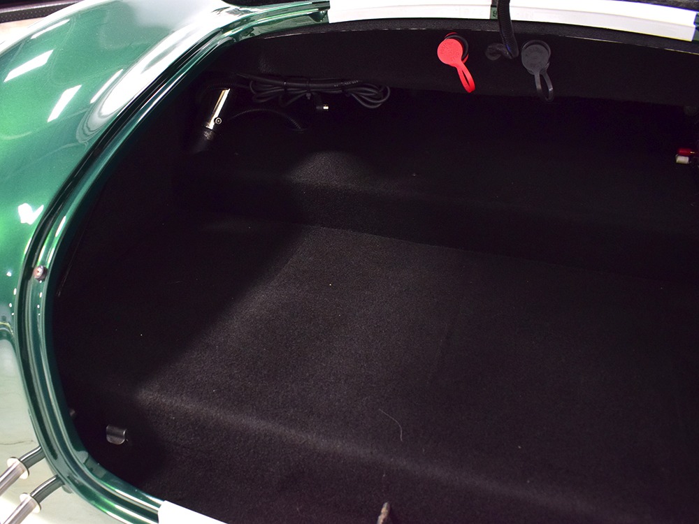 The interior shows that this Cobra was built for combat, eschewing the original low-back buckets in favor of modern high-back racing shells with 5-point Simpson racing harnesses. The rest is familiar Cobra, from the simple door pockets to the flat dash wrapped in vinyl and filled with Auto Meter dials. A wood-rimmed steering wheel is quite authentic-looking and the drilled aluminum pedals are just plain cool. You’ll note this car includes a correct forward-canted shifter for the Tremec 5-speed underneath, as well as a full switch panel to control the various functions like lights, fuel pump, and other vitals. It is wired for a stereo, but there is no head unit, so you could add that if you like, but we suspect that the side pipes provide all the stereo accompaniment you’d want. It’s a bit of climb over the deep bucket seat, and there’s a bit of wear on that high-traffic spot, but the rest is in excellent condition and shows minimal signs of use. Once you’re in there, the driving position is superb, the pedals are well-arranged, and the steering feels hard-wired into your cerebellum. The trunk is neatly finished with carpets and a pair of charging stubs, but there is no top—in a Cobra, what’s the point?