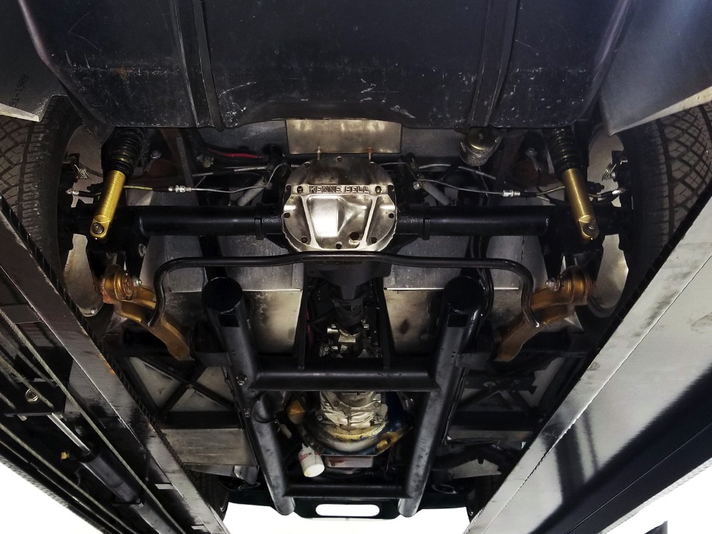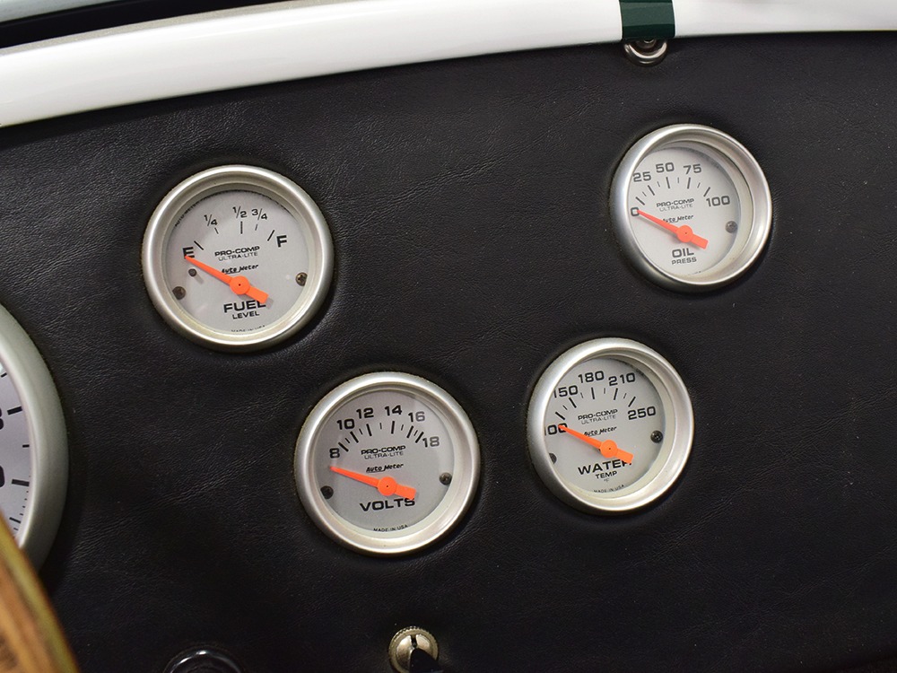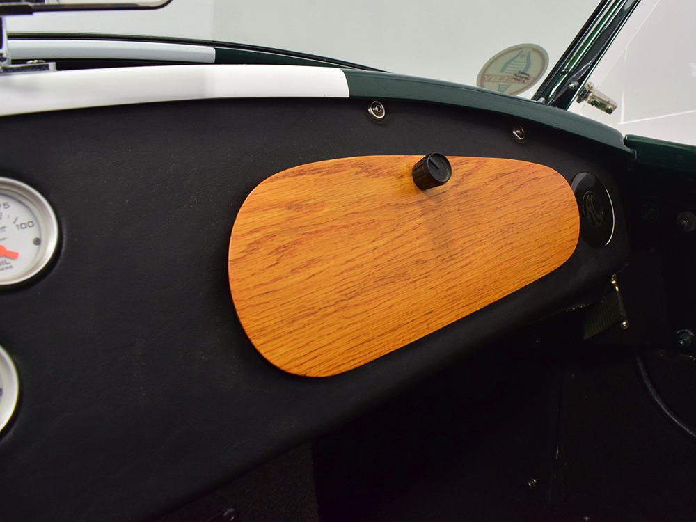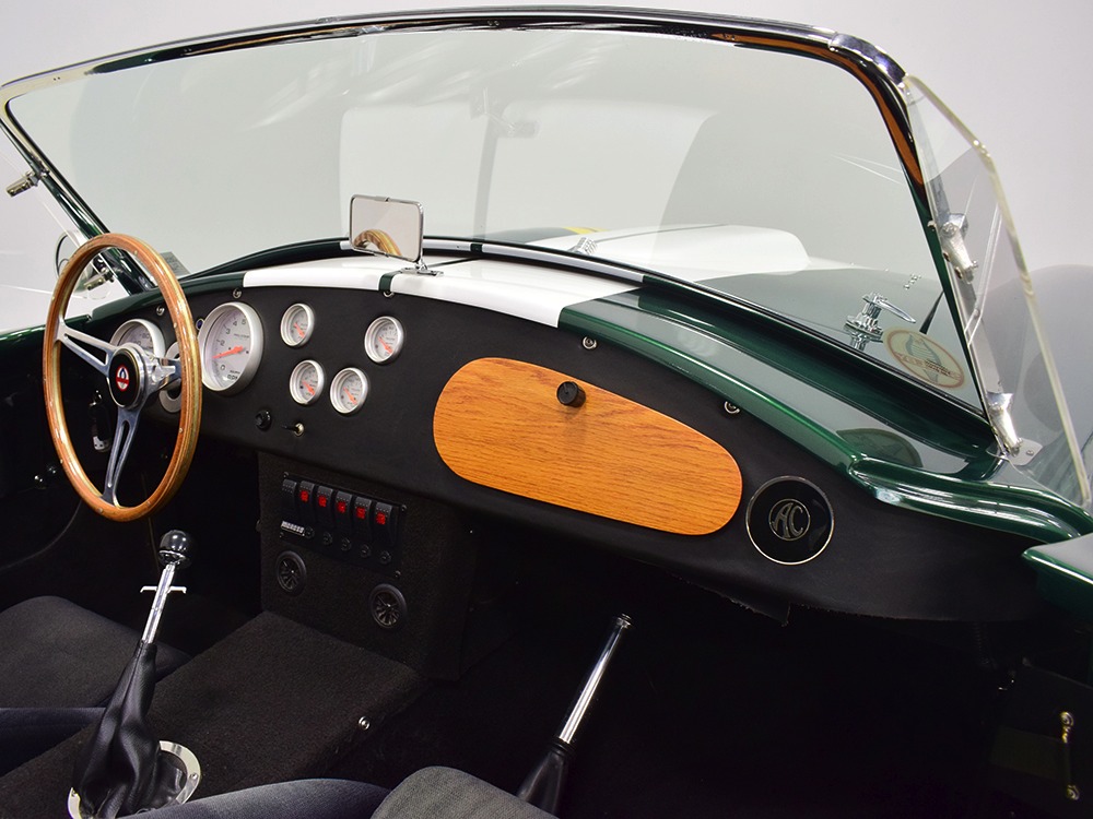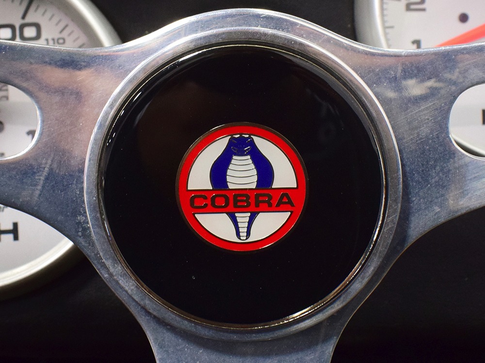 This Cobra should last practically forever, because under the forward-tilting hood you’ll find a bone-stock 5.0 liter V8 from a 1993 Mustang Cobra. The distinctive intake manifold gives it away every time, but by keeping it stock, reliability is bulletproof. And with 1000 fewer pounds to haul around than in the already pretty quick Mustang, performance is electrifying. All the factory electronic controls are still in place, so it starts easily, idles well, and never gets fussy. A few dress-up parts like the finned aluminum valve covers recall the ‘60s while a giant radiator with an electric fan keeps it cool. A/C and power steering aren’t on the menu in a Cobra, but you do get nice features like a modern alternator, hood struts to keep the hood open (most Cobra kits use a prop rod), and a set of beautifully made exhaust headers that dump into those satin-black side pipes. Even with 302 cubes instead of 427, the sound is spectacular.
