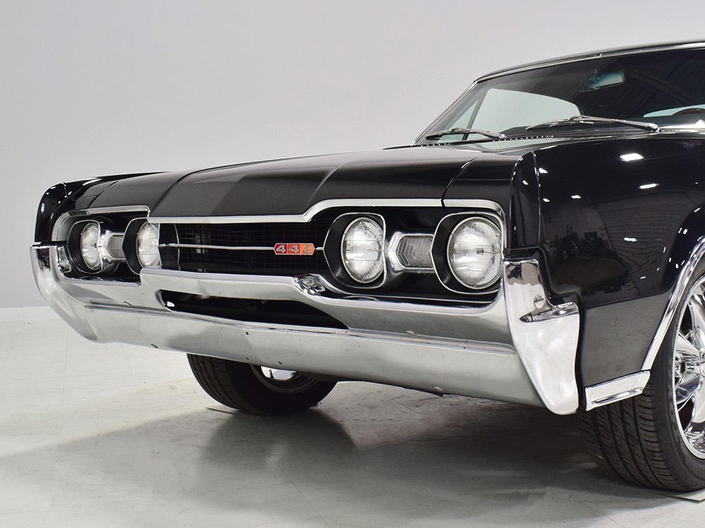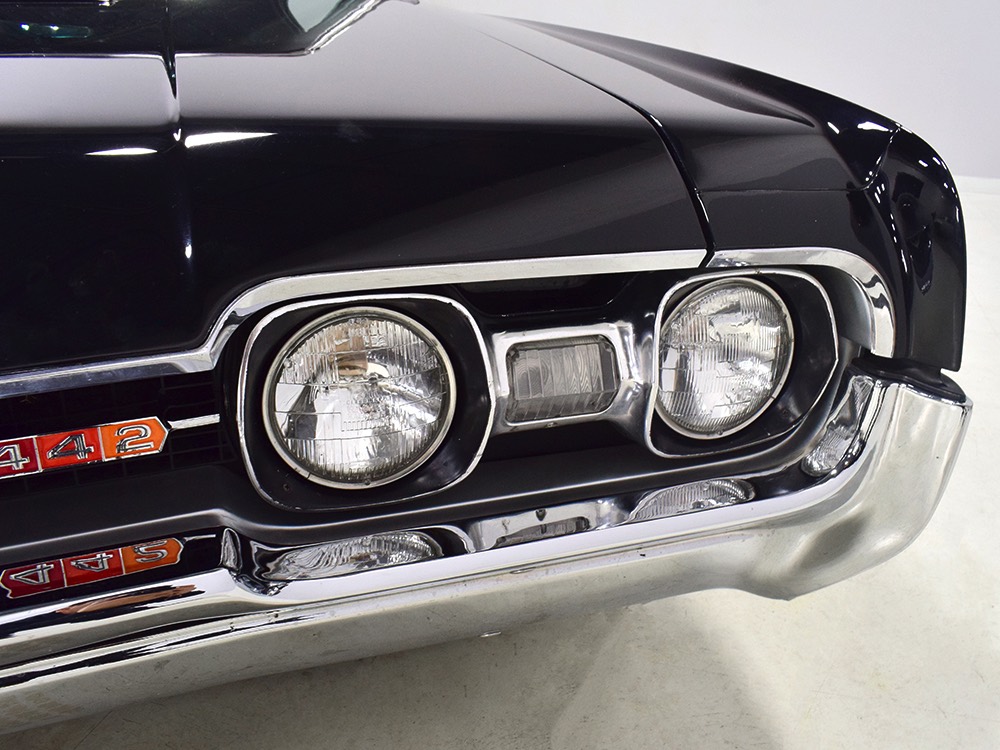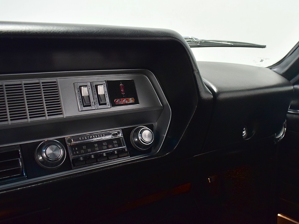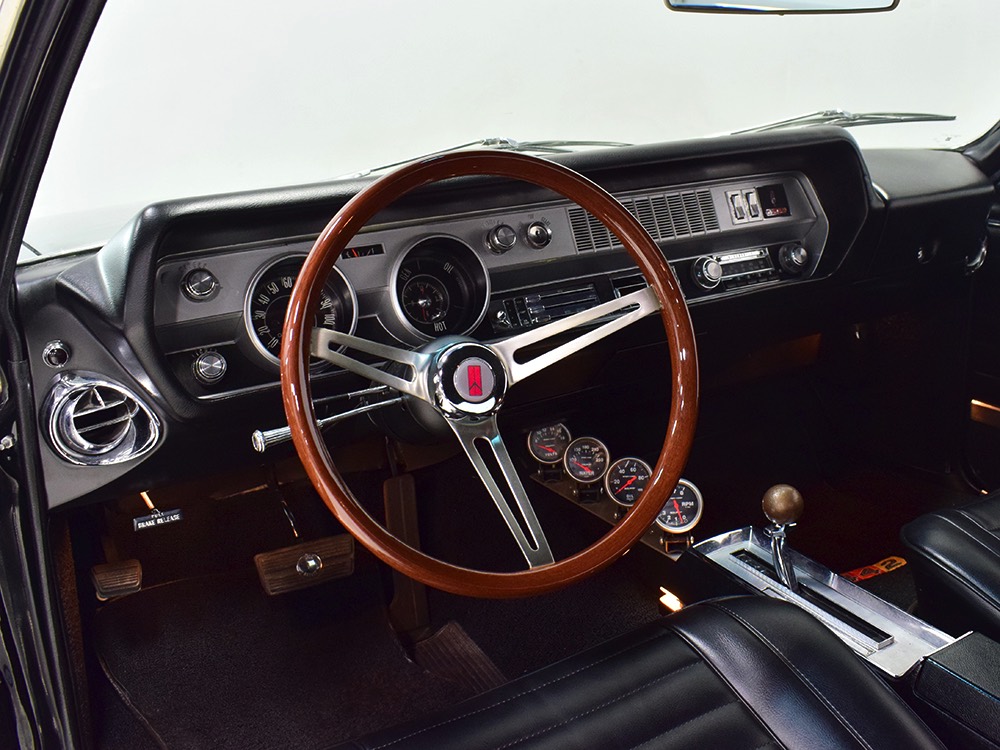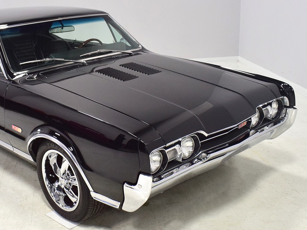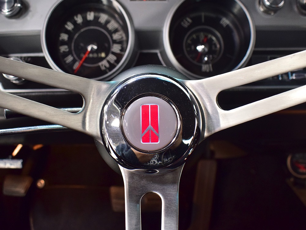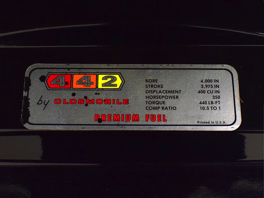 Don’t be fooled by the big wheels, this restored 442 is not too far away from the show field. In fact, the wheels and the carburetor/intake manifold are the lone modifications on what is otherwise a very correct car. The cowl tag will tell you that it was originally code H Aspen Green with a green vinyl top, but that’s a bit too much green even for 1967. So they stripped it down to bare metal, straightened the sheetmetal, and gave it a brilliant coat of code A Ebony Black instead, and we have to admit it works extremely well. No stripes, no add-ons, no spoilers, just the way a grown-up shopping at Oldsmobile would have wanted it. It remains in exceptionally good condition with none of the waves or dings that show up so easily in black paint and even though it shared the A-body platform with the Chevelle and GTO, the 442 has an identity all its own. The horizontal headlights were an Oldsmobile trademark look, the kick-up behind the doors adds a muscular crouch, and from behind it’s unmistakable. Awesome details include the louvered hood that’s just plain cool and the flying buttress C-pillars that give the 442 a sleek profile. Anybody can drive a Chevelle, but a 442 says you’ve got a little taste and sophistication.