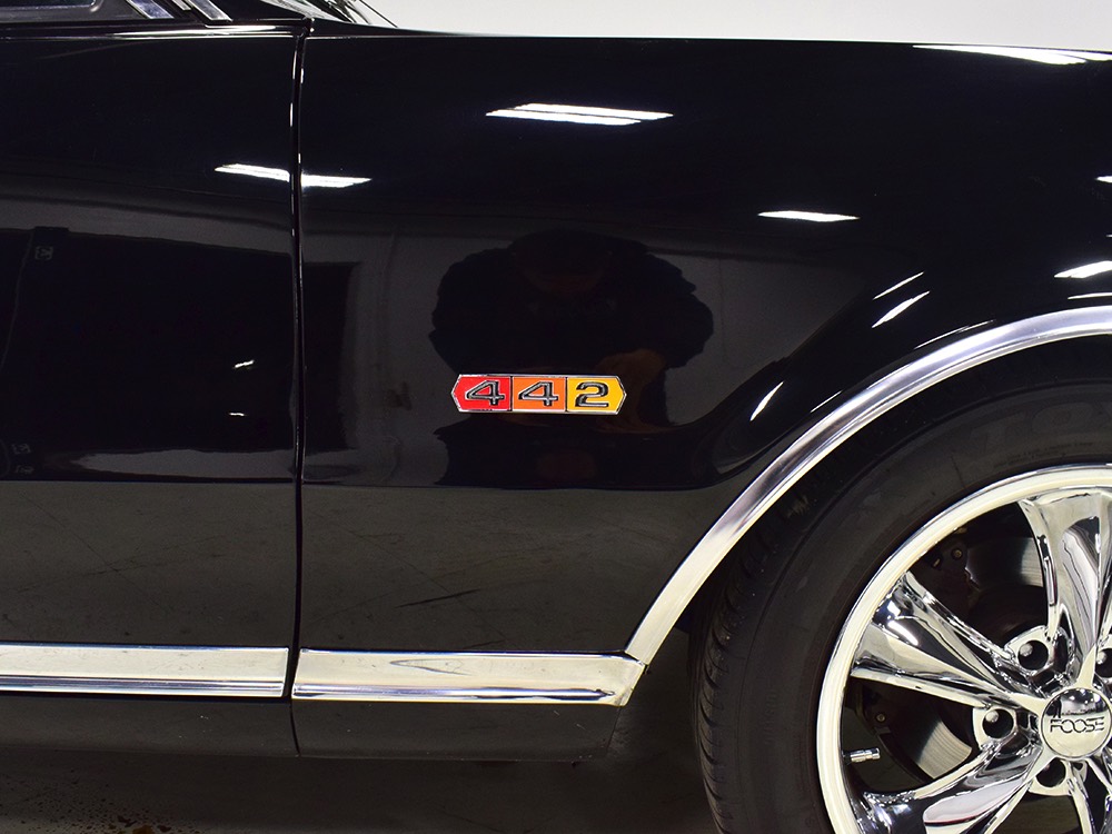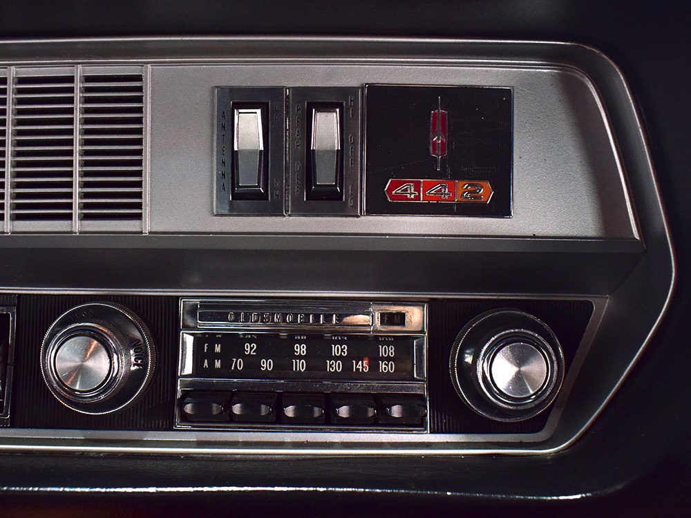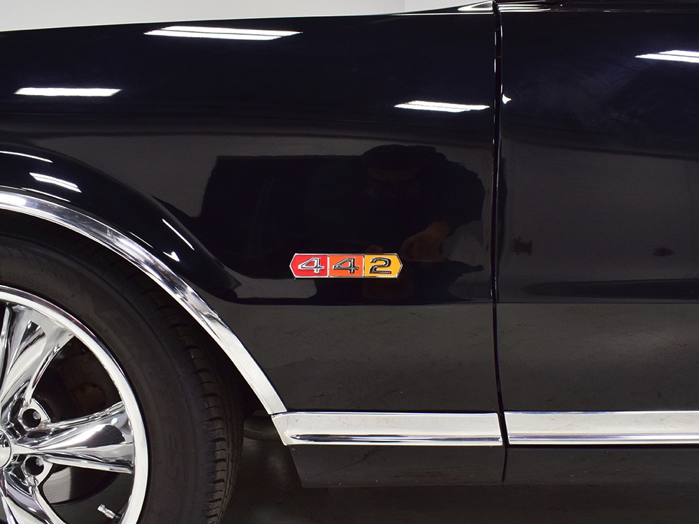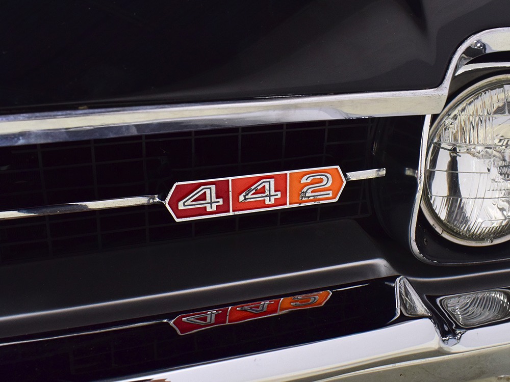 Part of the 442’s appeal comes from the generous helpings of chrome. Check out the beautifully restored bumpers and how tightly they fit to the body, the simple grille with tri-color 442 emblems, and the stainless trim that highlights the fender openings and rockers. The 442 was still a trim package on the Cutlass Supreme, so the standard “CS” emblem is on the trunk with the smaller 442 badge in place but not really advertising in a big way—grownups don’t need to shout. Remember what Teddy Roosevelt said about “walk softly and carry a big stick.”