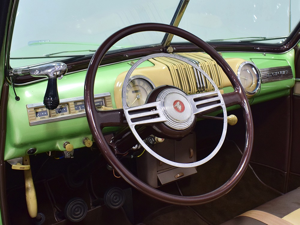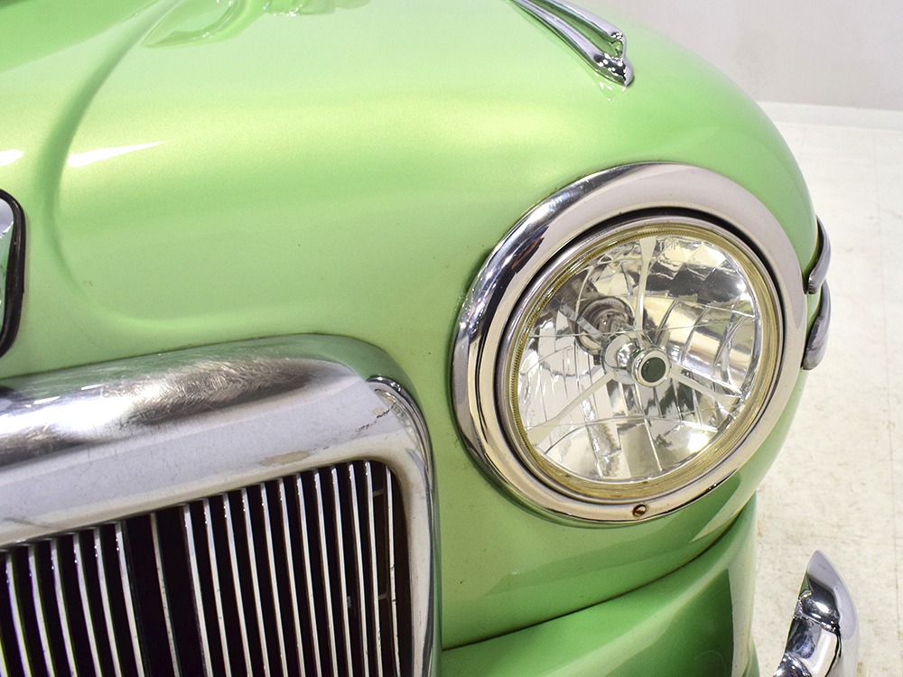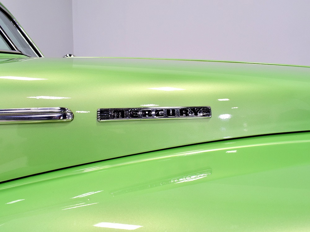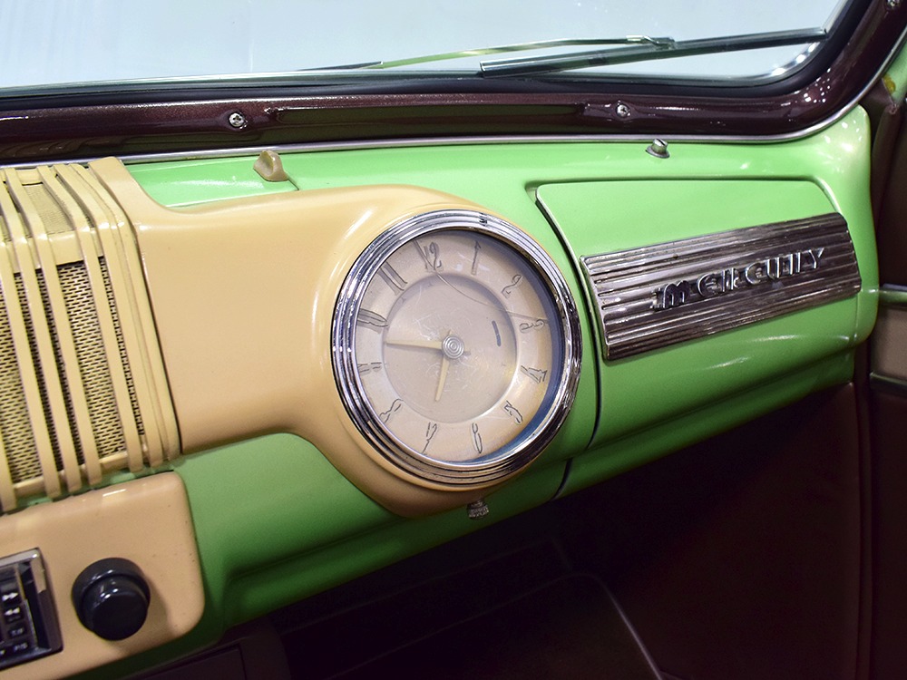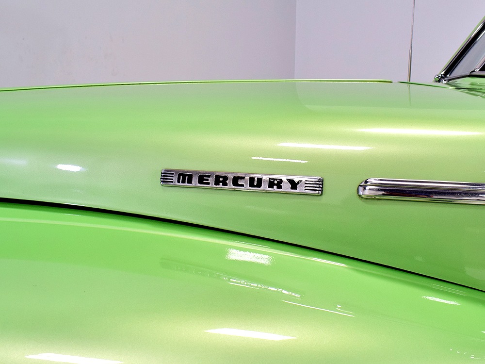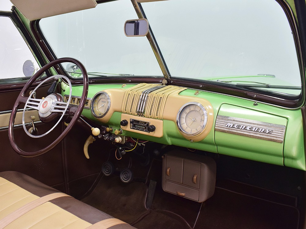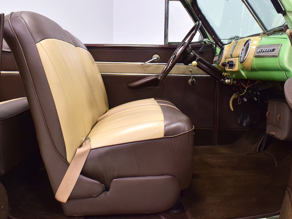That bright green paint wasn’t on the color chart for 1947, but it doesn’t look wrong on the curvy Mercury bodywork, either. There’s a hint of metallic in the final finish and it just glows out in the sunlight, making this car impossible to miss. Underneath, however, none of the factory bodywork was altered, all the original chrome and stainless trim was retained, and it still looks like a car from 1947 is supposed to look. Although it looks very much like the post-war Fords, the Mercury sits on a 4-inch longer wheelbase and none of the body panels are interchangeable—in the flesh, the Merc looks quite a bit more substantial. The familial resemblance is undeniable, but Mercurys received that unique “electric shaver” grille, extra stainless trim on the fenders, and unique emblems and badging that mean it can be recognized at a glance. During the comprehensive restoration, all that brightwork was restored, including the bumpers, which feature rare (and very expensive) bumper ends that really dress the car up nicely. Other accessories include fog lights, a spotlight on the driver’s A-pillar, and a set of aftermarket blue dot headlights that light up the road like flamethrowers at night. Workmanship is quite good, with straight bodywork, good fit and finish, and an overall feeling that the car is well-assembled and durable, which is surely how it felt when it was new.