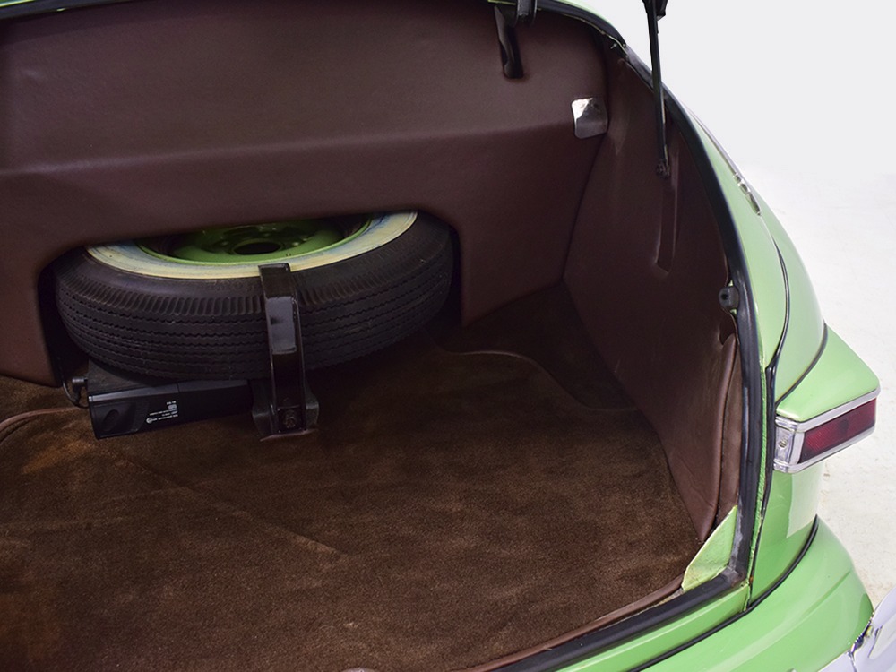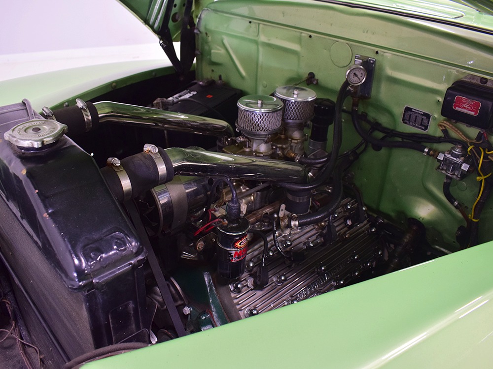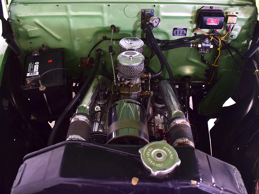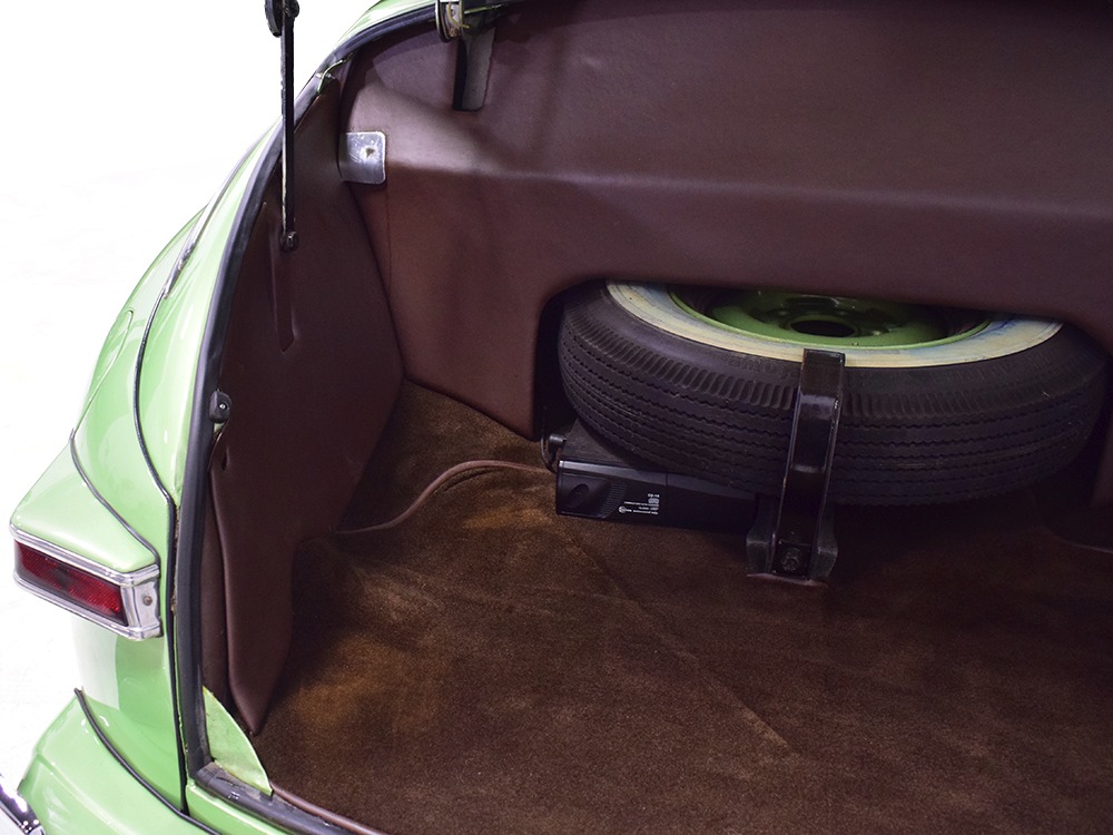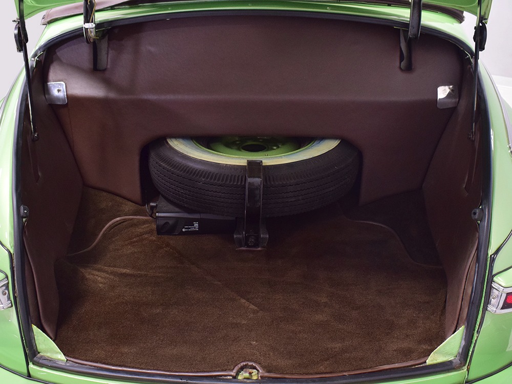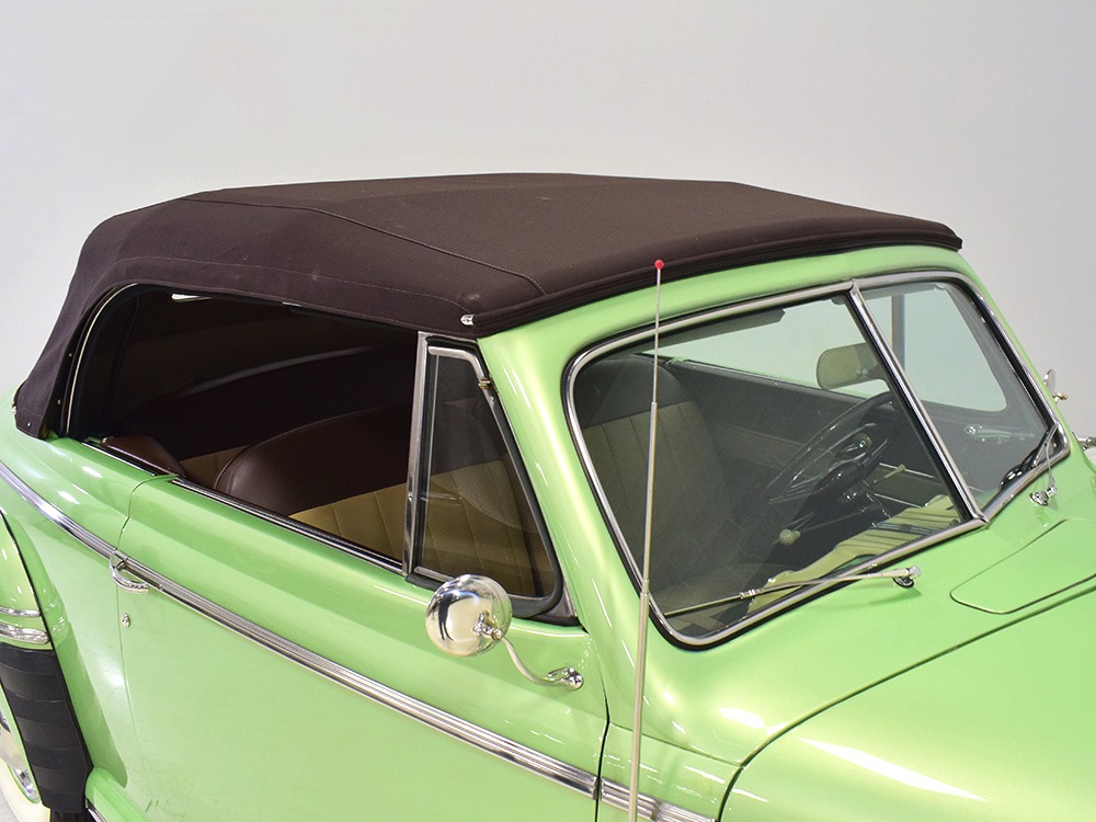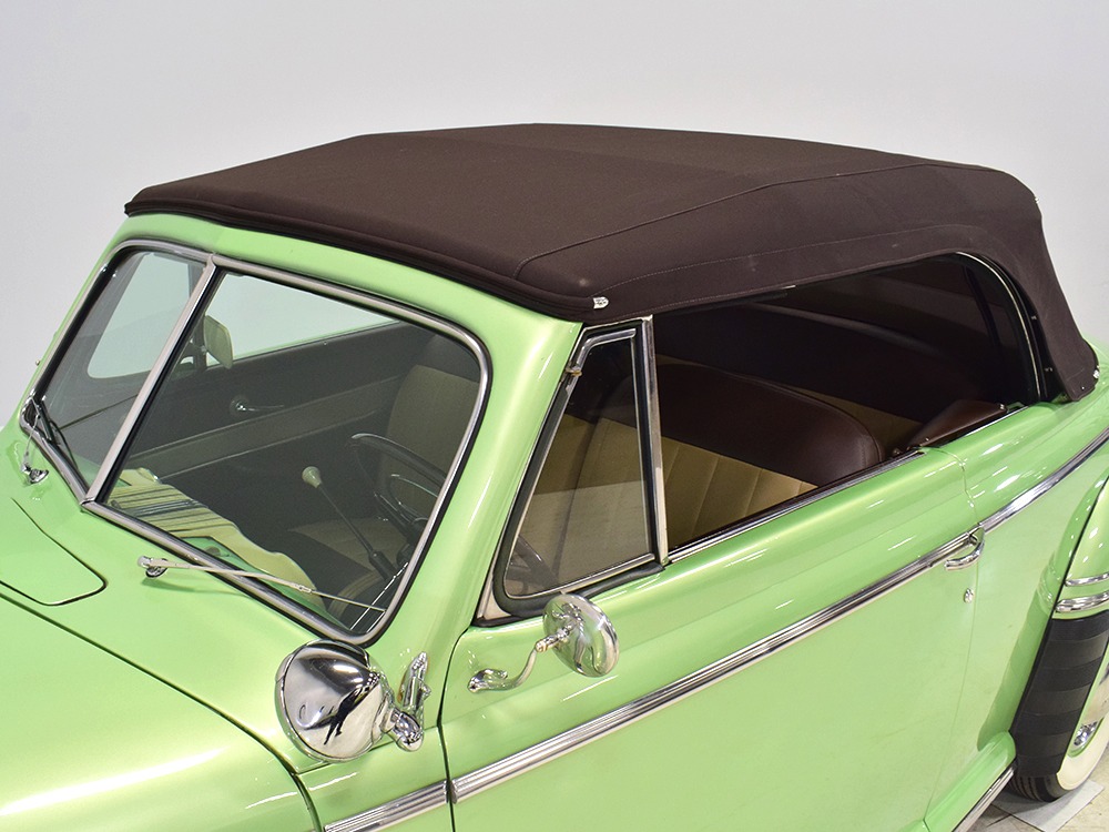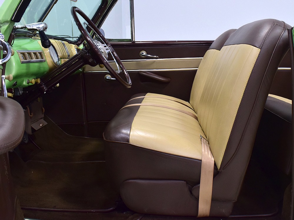 The two-tone interior was freshened using soft leather instead of the original vinyl, and it makes a difference from the moment you slide behind the wheel. The handsome seat covers were custom made to match the original look and there’s new padding underneath so it’s comfortable for long drives. Matching door panels in the original style were created at the same time and there are fresh carpets and mats on the floor, all bound to look like they were born there. The dash was obviously repainted to match the bodywork and retains its original plastic moldings and original gauges, all of which are operational. The electrical system has been converted to 12 volts so things like the wipers and radio have been updated in the interest of making driving a bit safer and more interesting, and we like that they worked hard to retain things like the accessory under-dash heater. Overhead there’s a beautifully made canvas convertible top, and it folds easily with a touch of a knob under the dash then stashes under a matching vinyl boot. The trunk is trimmed to match the interior, with new bulkheads and carpets, as well as a matching full-sized spare tire that’s never been used and a remote CD changer. Nice!