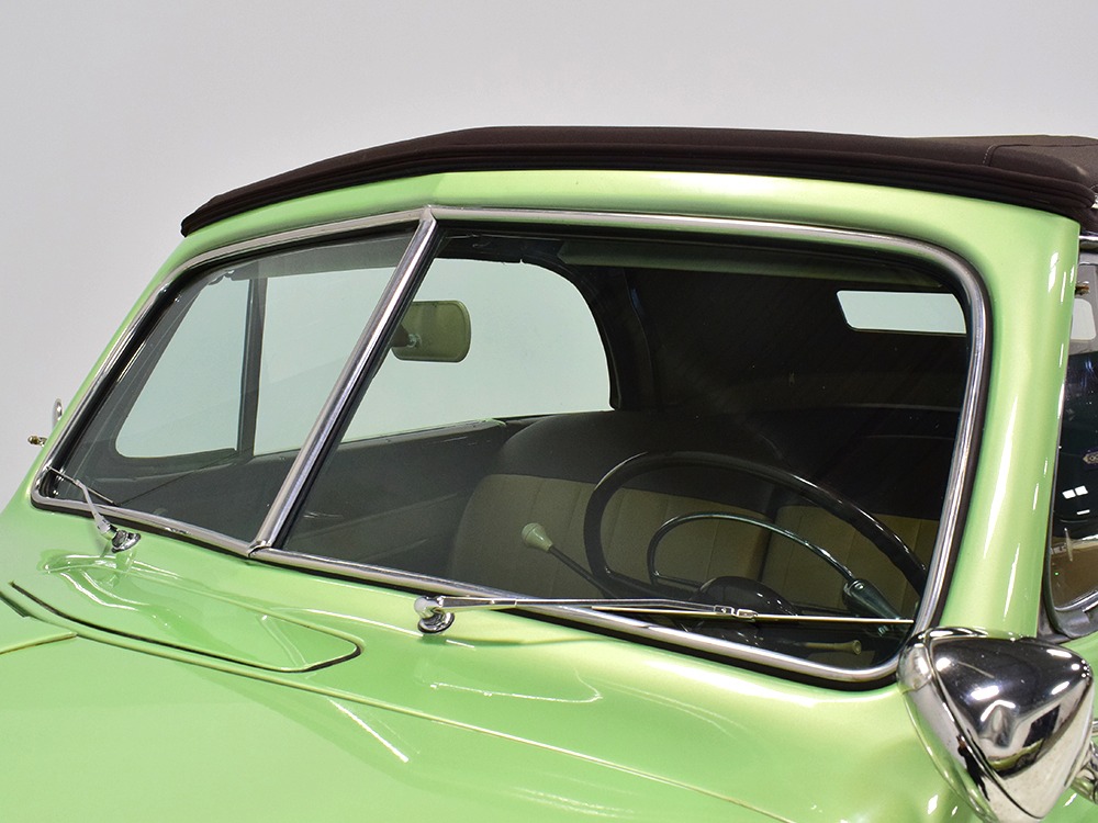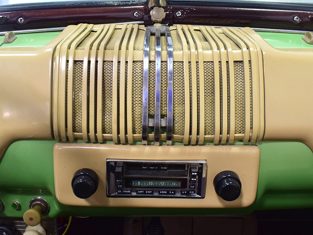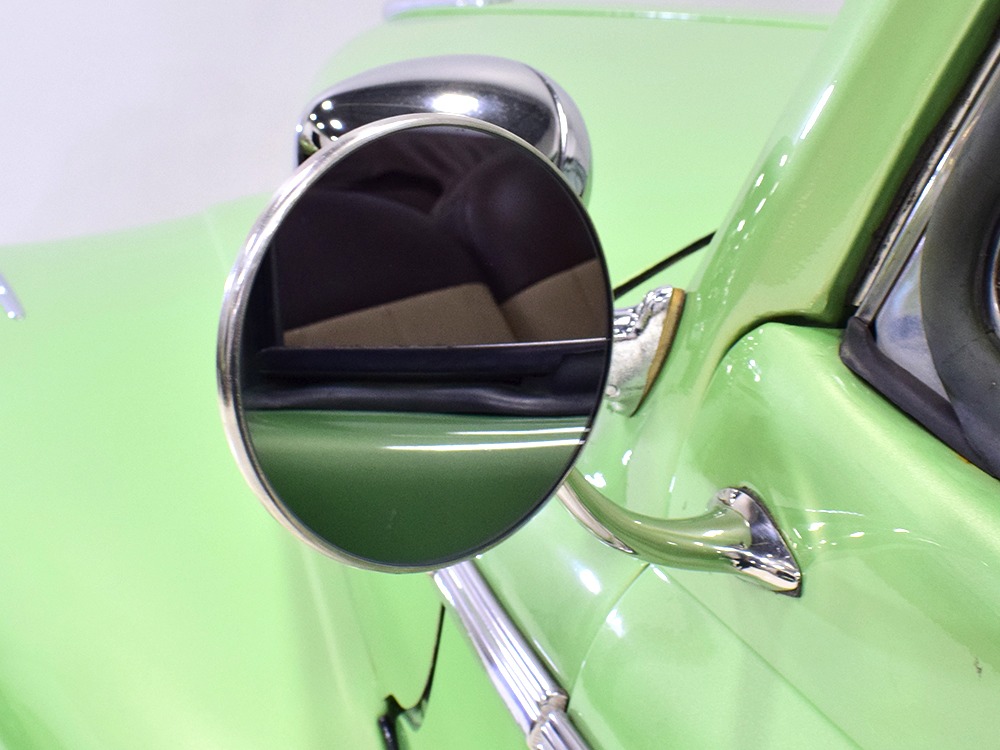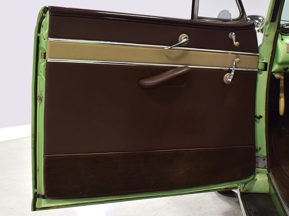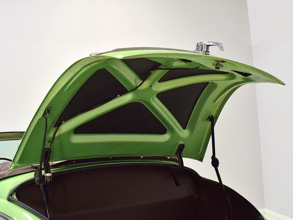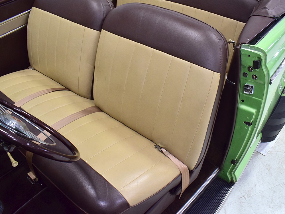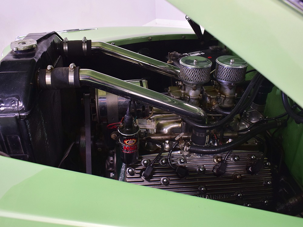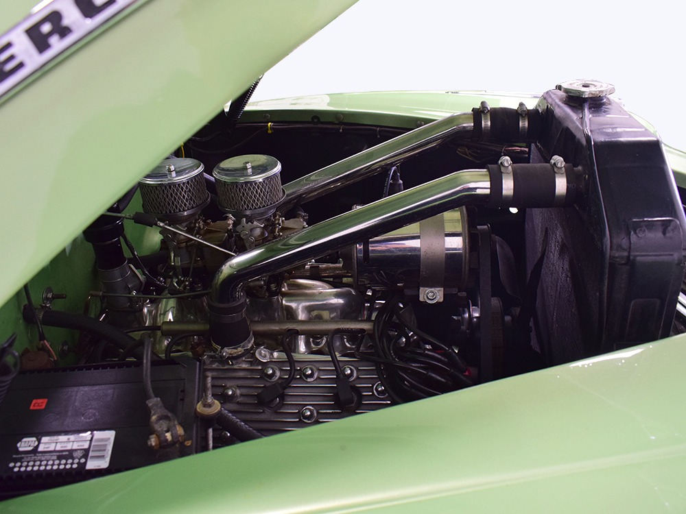 The two-tone interior was freshened using soft leather instead of the original vinyl, and it makes a difference from the moment you slide behind the wheel. The handsome seat covers were custom made to match the original look and there’s new padding underneath so it’s comfortable for long drives. Matching door panels in the original style were created at the same time and there are fresh carpets and mats on the floor, all bound to look like they were born there. The dash was obviously repainted to match the bodywork and retains its original plastic moldings and original gauges, all of which are operational. The electrical system has been converted to 12 volts so things like the wipers and radio have been updated in the interest of making driving a bit safer and more interesting, and we like that they worked hard to retain things like the accessory under-dash heater. Overhead there’s a beautifully made canvas convertible top, and it folds easily with a touch of a knob under the dash then stashes under a matching vinyl boot. The trunk is trimmed to match the interior, with new bulkheads and carpets, as well as a matching full-sized spare tire that’s never been used and a remote CD changer. Nice!