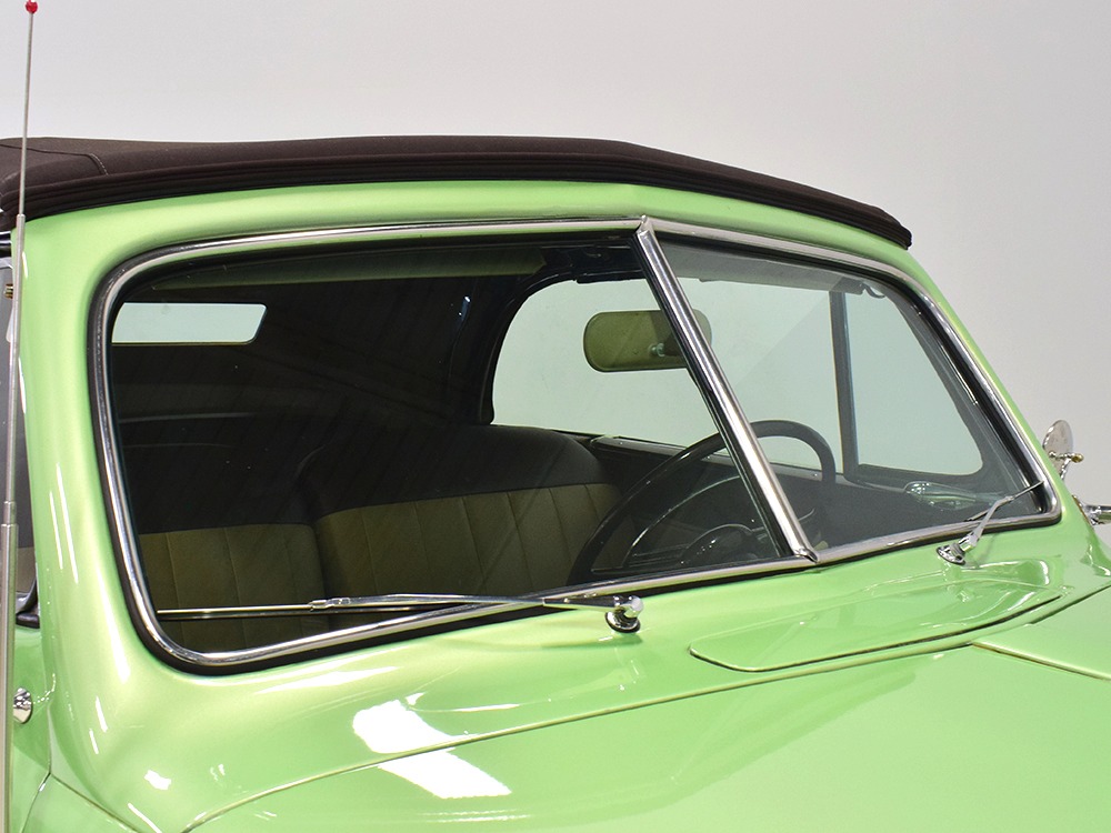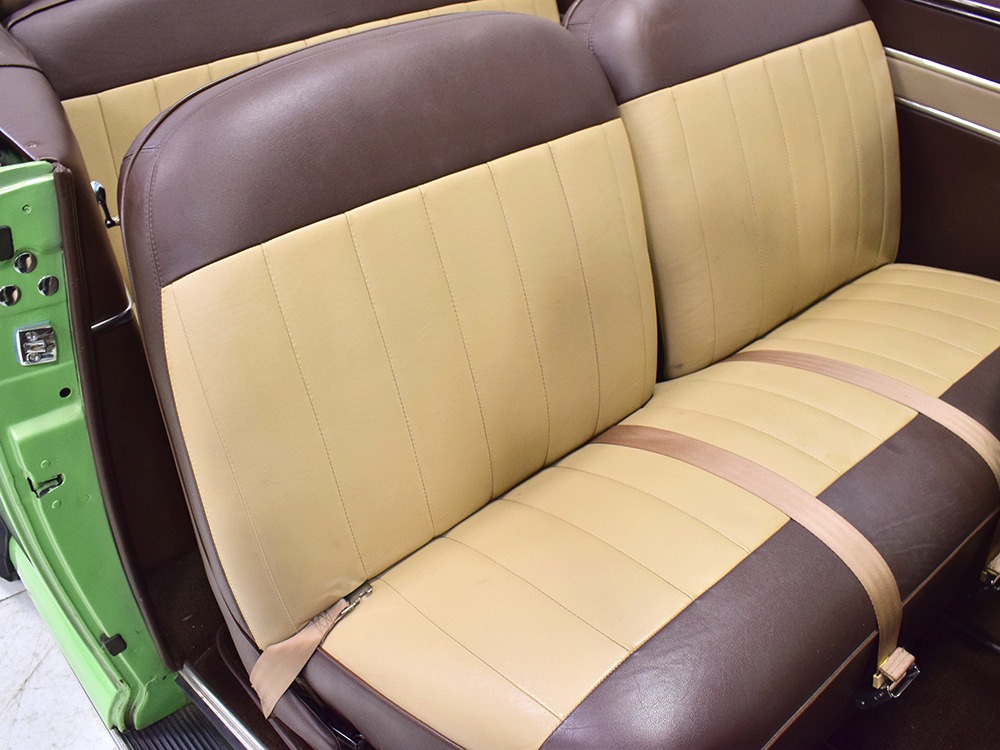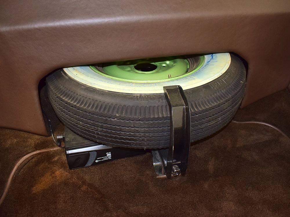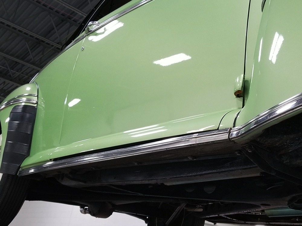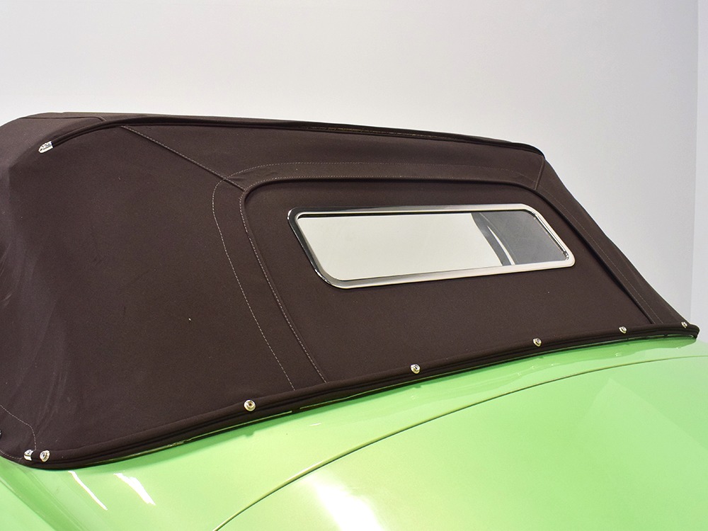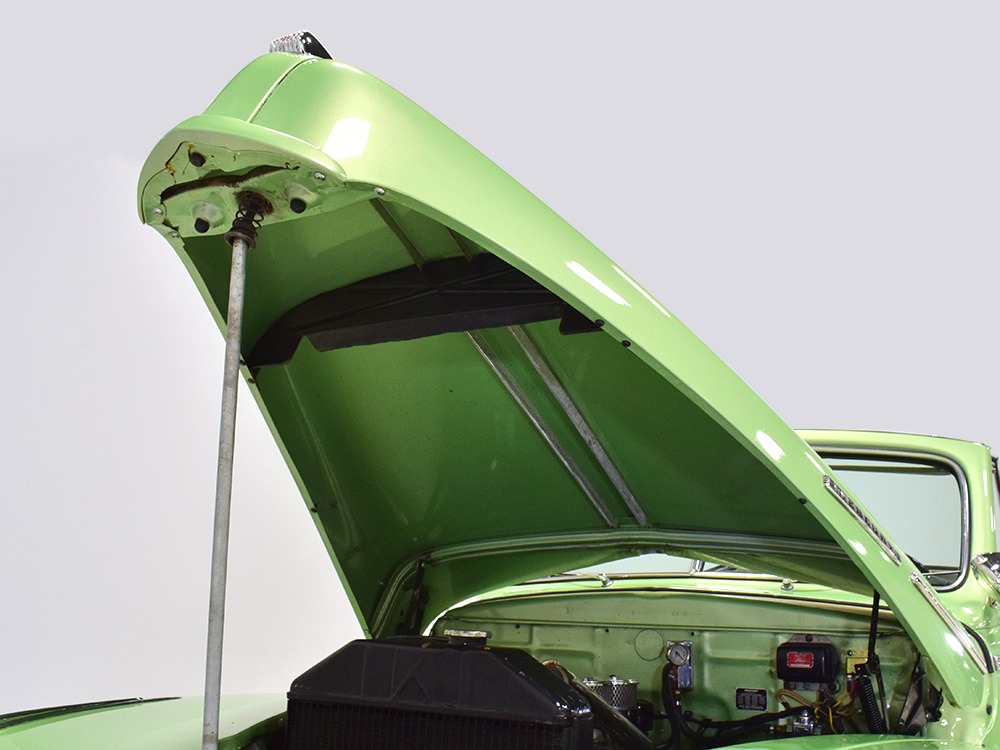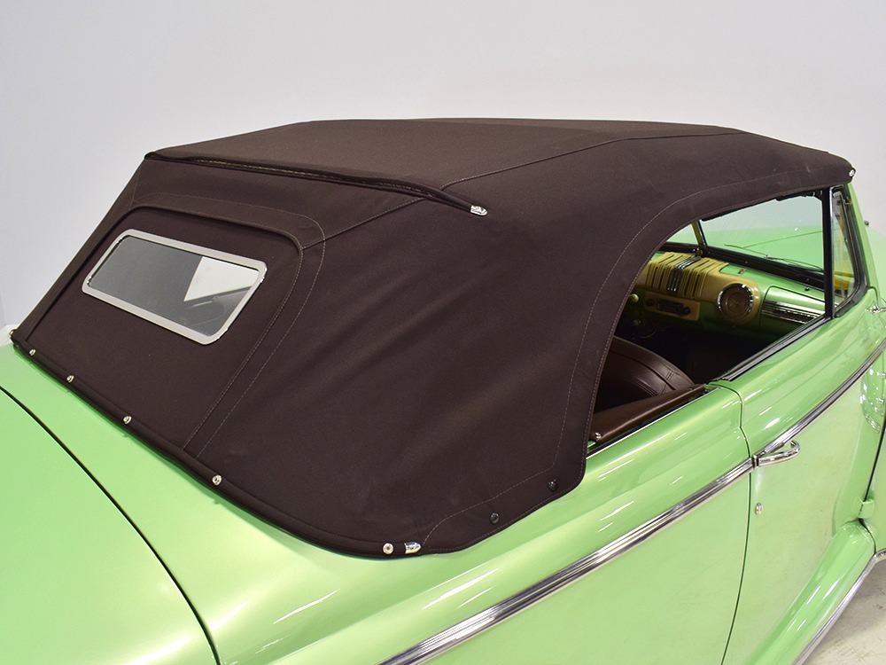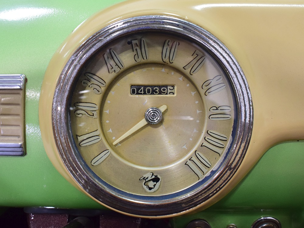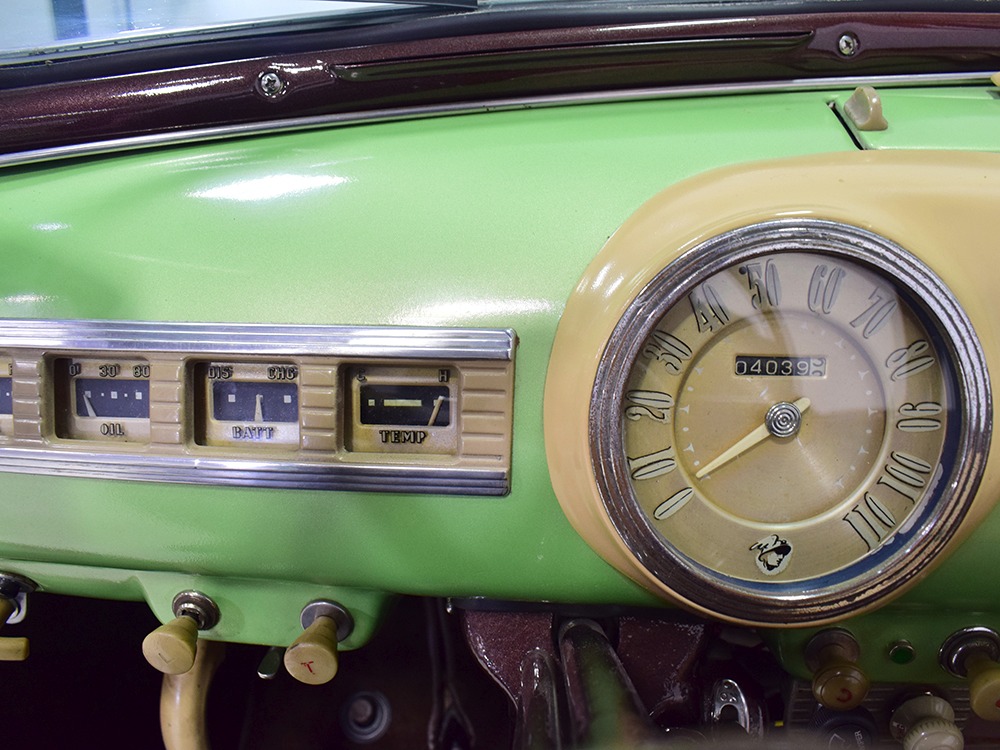 The two-tone interior was freshened using soft leather instead of the original vinyl, and it makes a difference from the moment you slide behind the wheel. The handsome seat covers were custom made to match the original look and there’s new padding underneath so it’s comfortable for long drives. Matching door panels in the original style were created at the same time and there are fresh carpets and mats on the floor, all bound to look like they were born there. The dash was obviously repainted to match the bodywork and retains its original plastic moldings and original gauges, all of which are operational. The electrical system has been converted to 12 volts so things like the wipers and radio have been updated in the interest of making driving a bit safer and more interesting, and we like that they worked hard to retain things like the accessory under-dash heater. Overhead there’s a beautifully made canvas convertible top, and it folds easily with a touch of a knob under the dash then stashes under a matching vinyl boot. The trunk is trimmed to match the interior, with new bulkheads and carpets, as well as a matching full-sized spare tire that’s never been used and a remote CD changer. Nice!
