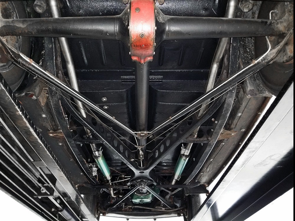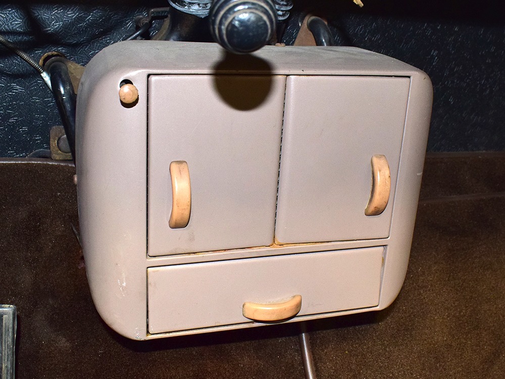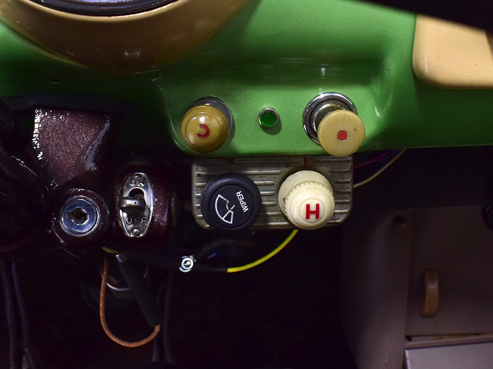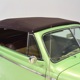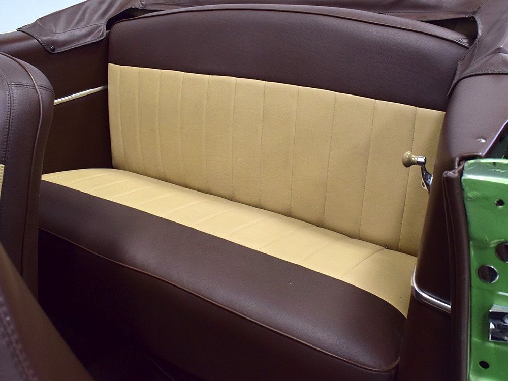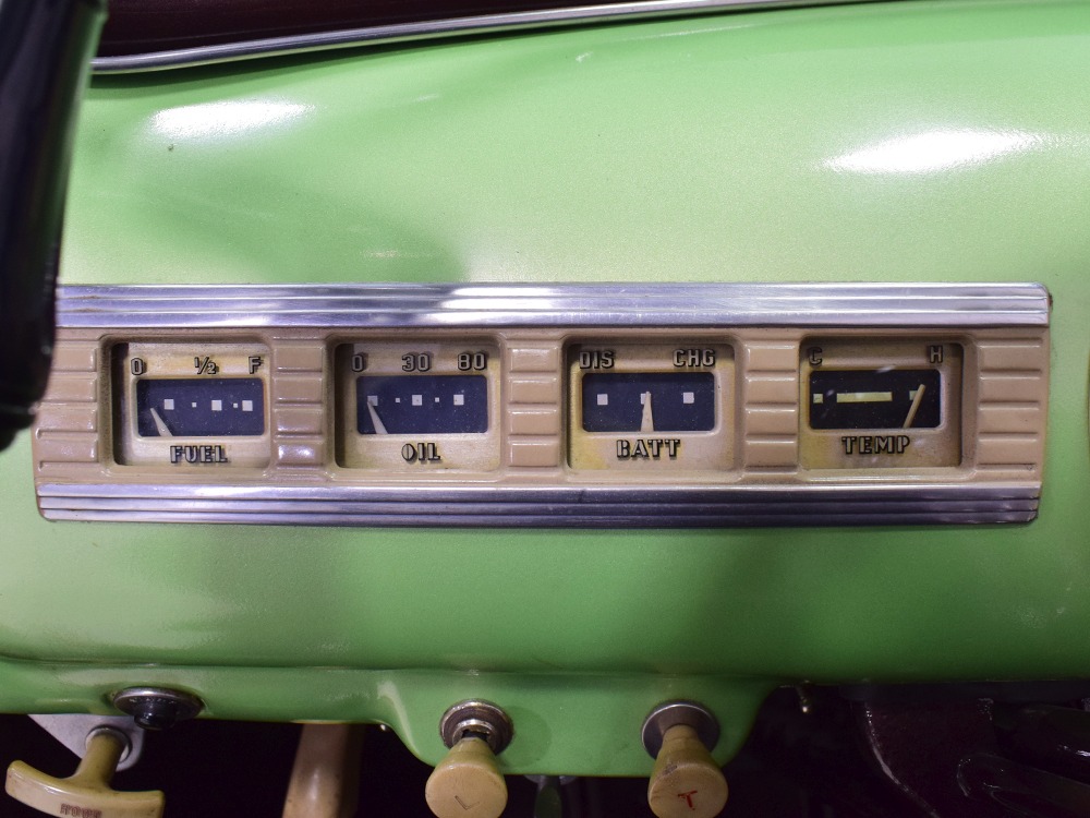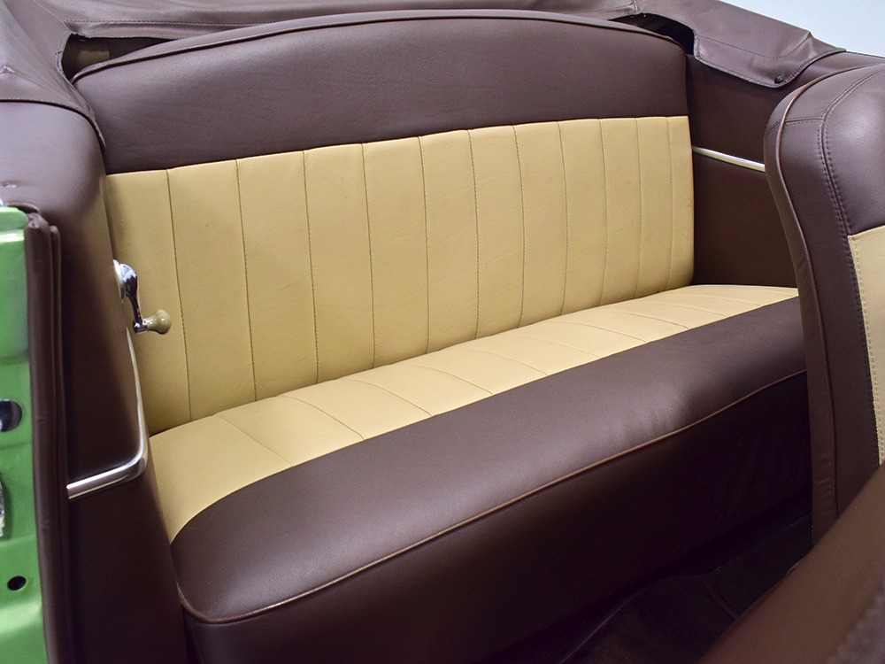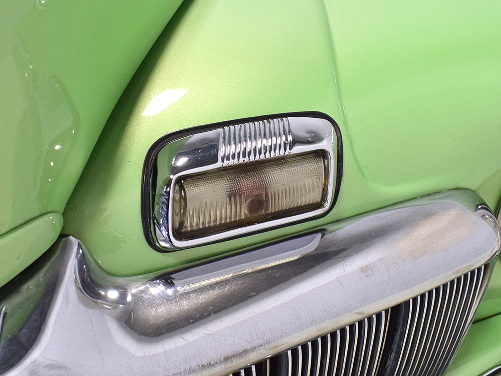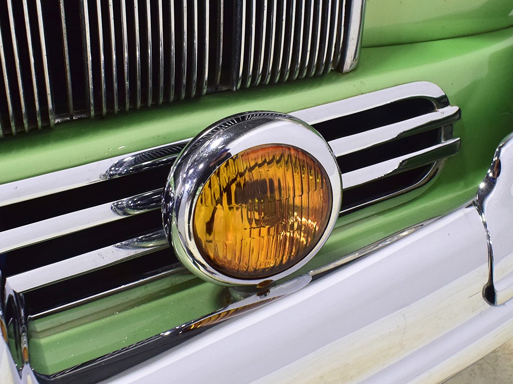 The two-tone interior was freshened using soft leather instead of the original vinyl, and it makes a difference from the moment you slide behind the wheel. The handsome seat covers were custom made to match the original look and there’s new padding underneath so it’s comfortable for long drives. Matching door panels in the original style were created at the same time and there are fresh carpets and mats on the floor, all bound to look like they were born there. The dash was obviously repainted to match the bodywork and retains its original plastic moldings and original gauges, all of which are operational. The electrical system has been converted to 12 volts so things like the wipers and radio have been updated in the interest of making driving a bit safer and more interesting, and we like that they worked hard to retain things like the accessory under-dash heater. Overhead there’s a beautifully made canvas convertible top, and it folds easily with a touch of a knob under the dash then stashes under a matching vinyl boot. The trunk is trimmed to match the interior, with new bulkheads and carpets, as well as a matching full-sized spare tire that’s never been used and a remote CD changer. Nice!