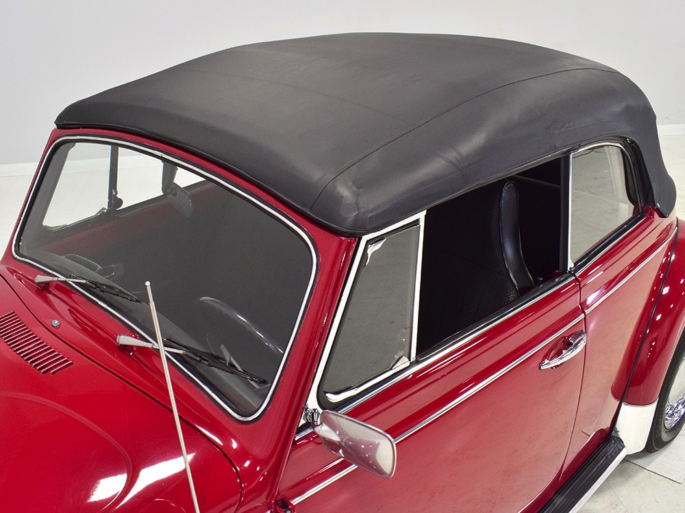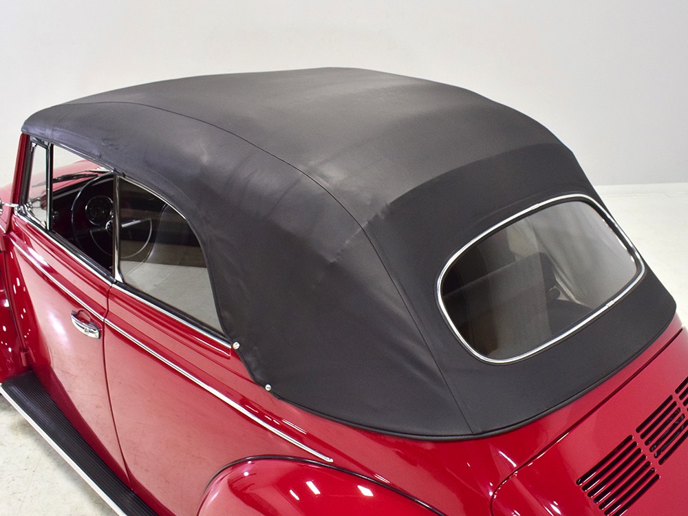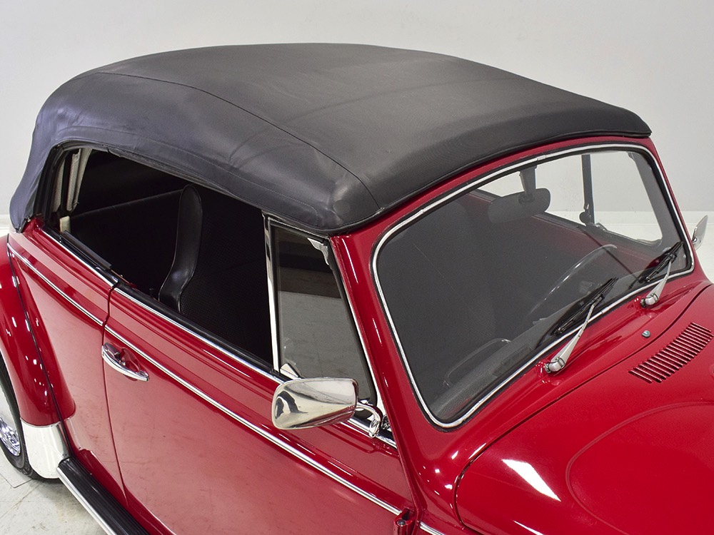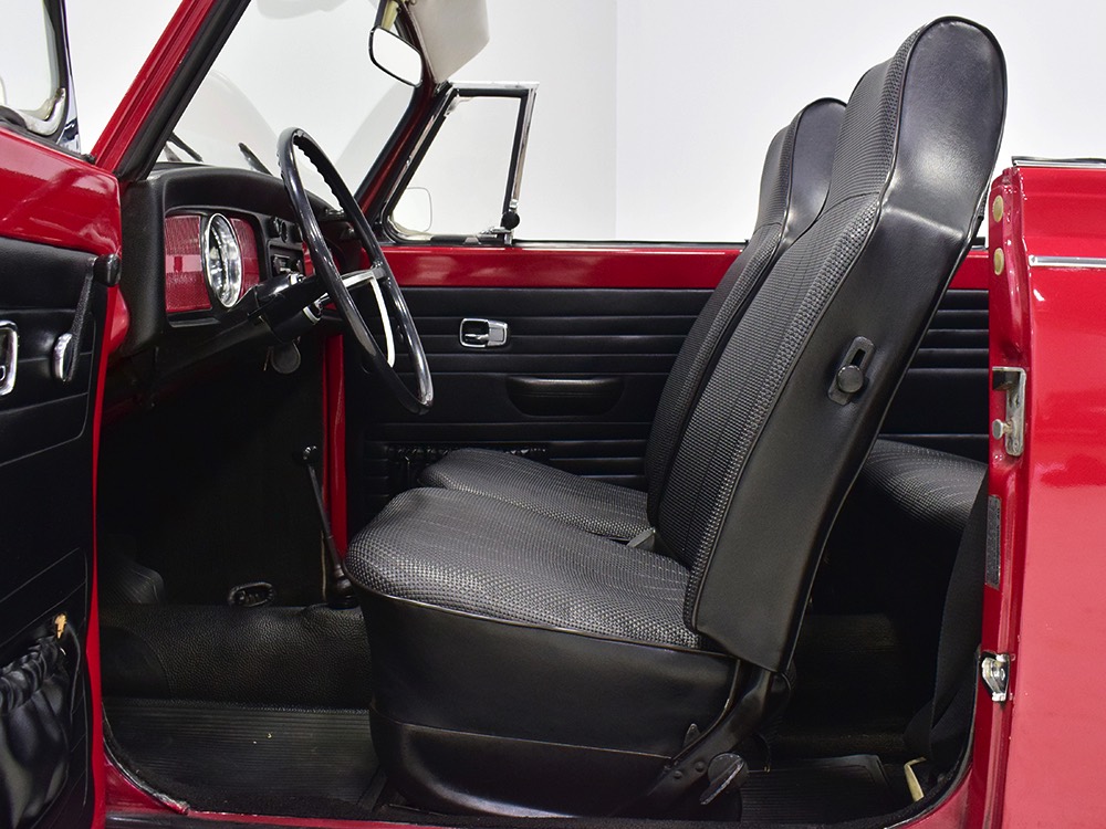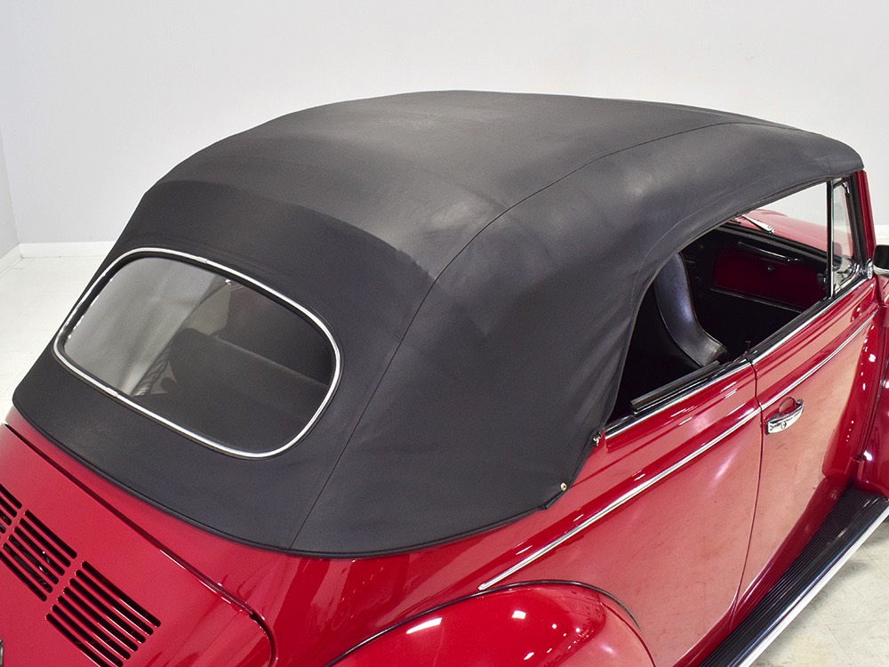 The black vinyl interior is recent and quite correctly done. New seat covers use proper textured vinyl to help make them a bit more comfortable on warm days and the firm padding underneath feels great when you’re behind the wheel. There are also new black rubber floor mats, matching door panels, and the most crisply rendered speedometer we’ve ever seen—it’s just beautiful. The big steering wheel features the Wolfsburg logo on the horn button, a nod to VW’s home town. The original AM radio is still in the dash and the familiar 4-speed manual shifter juts out of the transmission tunnel without any fanfare. Rear seat accommodations are actually comfortable for real-sized adults, making this an old car that’s surprisingly practical in today’s world. The heavily insulated convertible top is new, too, and lives under a custom-made black canvas boot that’s a nice upgrade over the original vinyl. The forward trunk compartment is full carpeted and quite nicely finished, and includes what appears to be an original spare tire complete with the unique air pressure system for the windshield washers.