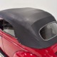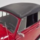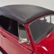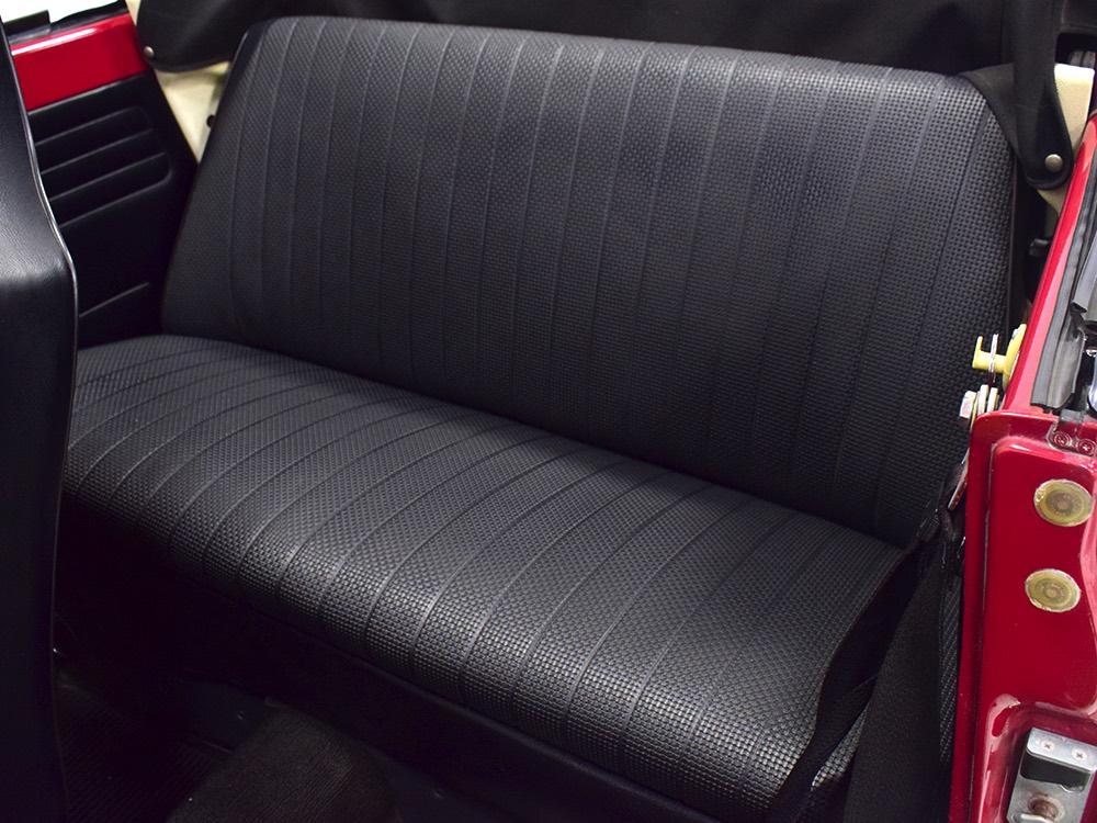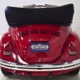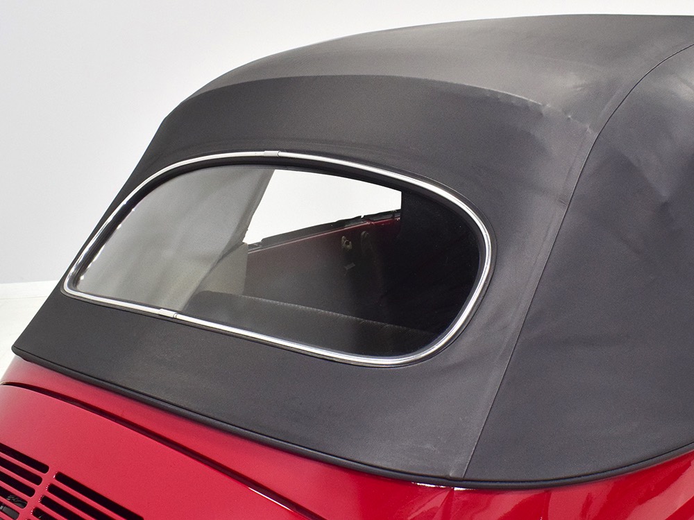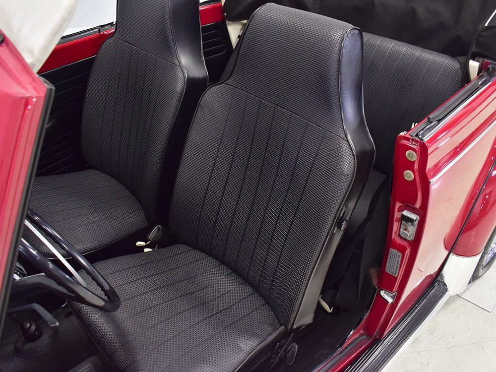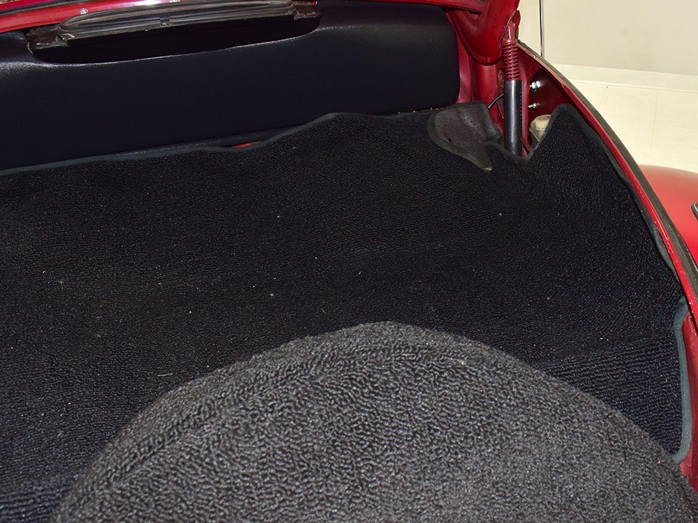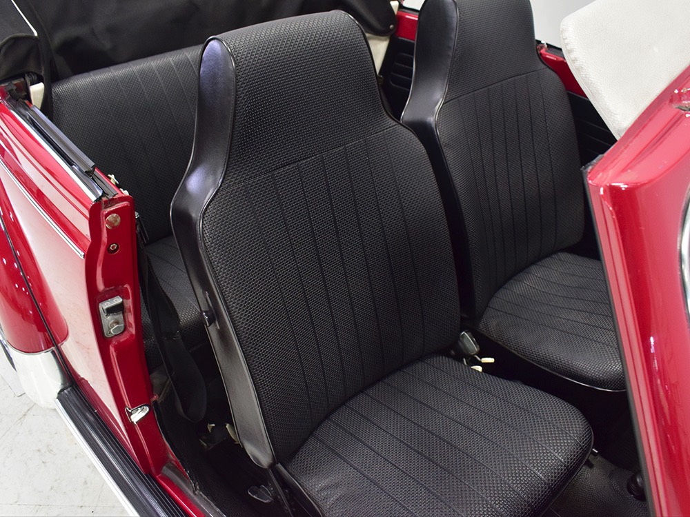 The black vinyl interior is recent and quite correctly done. New seat covers use proper textured vinyl to help make them a bit more comfortable on warm days and the firm padding underneath feels great when you’re behind the wheel. There are also new black rubber floor mats, matching door panels, and the most crisply rendered speedometer we’ve ever seen—it’s just beautiful. The big steering wheel features the Wolfsburg logo on the horn button, a nod to VW’s home town. The original AM radio is still in the dash and the familiar 4-speed manual shifter juts out of the transmission tunnel without any fanfare. Rear seat accommodations are actually comfortable for real-sized adults, making this an old car that’s surprisingly practical in today’s world. The heavily insulated convertible top is new, too, and lives under a custom-made black canvas boot that’s a nice upgrade over the original vinyl. The forward trunk compartment is full carpeted and quite nicely finished, and includes what appears to be an original spare tire complete with the unique air pressure system for the windshield washers.