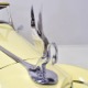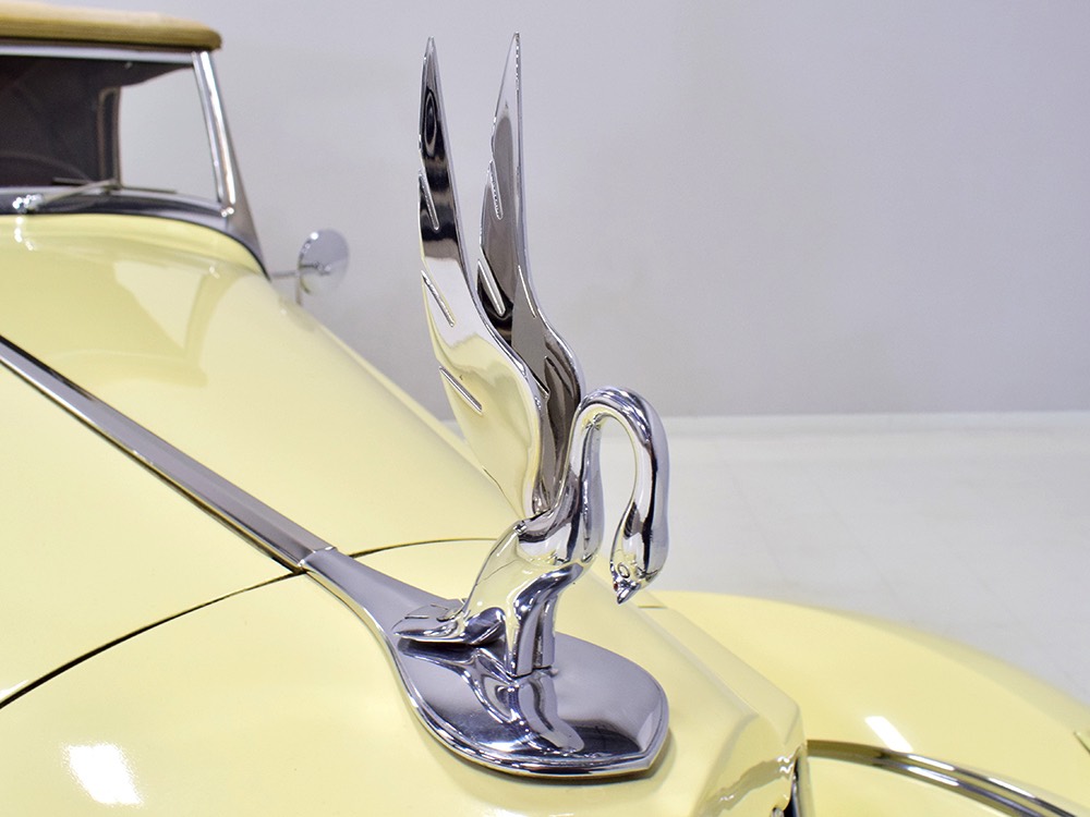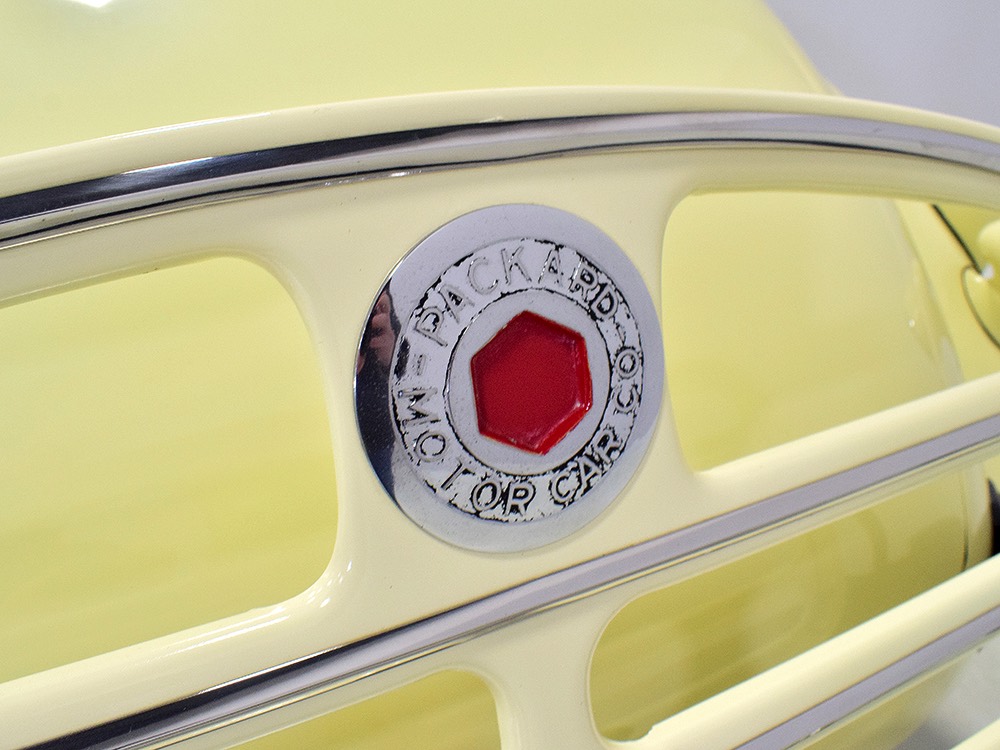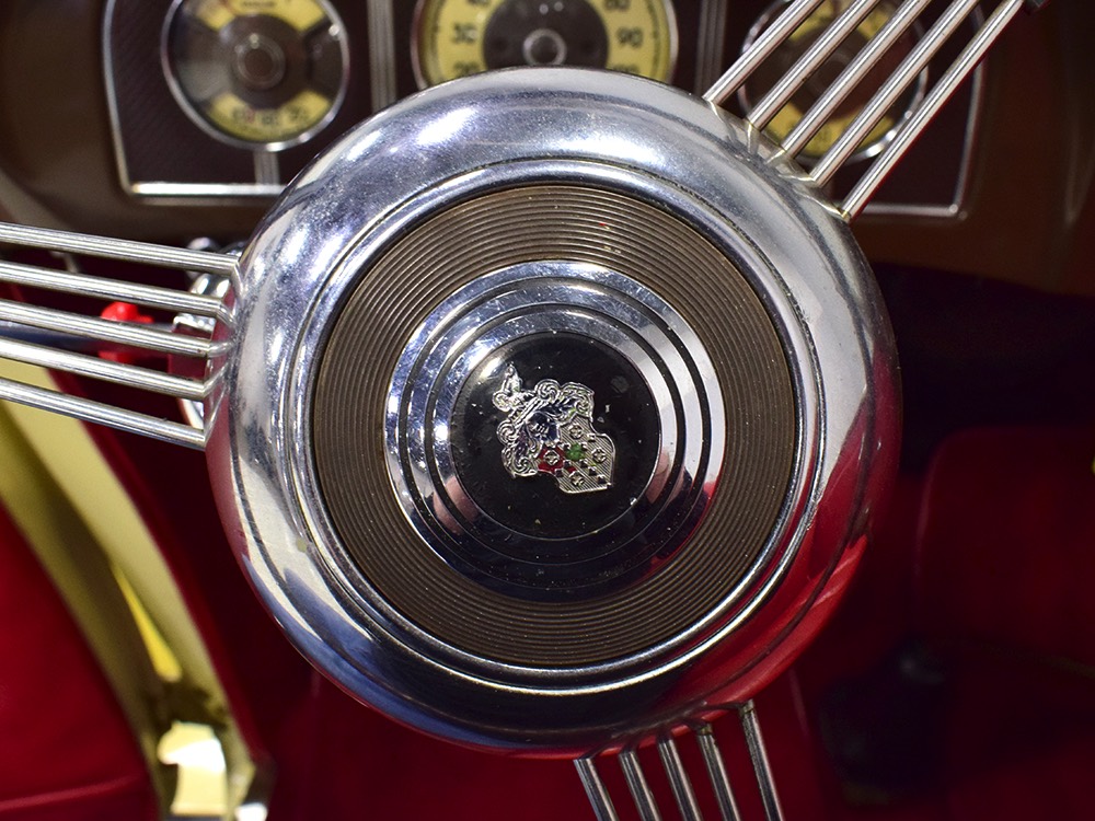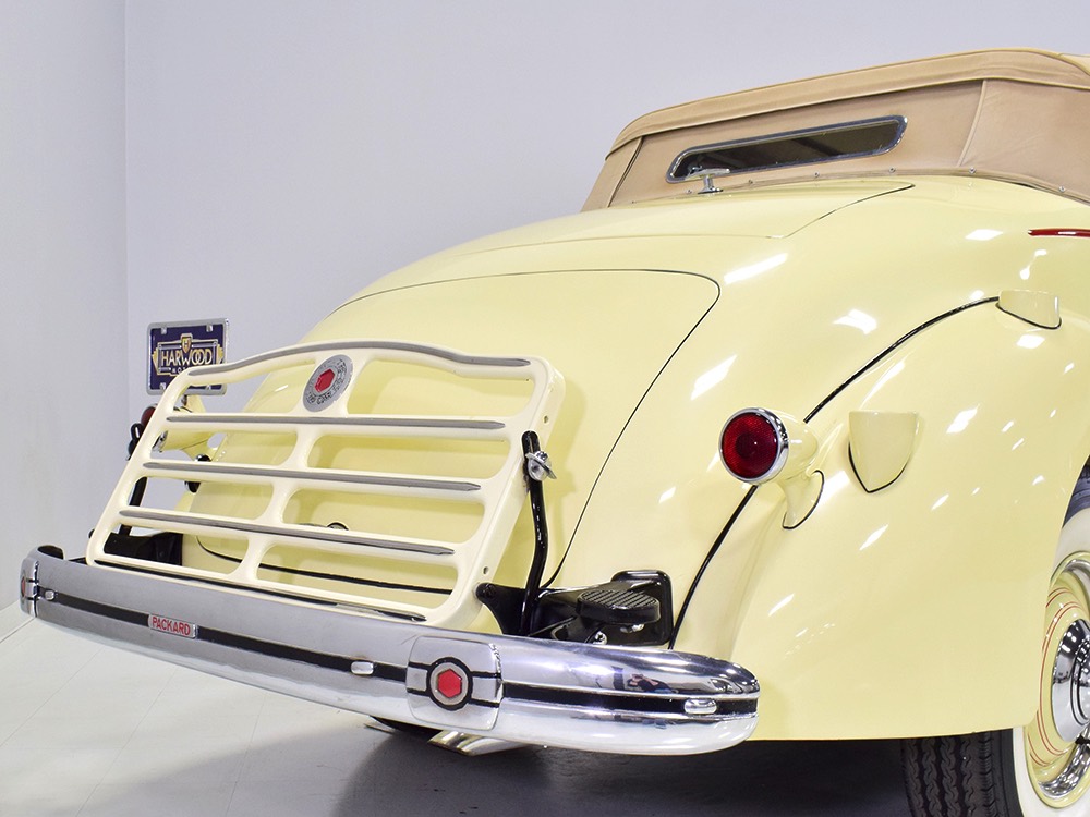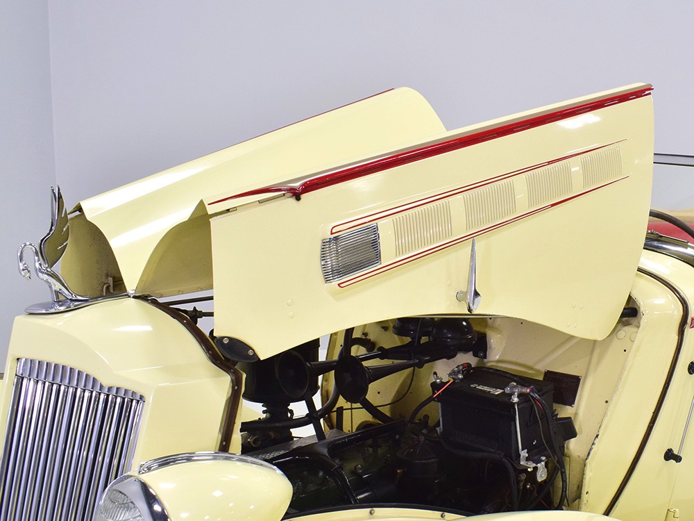 It would be a mistake to dismiss this gorgeous convertible because it's a "junior" Packard. The same quality, the same engineering, and the same look as the senior Packards make this 120 an extremely appealing car. Rumble seats were disappearing, but this one includes both a two-person rumble seat and a built-in trunk, so it's a surprisingly practical car for touring. Packard Cream was a popular color on these cars and it's exactly right—not yellow, not off-white, but a bold cream that stands out without being too dramatic about it. Red accents match the interior and trademark Packard hexagon emblems on the bumpers and hubcaps, and the familiar spear sweeping across the hood is finished in a darker tan just to add some interest. The restoration is probably 20 years old, but it is holding up remarkably well thanks to long-term care with a conscientious owner and his family, who continued to love and enjoy the car even after his passing. The paint shines up beautifully with only a few signs of use, the most noteworthy being a fingernail-sized chip on the inner edge of the left front fender—not really visible until you go looking for it and probably easy to touch up. You'll note that it has correct fender-mounted running lights, an accessory trunk rack out back, and the lovely Packard "cormorant" hood ornament leading the way. And yes, the view down the hood is as dramatic and wonderful as any of the more expensive models.