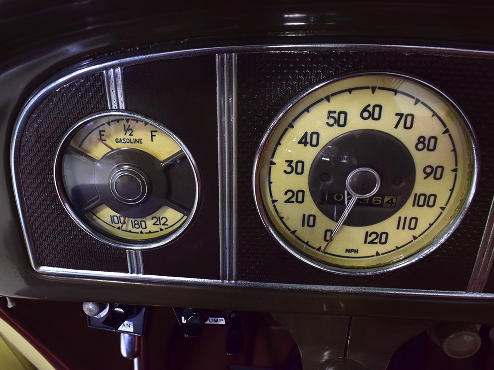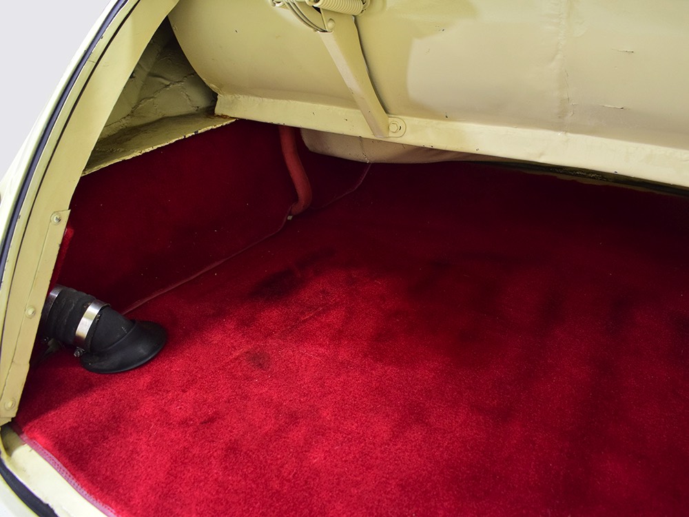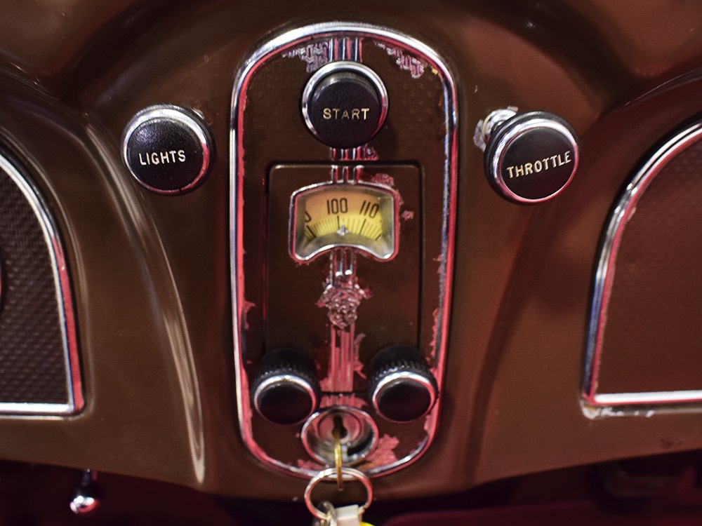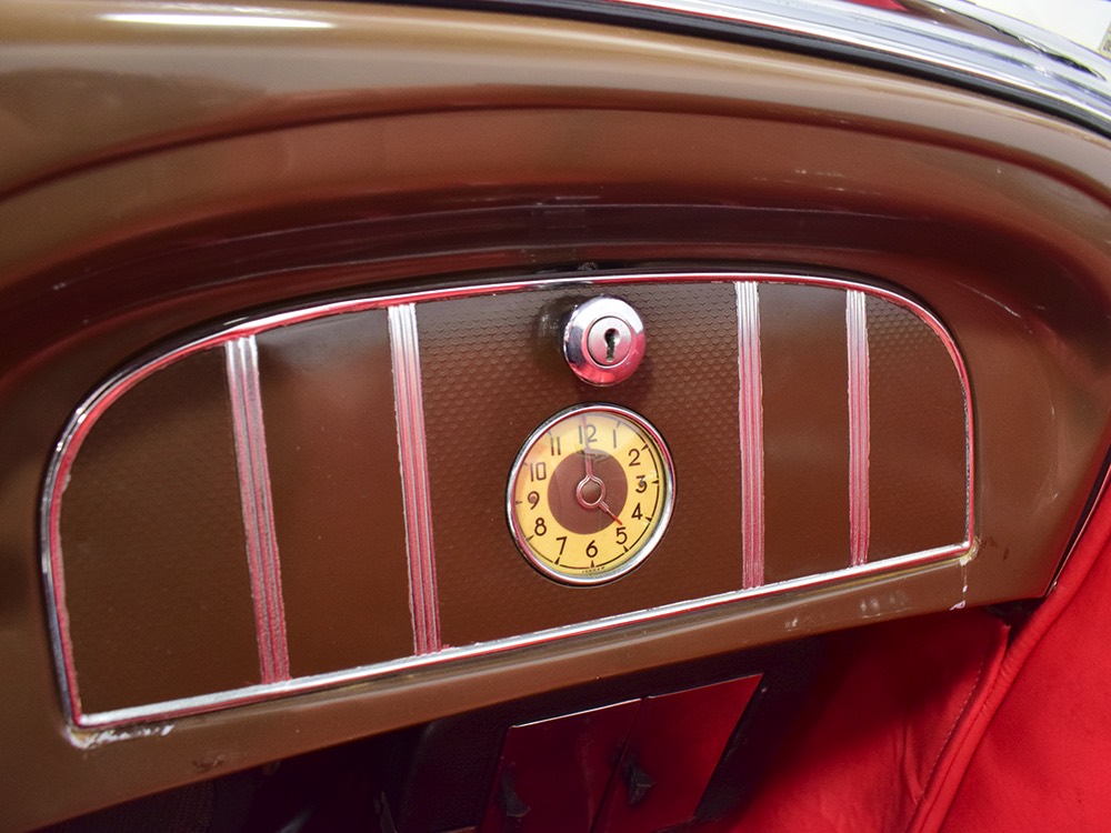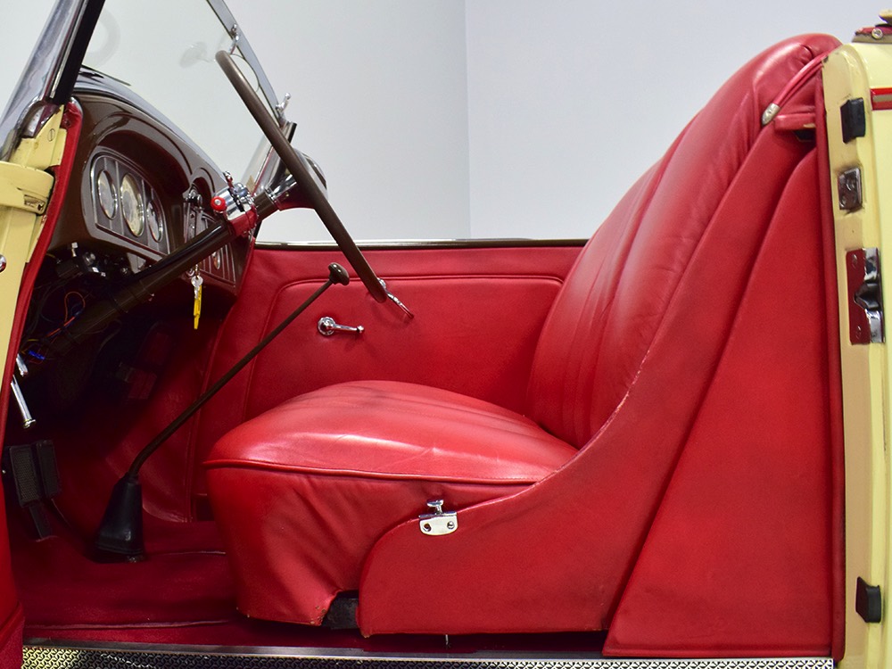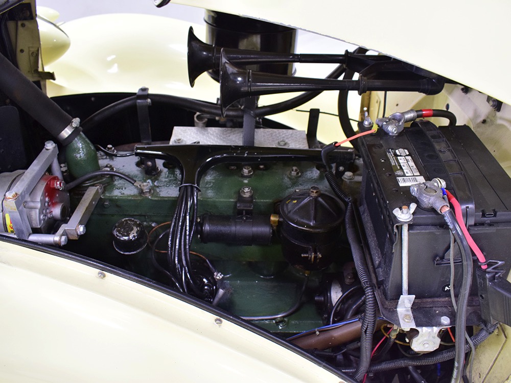 Two years ago, the interior was restored using beautiful bright red leather and it shows extremely well. From the properly stitched and stuffed seats to the simple door panels and appropriately plush carpets, this car feels luxurious from within. The big banjo-style wheel makes this car surprisingly easy to handle (it was driven regularly by the owner's widow and daughter) and you'll quickly feel at home once you hit the road. The cream-colored gauges are all operational even with the car's unorthodox electrical system (more on this in a moment) and the optional AM radio does power up but does not make sound. There's also a fully operational heater under the dash as well as a hand choke for starting. Other controls designed to make this car an ideal traveling partner are the column-mounted turn signals (which are somehow self-cancelling—how'd they do that?) along with switches for an electric fuel pump and pusher fan on the front of the radiator. We believe the 10,236 miles showing on the odometer are since the 1990s restoration was completed. There's a fair amount of adjustment built into the front seat to make it comfortable for drivers of just about any size and the rumble seat, once you're in there, is equally spacious. The tan convertible top folds easily once you know the tricks and in the down position, it sits so neatly that a boot probably isn't necessary. There's also a fully finished trunk ostensibly designed to hold a spare tire (which is included) but the brand new Diamondback Radials are slightly taller than the stock tires so the spare doesn't quite fit.