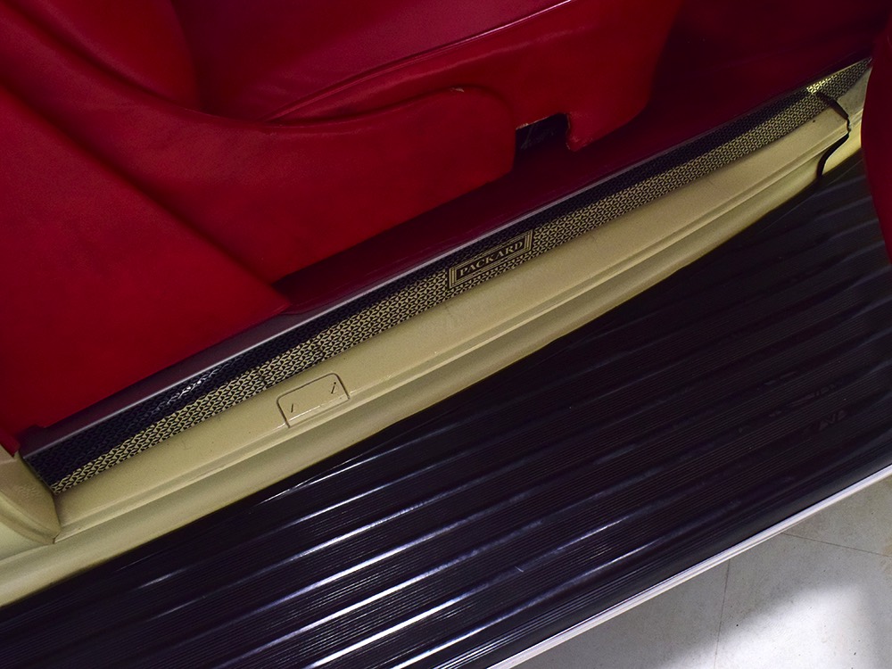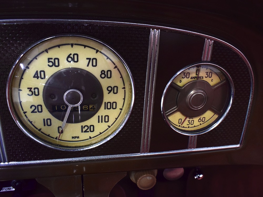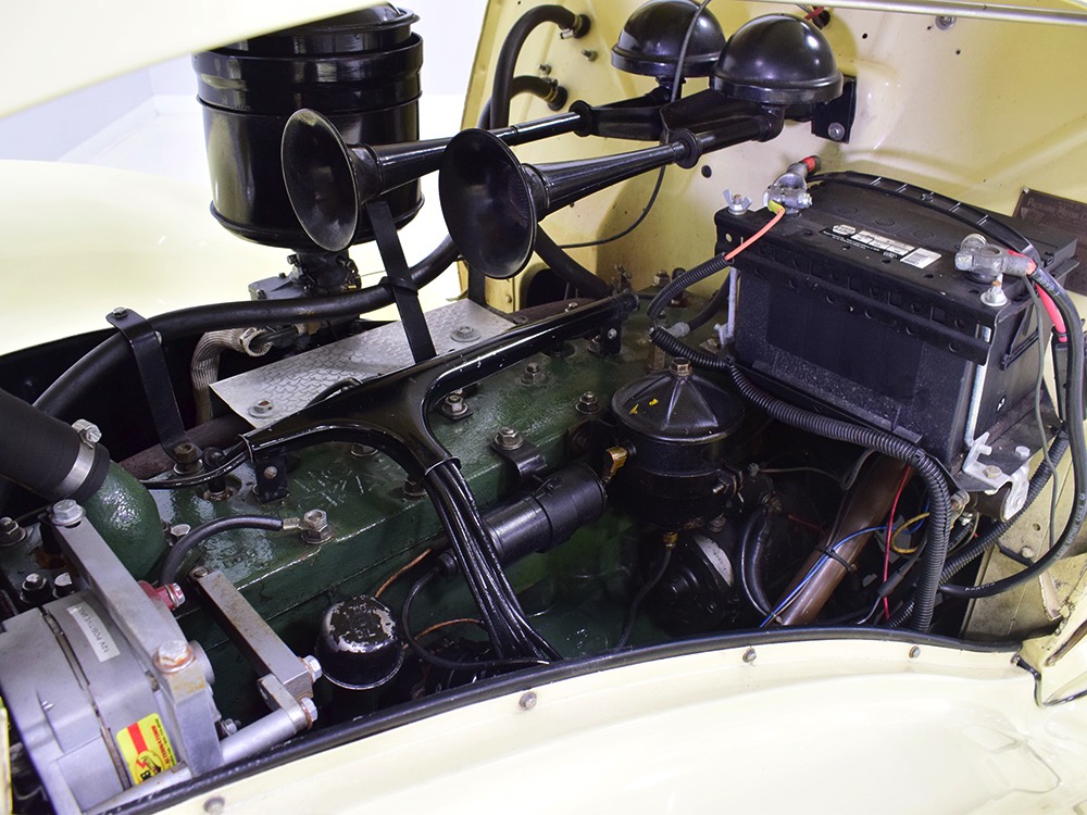 The 1936 120 straight-8 received a small bump in displacement to 282 cubic inches, which translated to a rather healthy 120 horsepower and a big swell of that famous Packard straight-8 torque. Rebuilt at the time of restoration, this one starts easily and runs beautifully, pulling the convertible coupe around with ease and making it almost entirely unnecessary to shift out of high gear at anything but a dead stop. You will note a modern alternator installed on the driver's side of the engine, along with a 12-volt battery mounted on the firewall, both of which were added to the car's electrical system a few years ago to improve starting and to power the aforementioned electric fan. However, the car is NOT as 12-volt conversion, as the original 6-volt generator, wiring, and battery (under the driver's seat) are still in place. In essence, it is running two separate, distinct electrical systems. That means all the gauges work properly, the accessories and lights are all correct, and it still feels like a 1936 automobile. It will start using the original START button on the dash (6V) OR using a separate button under the dash (12V), and we have to admit that using 12 volts, it fires almost instantly. Once it's running, the 6V ignition takes over and thanks to having both a generator and an alternator, both batteries are charged as it runs. It's a rather clever setup that eliminates the sins of a 12-volt conversion while keeping the advantages. Nice!