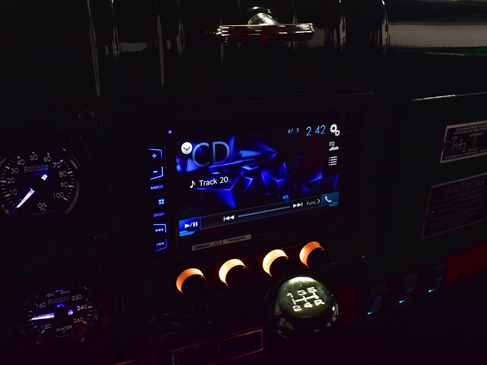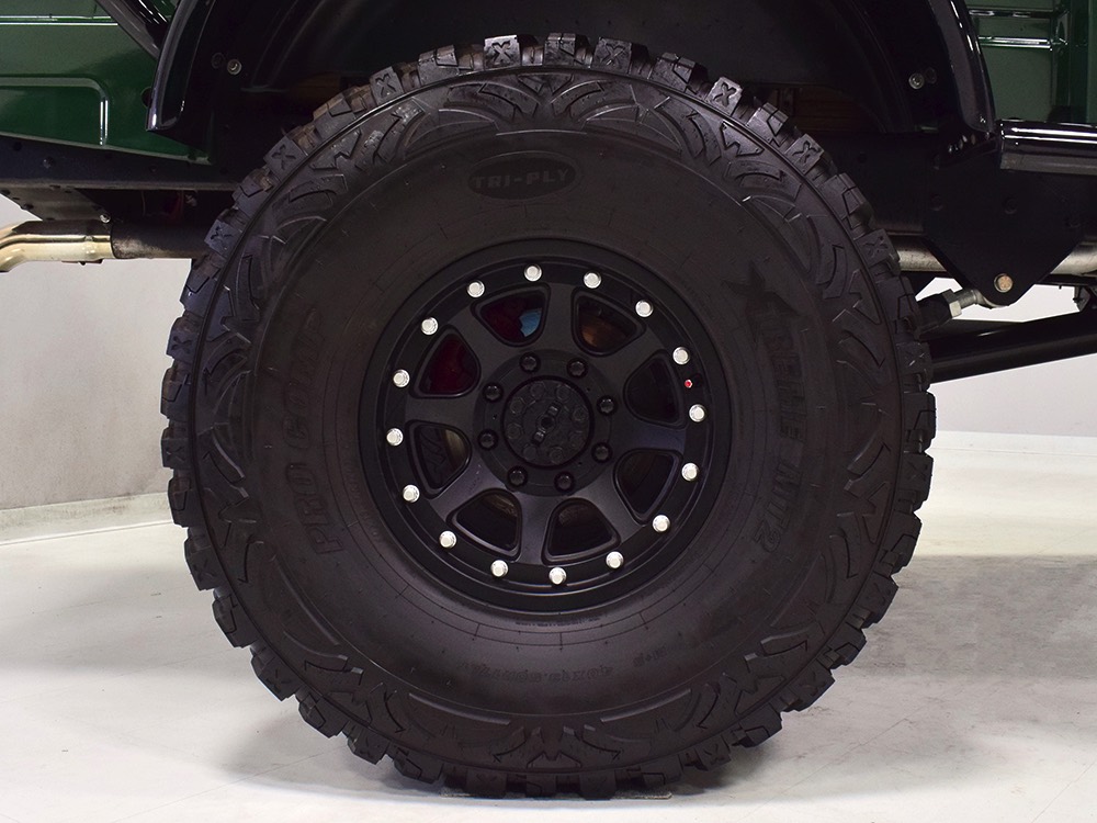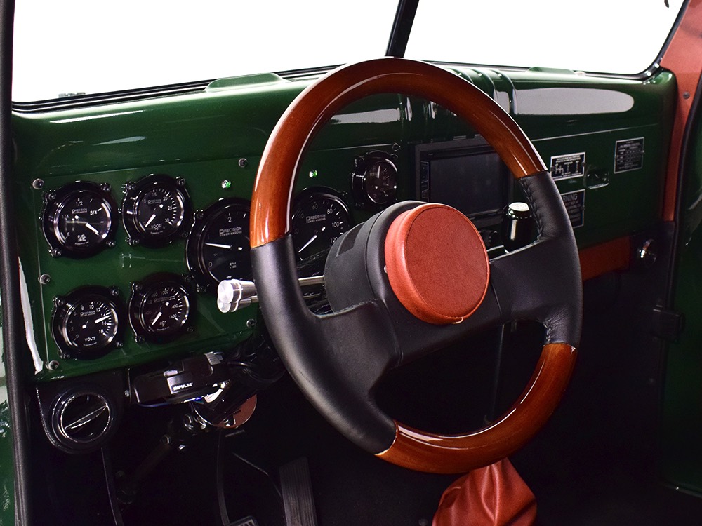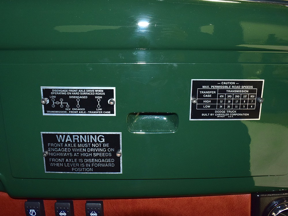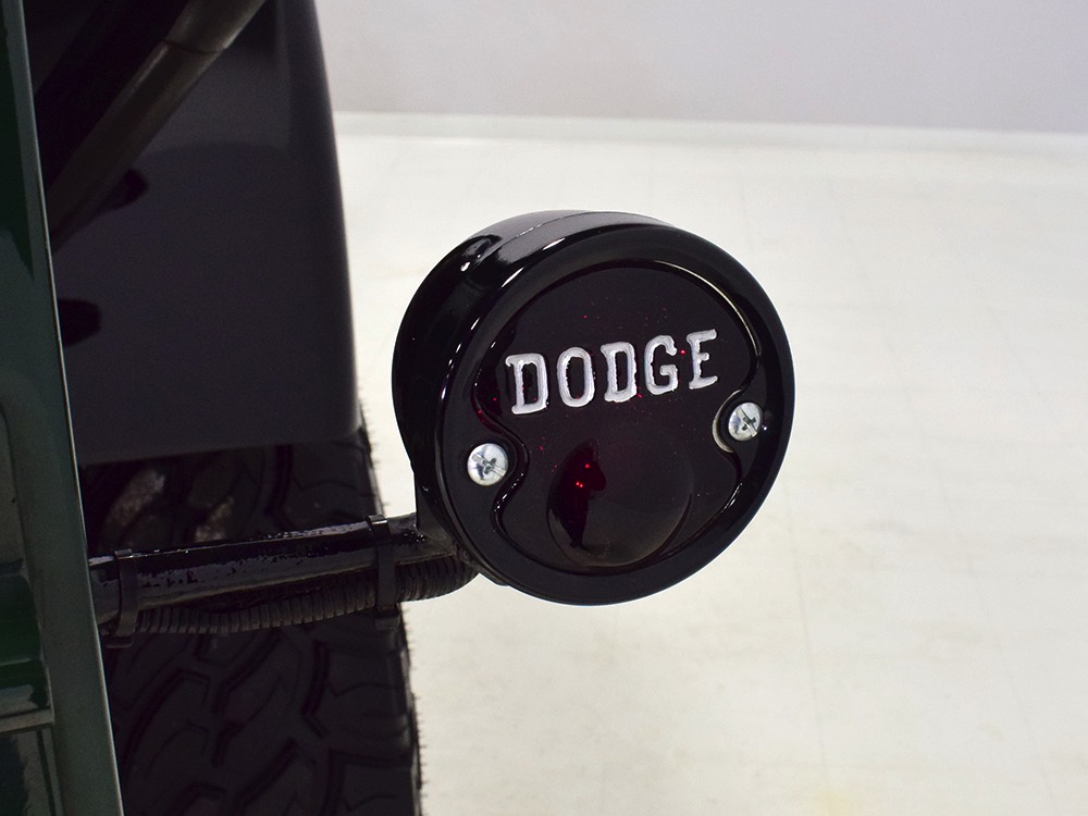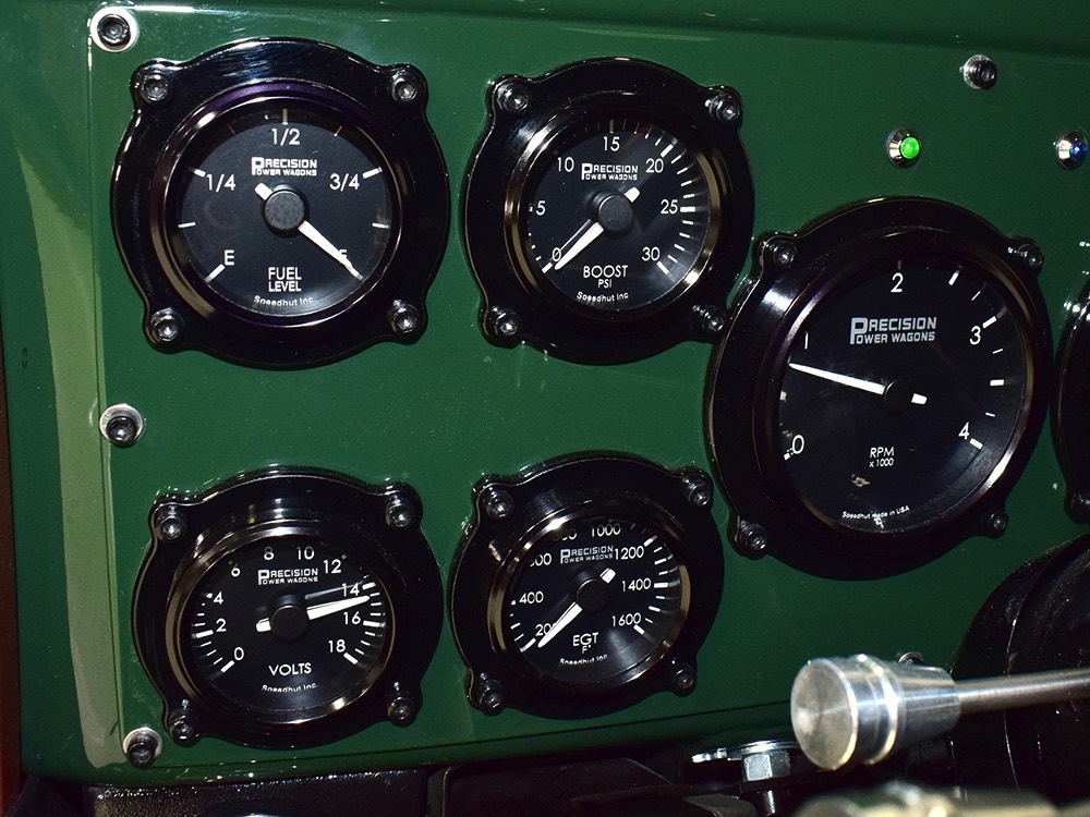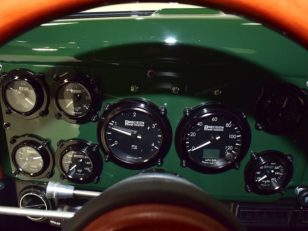It sits on a reinforced Power Wagon chassis, again to preserve the vintage feel which, after all, is the entire point. The 5-speed manual transmission shifts easily and clutch action is light, but the hardware is virtually indestructible. Oversized axles front and rear carry 4.56 gears, and with a deep overdrive 5th gear in the transmission, it cruises easily at 70 MPH. Obviously the rear suspension has been upgraded to coil springs with a 4-link to vastly improve ride quality and power steering is a very welcome addition. Gigantic 4-wheel disc brakes are more than adequate for the heavy but surprisingly fast Dodge, and thanks to careful tuning on the shocks and bushings, ride quality is excellent—a far cry from the spine-compressing original setup. There’s a PTO for the Braden 10,000 pound winch up front, which carries 200 feet of stainless cable and Precision’s signature red tow hook, and a rear-mounted winch with a remote control for the really rough stuff. It’s also built with an integrated Class IV receiver hitch with both 4-way and 7-way electrical connections and this truck will pull just about anything you can connect to it. A gigantic gas tank hangs under the bed and given the relative thrift of the diesel engine, it offers plenty of range for going to some really remote places. A full stainless steel exhaust system will last forever and custom powder-coated wheels carry mammoth 40x13.50R17 Super Comp off-road radials.
