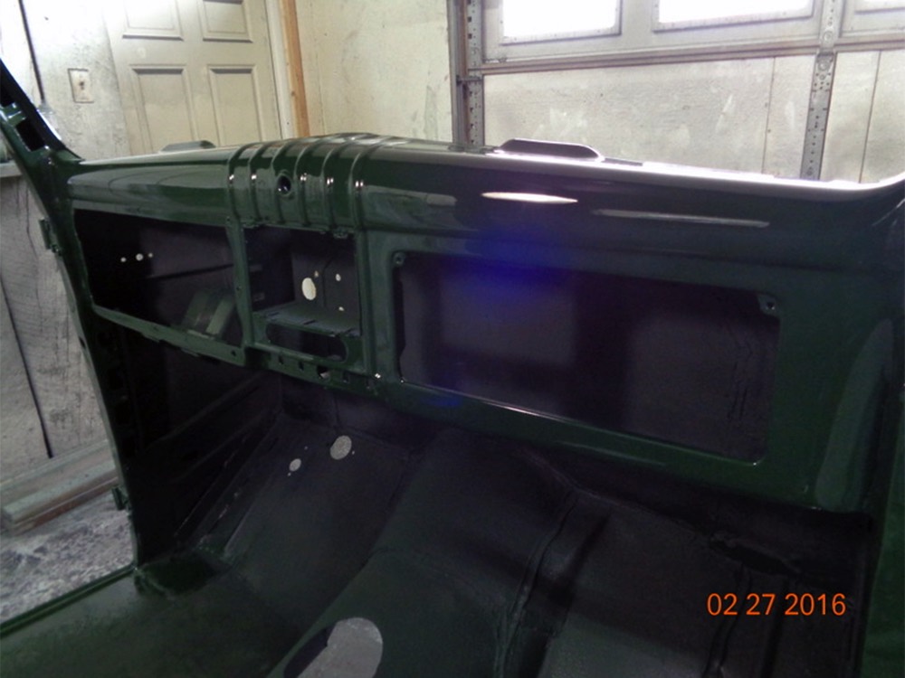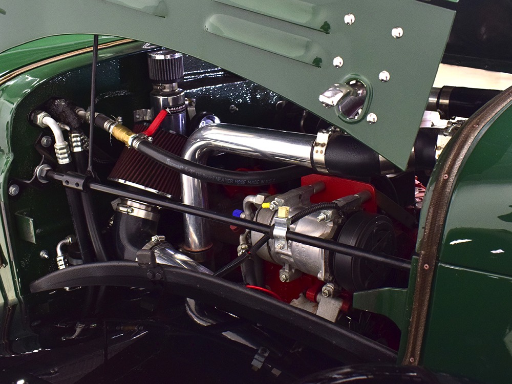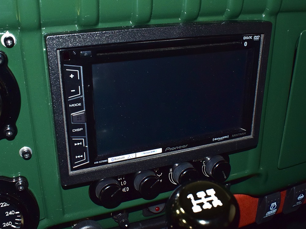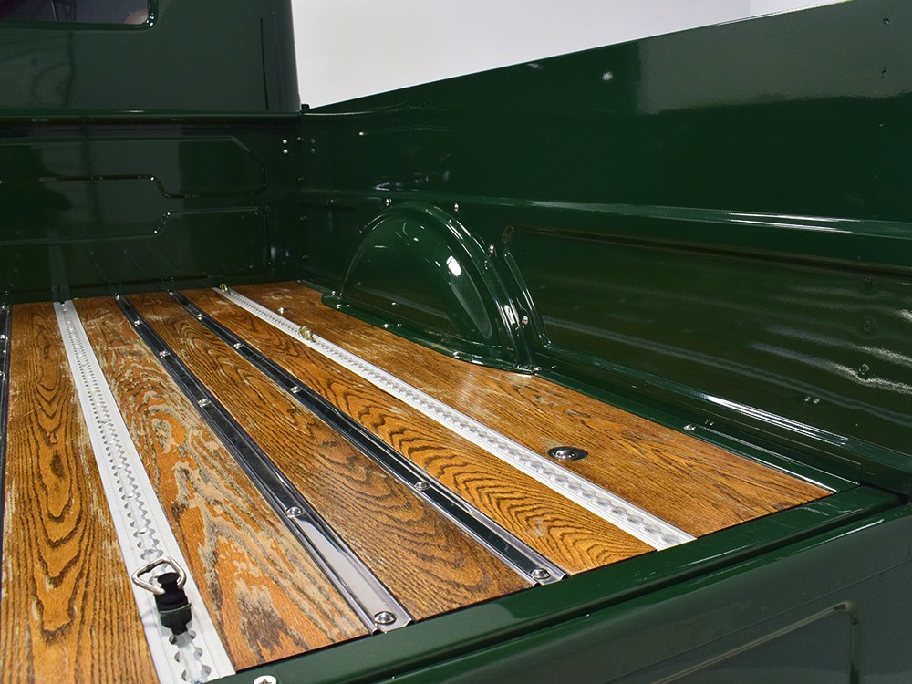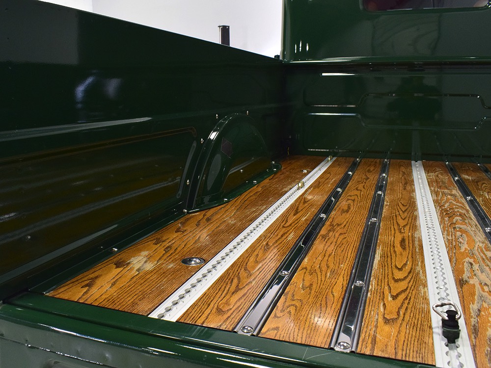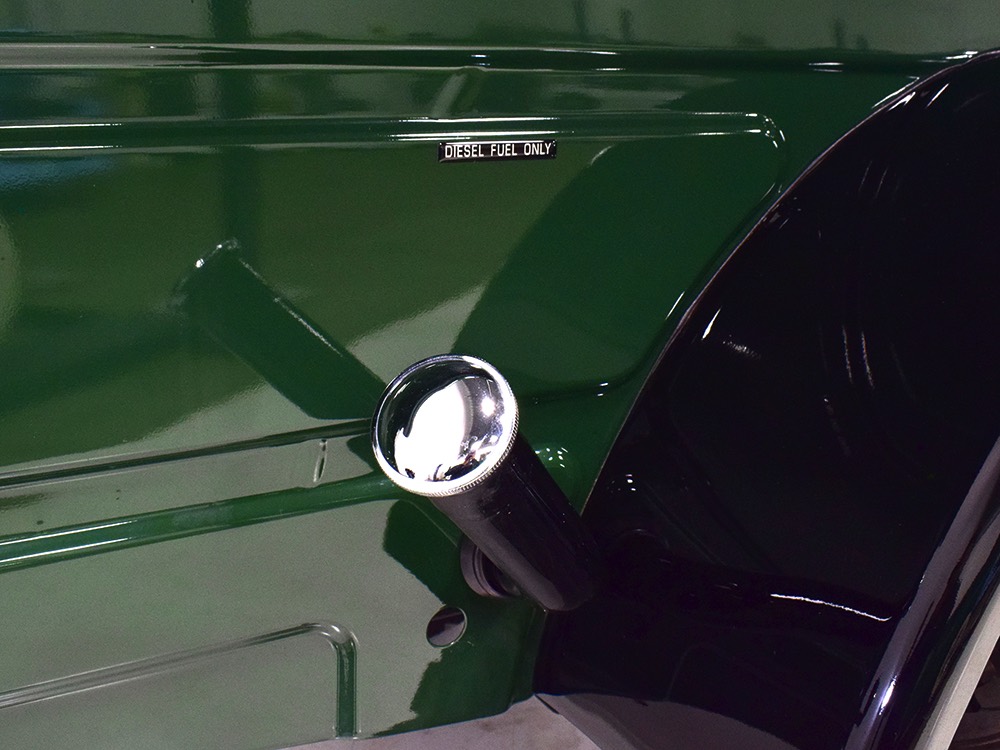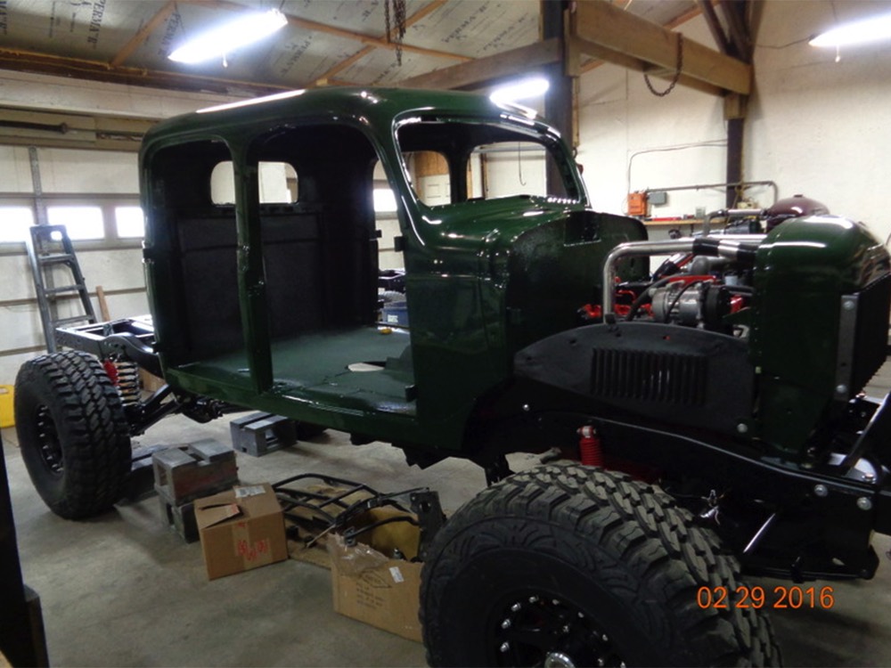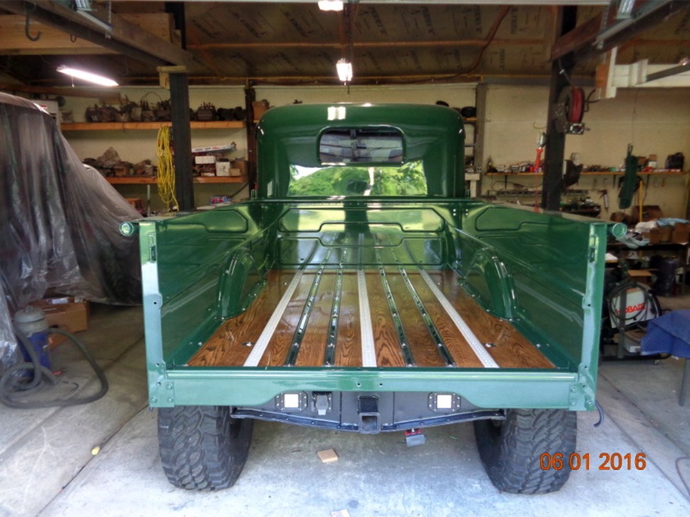 It sits on a reinforced Power Wagon chassis, again to preserve the vintage feel which, after all, is the entire point. The 5-speed manual transmission shifts easily and clutch action is light, but the hardware is virtually indestructible. Oversized axles front and rear carry 4.56 gears, and with a deep overdrive 5th gear in the transmission, it cruises easily at 70 MPH. Obviously the rear suspension has been upgraded to coil springs with a 4-link to vastly improve ride quality and power steering is a very welcome addition. Gigantic 4-wheel disc brakes are more than adequate for the heavy but surprisingly fast Dodge, and thanks to careful tuning on the shocks and bushings, ride quality is excellent—a far cry from the spine-compressing original setup. There’s a PTO for the Braden 10,000 pound winch up front, which carries 200 feet of stainless cable and Precision’s signature red tow hook, and a rear-mounted winch with a remote control for the really rough stuff. It’s also built with an integrated Class IV receiver hitch with both 4-way and 7-way electrical connections and this truck will pull just about anything you can connect to it. A gigantic gas tank hangs under the bed and given the relative thrift of the diesel engine, it offers plenty of range for going to some really remote places. A full stainless steel exhaust system will last forever and custom powder-coated wheels carry mammoth 40x13.50R17 Super Comp off-road radials.