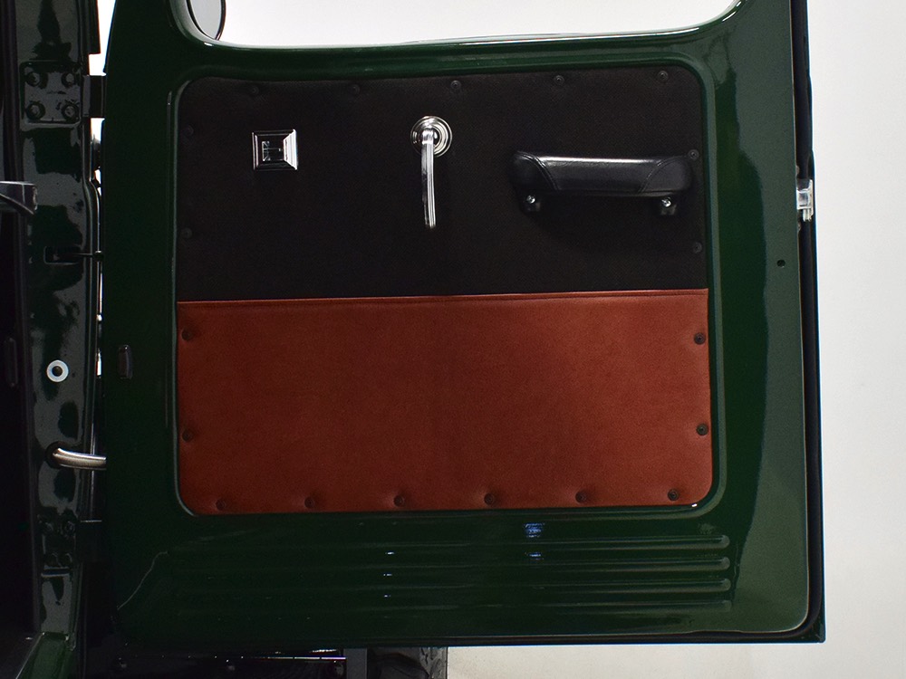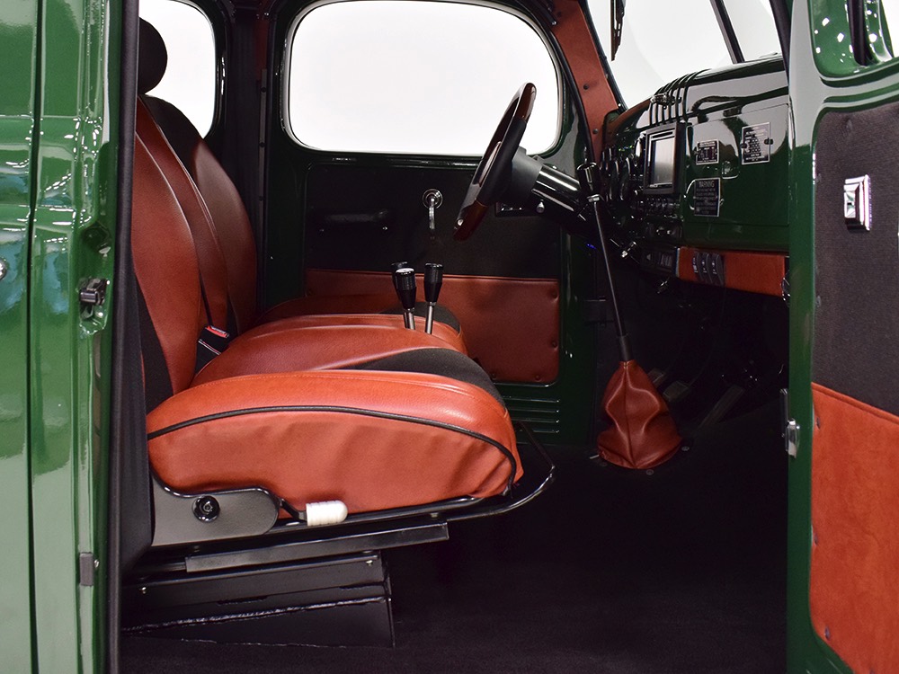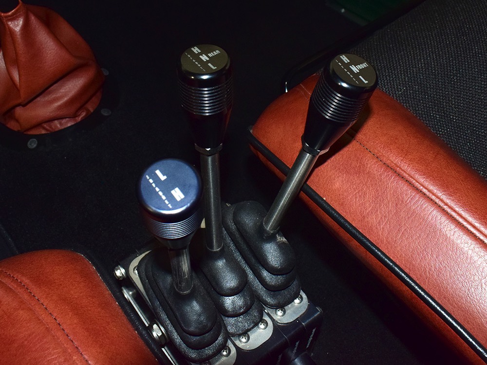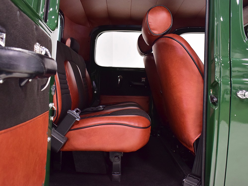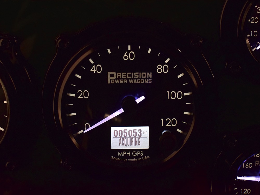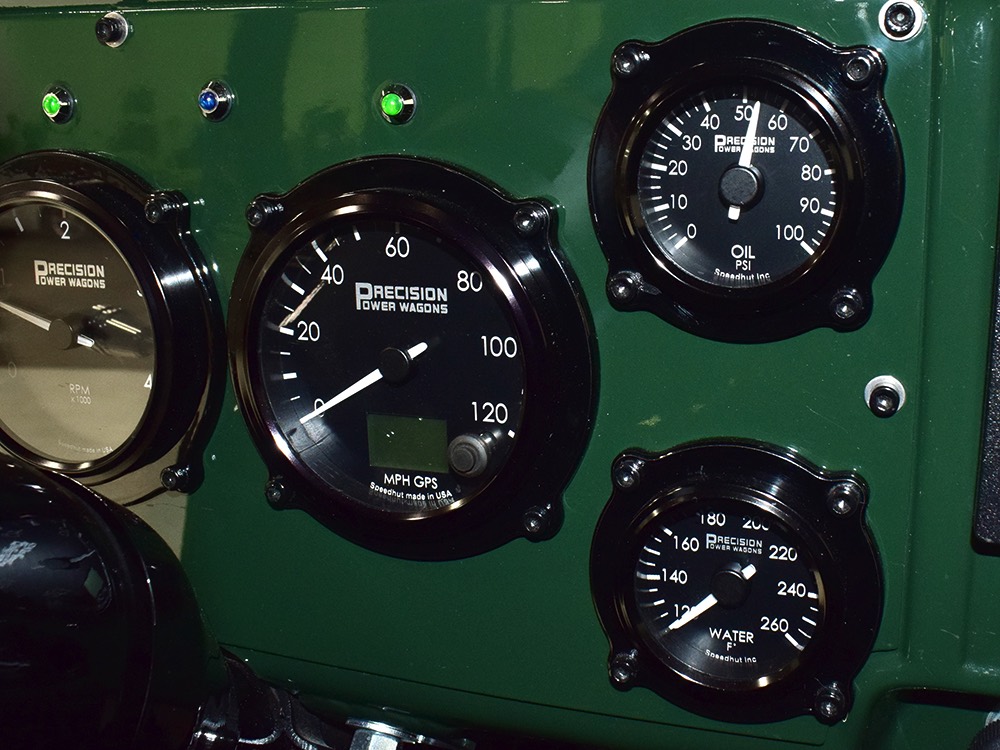 Open any of the four doors and the running boards drop down to make it easier for you to climb aboard. Inside, you’ll find a luxuriously appointed interior that doesn’t erase the Power Wagon’s identity but embraces. Yes, the seats are far more comfortable than the original vinyl bench and there’s considerably more space, but the driving position and feel are still very much like they should be. A steel dash, complete with crank-out windshield and overhead controls for the windshield wipers, all make you feel like it’s 1947. The tilt steering column holds a small wood and leather wheel that would be utterly impossible on a stock Power Wagon, and in the build photos, you can see that they went to great lengths to make the center horn button match the rest of the leather used inside. Precision Power Wagons installs their own set of bespoke GPS-referenced instruments, too, including turbo boost and exhaust gas temperature gauges in addition to the usual stuff. You’ll also note a killer AM/FM/CD/satellite stereo system with touch screen in the center of the dash, and it’s connected to a rear-view camera that automatically comes online when you put it in reverse. Controls for the powerful A/C system are underneath and there are three sticks in the center that control the split transfer case, so you can send power forward, rearward, or both depending on conditions. The seats are extremely comfortable, there are switches for the ARB locking differentials and on-board air compressor, and it offers push-button starting with a remote key fob that only needs to stay in your pocket to work correctly. Heck, even the headlights turn themselves on automatically! Accommodations are quite adequate for four passengers and there are seat belts at all four positions for safety.