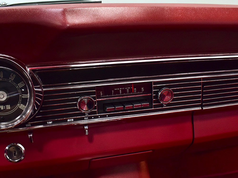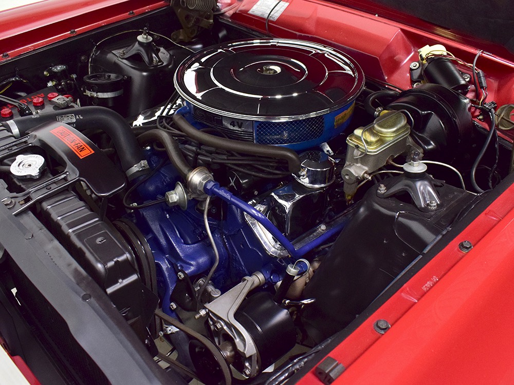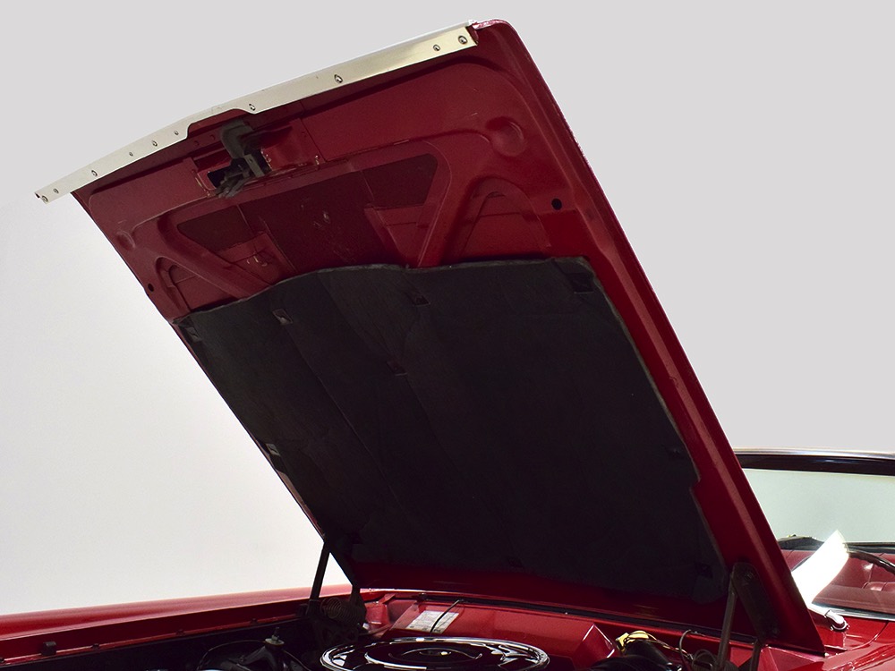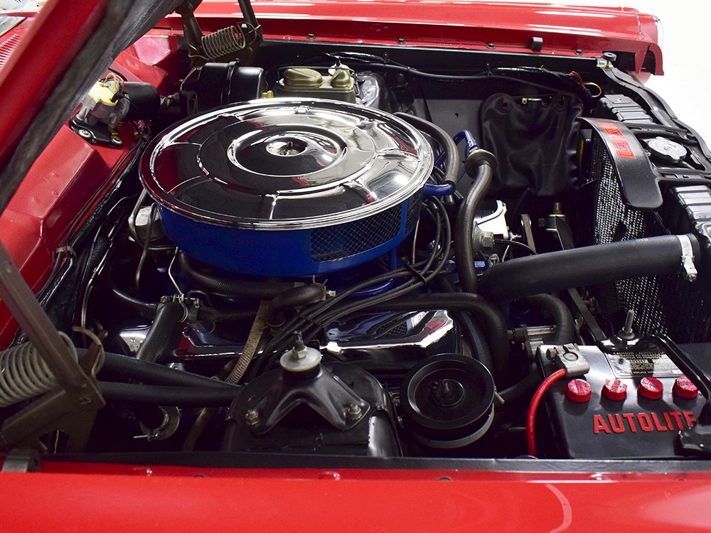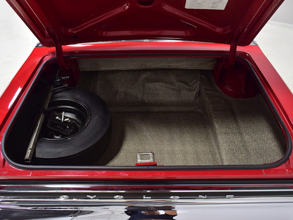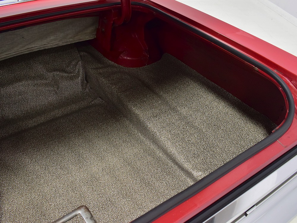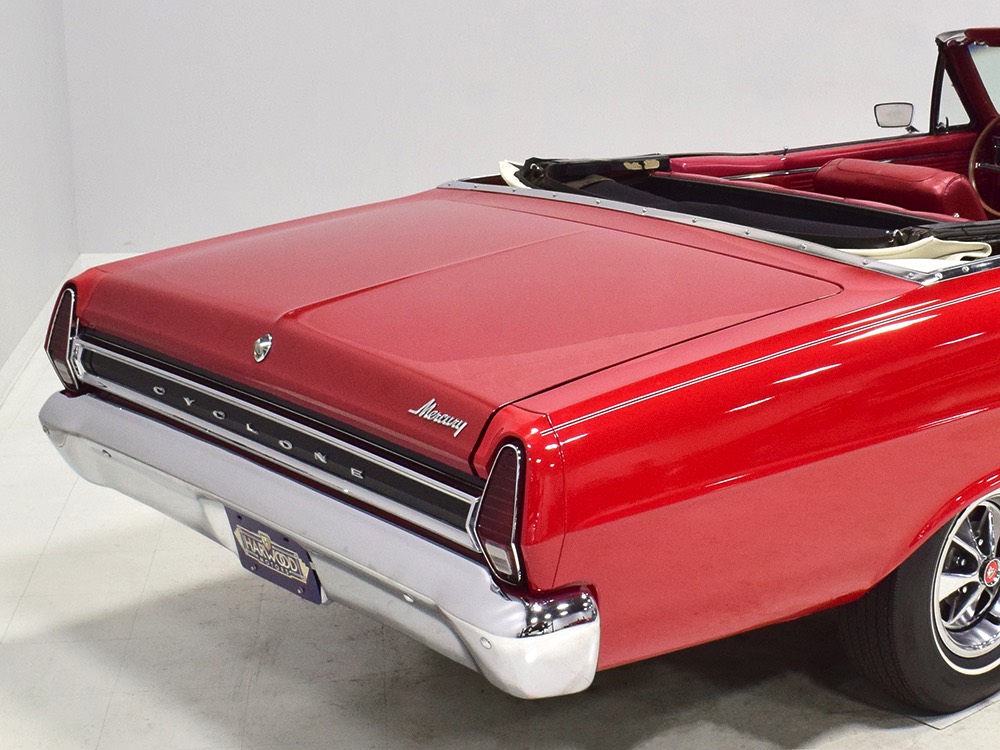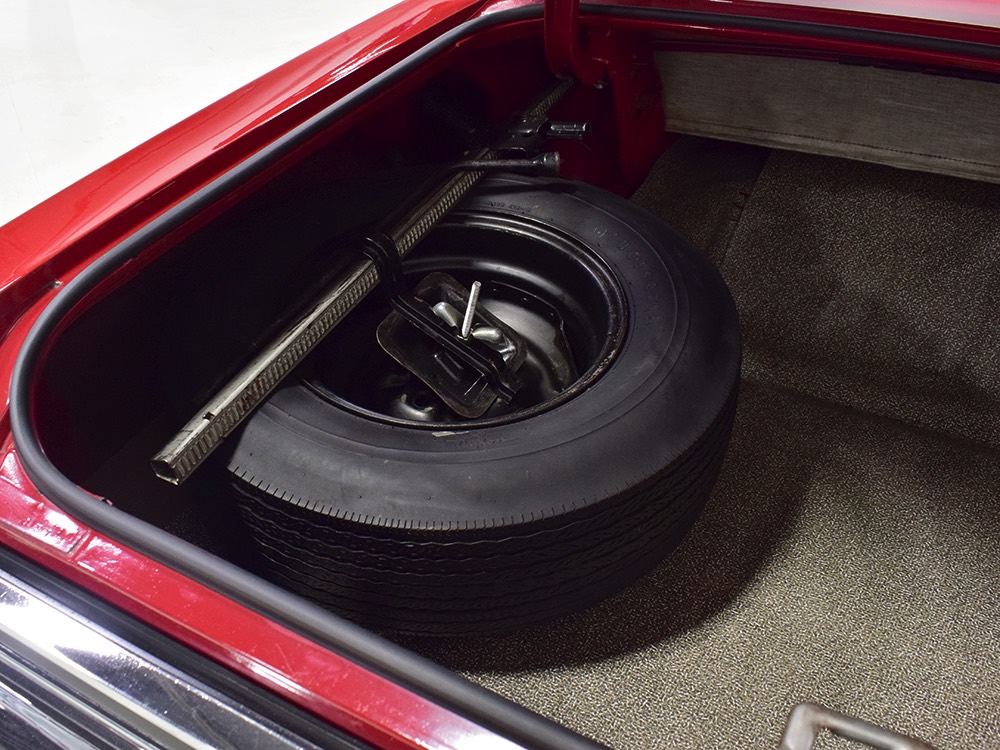 The code 8D red vinyl bucket seat interior is almost entirely original. Seats, door panels, dash pad, and console all date to 1967, and even the carpets are original. Yeah, no kidding. The Cyclone GT got a full set of instruments in four round pods ahead of the driver, and they’re fully operational including the factory tach. Look at the bright, crisp markings on the gauge faces, the bright chrome strips on the dash, and the unmarked center console. The seats are still firm and comfortable, all the interior lights work, and even the little indicator lights in the shifter glow brightly. There’s a newer white power convertible top overhead and there’s a brand new red vinyl boot that is still in the original wrapper, so we didn’t want to open it. The fully finished trunk uses a replacement mat set, but that is the original spare tire and factory jack assembly and there’s plenty of evidence of its California life underneath.