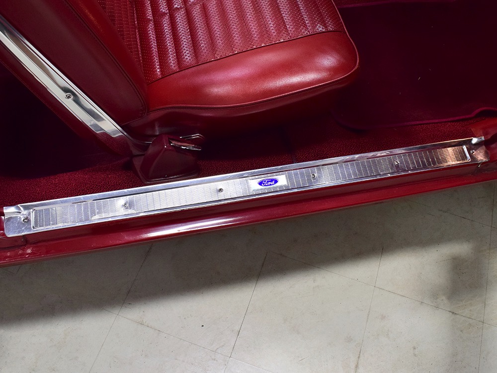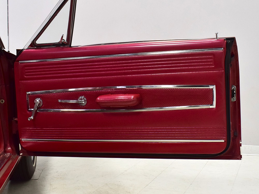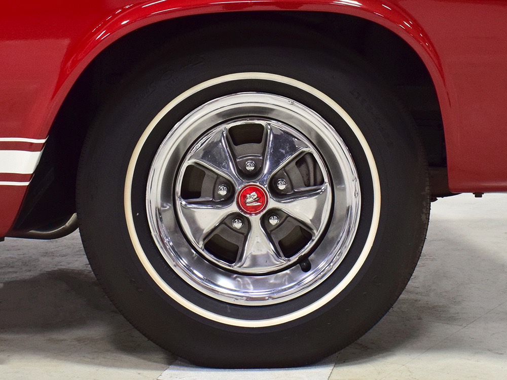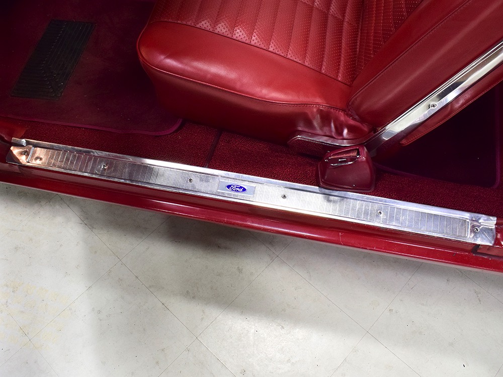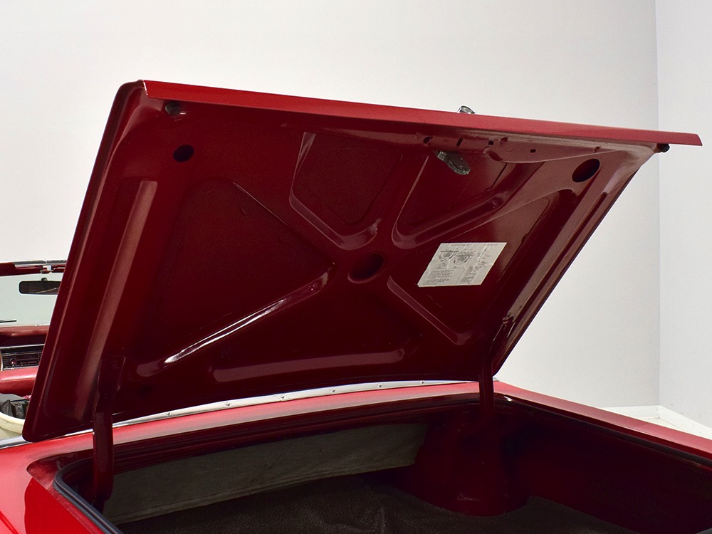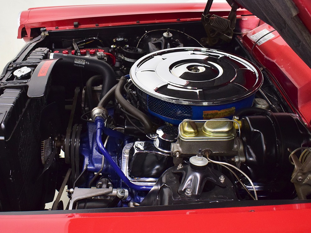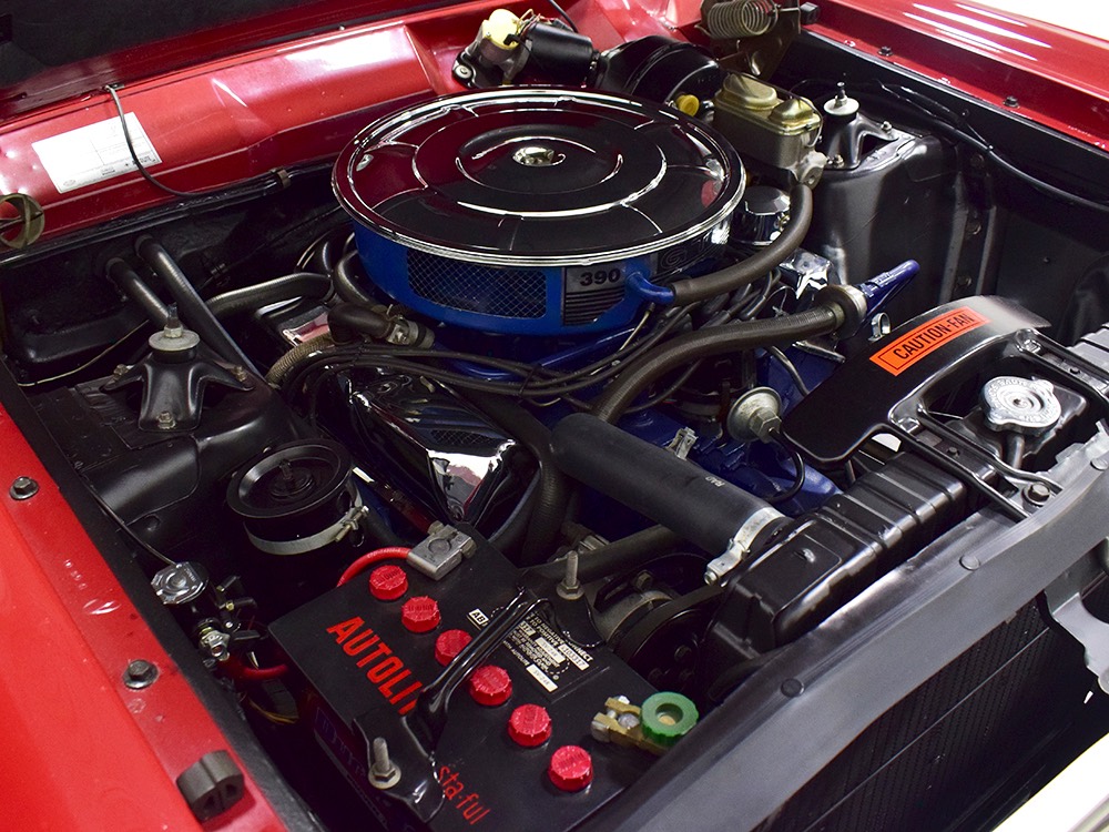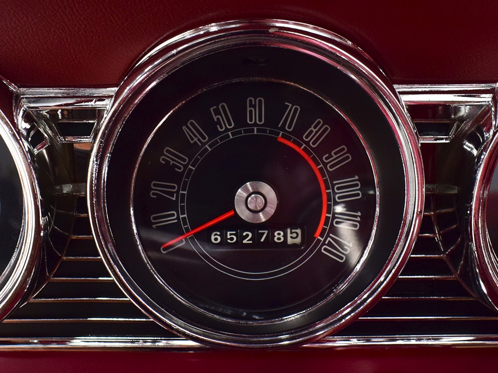 The code 8D red vinyl bucket seat interior is almost entirely original. Seats, door panels, dash pad, and console all date to 1967, and even the carpets are original. Yeah, no kidding. The Cyclone GT got a full set of instruments in four round pods ahead of the driver, and they’re fully operational including the factory tach. Look at the bright, crisp markings on the gauge faces, the bright chrome strips on the dash, and the unmarked center console. The seats are still firm and comfortable, all the interior lights work, and even the little indicator lights in the shifter glow brightly. There’s a newer white power convertible top overhead and there’s a brand new red vinyl boot that is still in the original wrapper, so we didn’t want to open it. The fully finished trunk uses a replacement mat set, but that is the original spare tire and factory jack assembly and there’s plenty of evidence of its California life underneath.