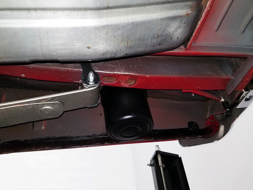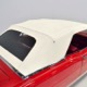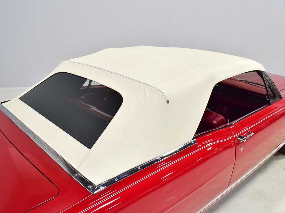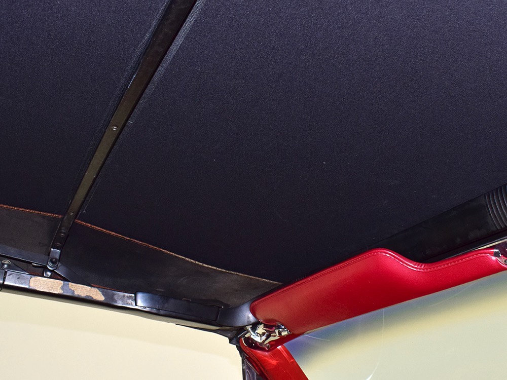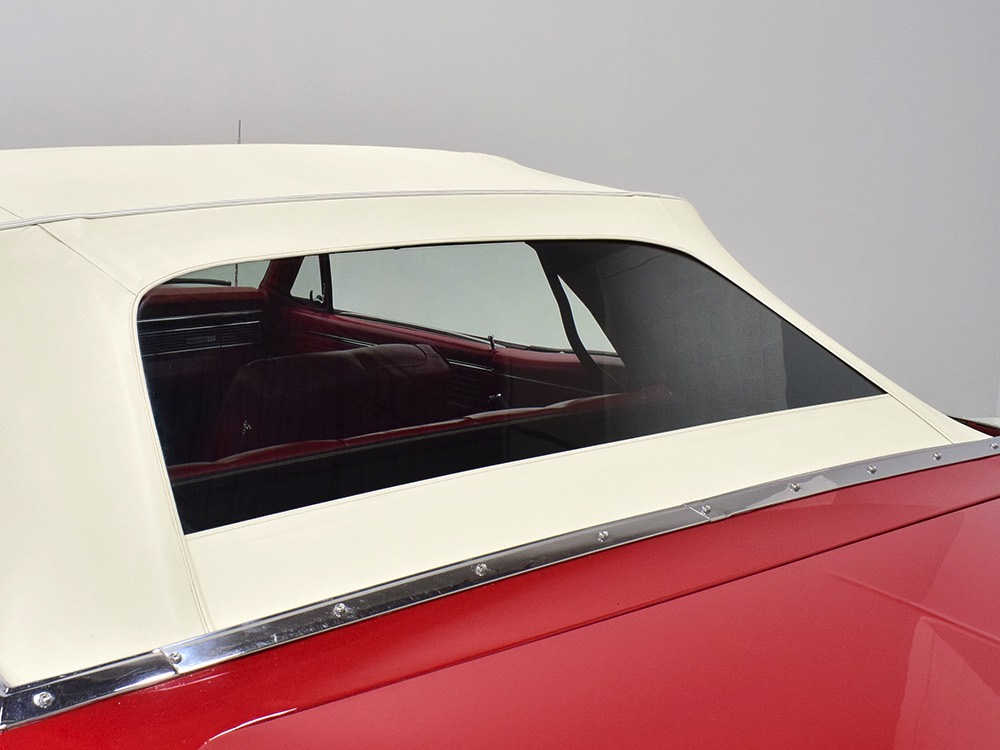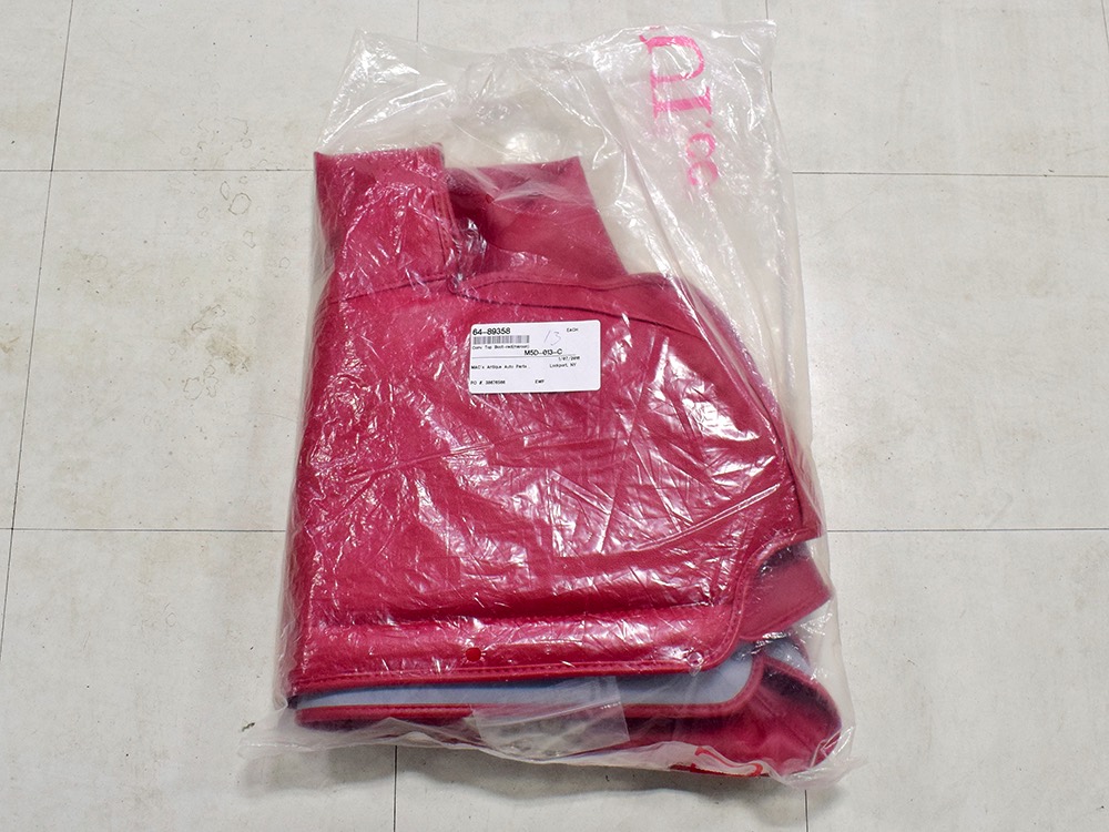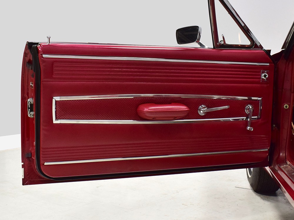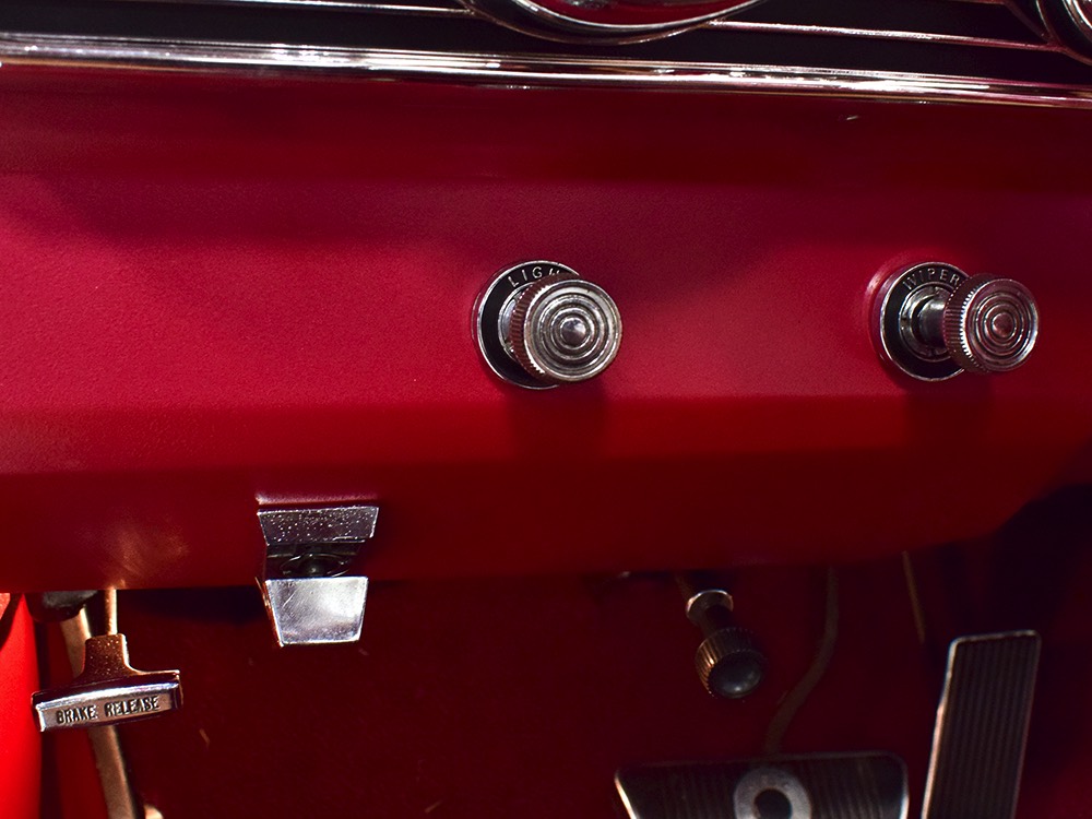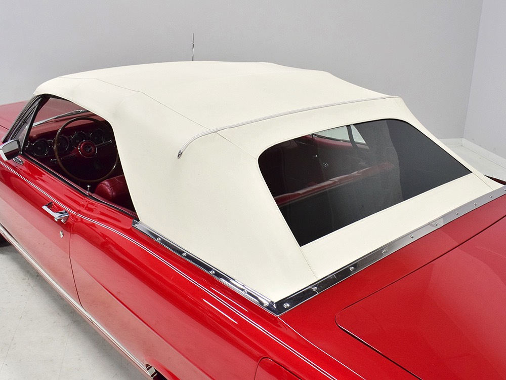 The code 8D red vinyl bucket seat interior is almost entirely original. Seats, door panels, dash pad, and console all date to 1967, and even the carpets are original. Yeah, no kidding. The Cyclone GT got a full set of instruments in four round pods ahead of the driver, and they’re fully operational including the factory tach. Look at the bright, crisp markings on the gauge faces, the bright chrome strips on the dash, and the unmarked center console. The seats are still firm and comfortable, all the interior lights work, and even the little indicator lights in the shifter glow brightly. There’s a newer white power convertible top overhead and there’s a brand new red vinyl boot that is still in the original wrapper, so we didn’t want to open it. The fully finished trunk uses a replacement mat set, but that is the original spare tire and factory jack assembly and there’s plenty of evidence of its California life underneath.