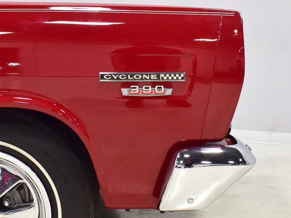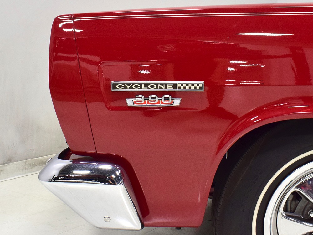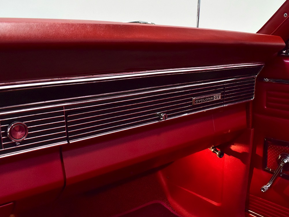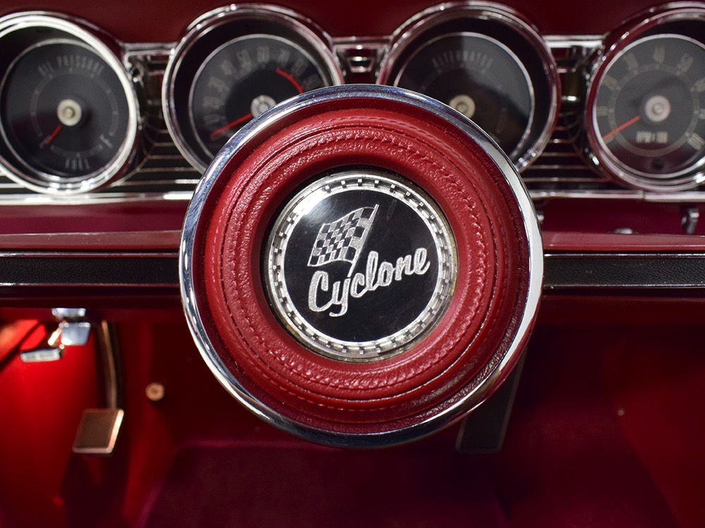 The engine is the car’s original S-code 390 cubic inch V8, which was standard in the GT. It makes a rather stout 335 horsepower and 427 pounds of torque, turning the Cyclone into a rather serious performance car when you stand on the pedal. Despite just 65,278 original miles, it was fully rebuilt and detailed last year. You'll note it still carries all its original California emissions equipment, including the AIR pump and EGR crossover, both of which are probably unobtainium today and it’s all operational. Detailing is well done and with Ford blue and a few splashes of chrome, it's a very attractive engine bay that you’ll want to show off at events. The big 390 starts right up, and while it's a little grumpy for the first minute or so while it’s on the choke, it smooths out after that and pulls like a freight train. There's torque all over the tach and you never have to rev it very hard, which is why I think the C6 3-speed automatic transmission is a better choice—there’s still a bit of luxury car DNA in this muscular Merc.