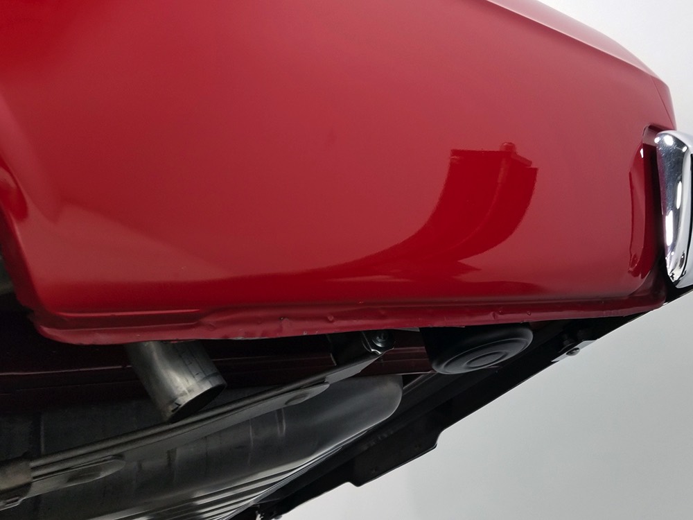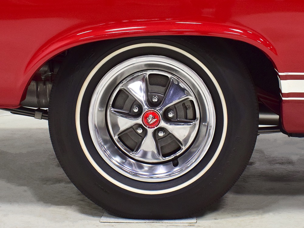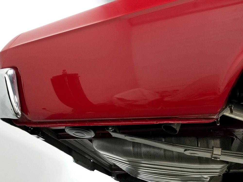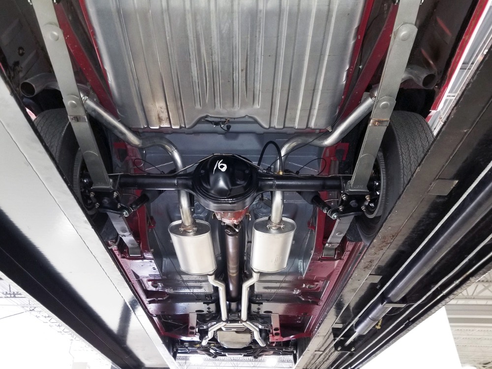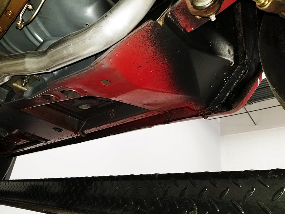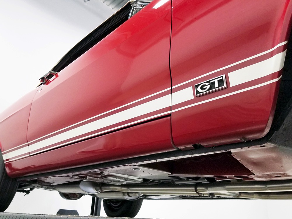 Believe it or not, the undercarriage is original—it has been carefully cleaned and clear-coated for protection, but the finishes and condition are mostly factory-issue. It's a fantastic example for benchmarking these cars, proving that red oxide primer on the floors isn't necessarily correct. Power steering and power front disc brakes make it extremely easy for anyone to handle and the beefy C6 3-speed automatic transmission doesn’t seem to notice all the torque churning through it. Note details like the original spot welds and even paint drips on the rockers, immaculate torque boxes, factory markings on the driveshaft, and a reproduction dual exhaust system that sounds just right. The major systems have all been serviced and/or rebuilt so it drives beautifully and there are 3.25 gears out back making it a fantastic highway cruiser. Styled steel wheels with correct F70-14 Firestone whitewalls complete the look.