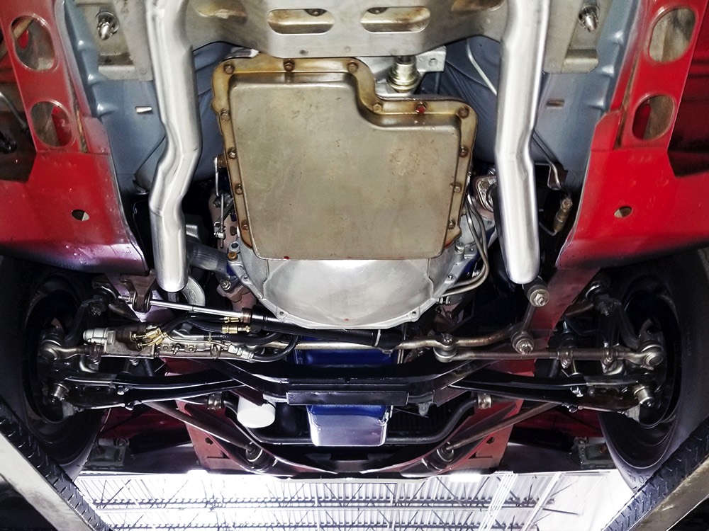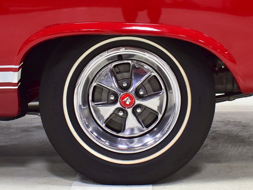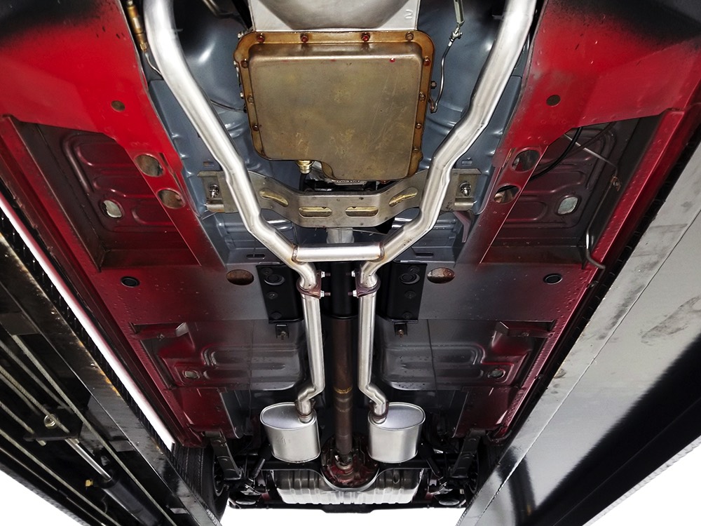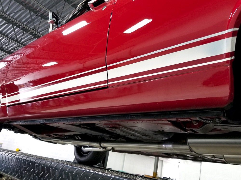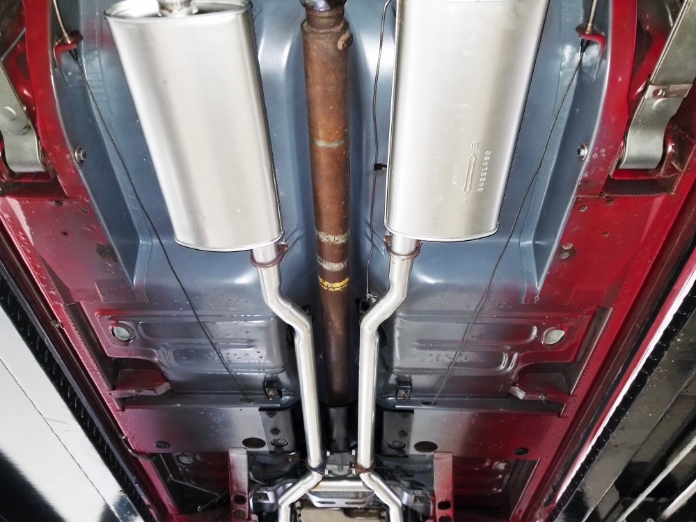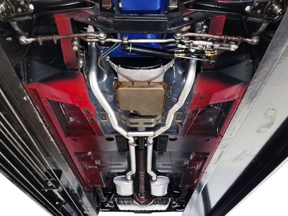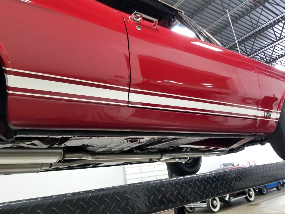 Believe it or not, the undercarriage is original—it has been carefully cleaned and clear-coated for protection, but the finishes and condition are mostly factory-issue. It's a fantastic example for benchmarking these cars, proving that red oxide primer on the floors isn't necessarily correct. Power steering and power front disc brakes make it extremely easy for anyone to handle and the beefy C6 3-speed automatic transmission doesn’t seem to notice all the torque churning through it. Note details like the original spot welds and even paint drips on the rockers, immaculate torque boxes, factory markings on the driveshaft, and a reproduction dual exhaust system that sounds just right. The major systems have all been serviced and/or rebuilt so it drives beautifully and there are 3.25 gears out back making it a fantastic highway cruiser. Styled steel wheels with correct F70-14 Firestone whitewalls complete the look.