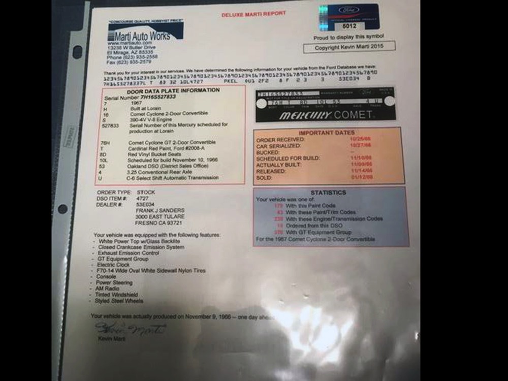 As a result of having just two long-term owners, this Comet comes with an extensive paper trail documenting the care it has received over the years. Factory papers include the original build sheet, window sticker, original OwnerCard, factory owner’s manual, body tags, and more. It also comes with decades of registration documents, its original California black plates, and receipts for service dating back more than 40 years, which authenticates the mileage. A standard Marti Report and a framed Deluxe Marti Report are both included, confirming the car’s specifications and rarity, as well as the fact that it was delivered new to Fresno, California.