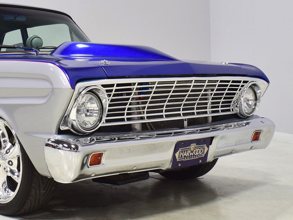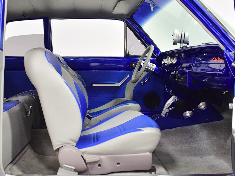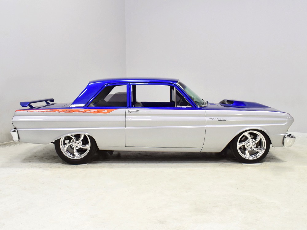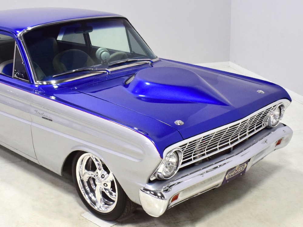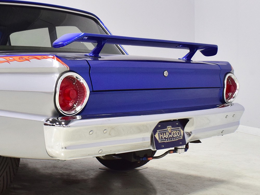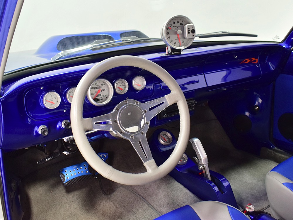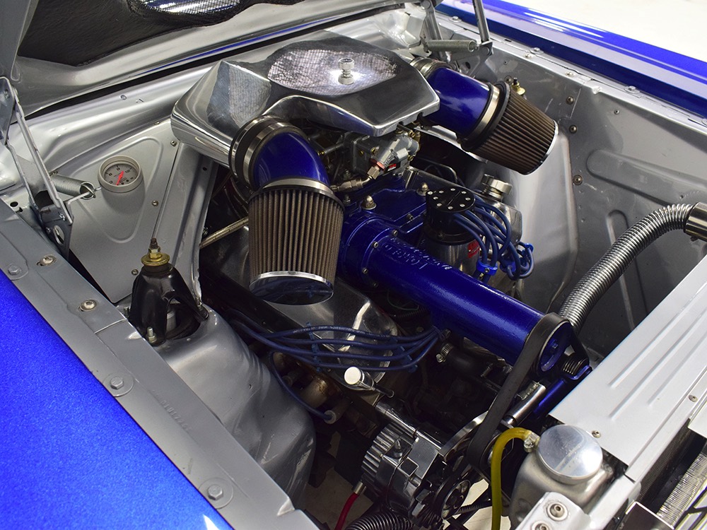 There’s still a small block Ford in the Falcon, a Ford Motorsports 302 cubic inch V8 that slots between the shock towers easily because the second-gen Falcon was designed to handle the 260/289/302 from the start. The way it was originally built, the V8 was rated at 295 horsepower but thanks to the B&M street blower on top, there’s considerably more on tap today. It’s a roots-style blower, so it makes full boost before you can even get your foot on the floor making this Falcon is a weapon on the street. Canfield aluminum heads handle the pressurized intake charge and there’s a good-sized blower cam inside that idles well but pulls like a freight train. Everything under the hood was painted blue or silver to match the bodywork and they obviously took a lot of extra time to hide the plumbing and wiring. A giant Griffin aluminum radiator with electric fan keeps it cool without too much drama and that trick air cleaner assembly pulls cold air through the functional hood scoop and into a 750 cfm Holley blower carb. Gorgeous long-tube headers feed a custom dual exhaust system with Flowmaster mufflers, so you know this thing sounds gnarly.