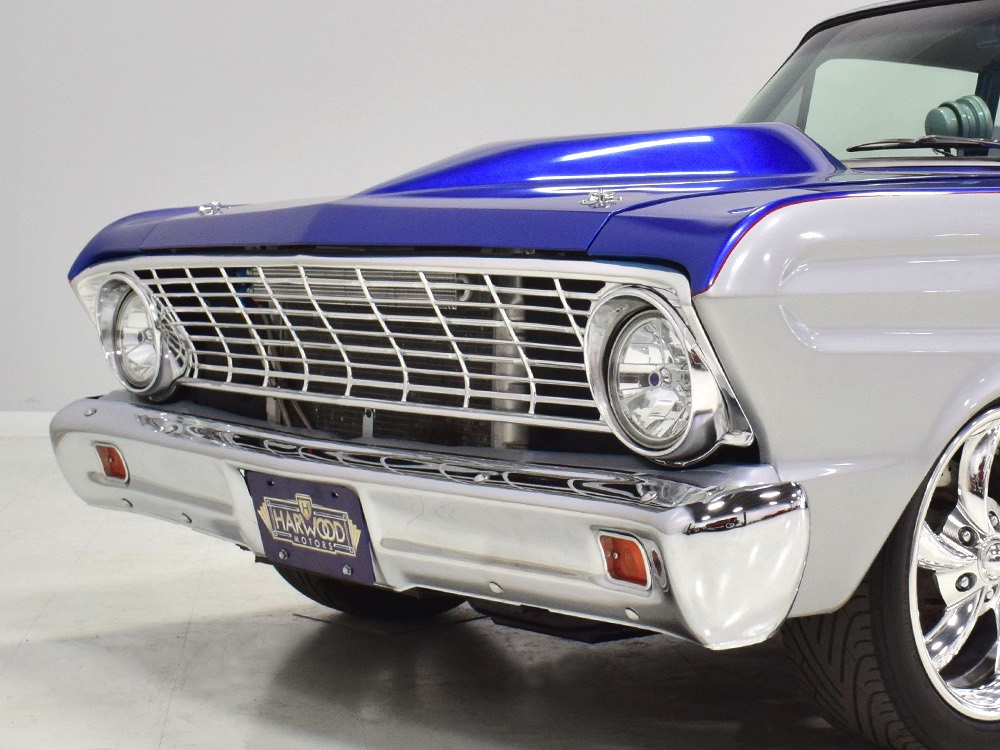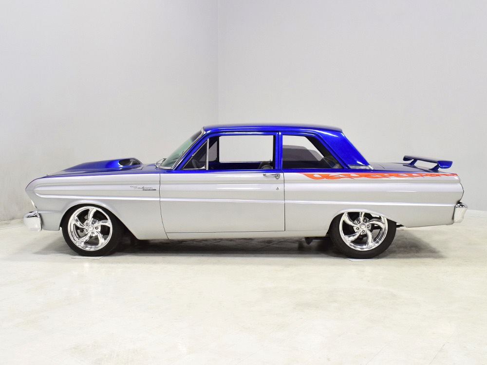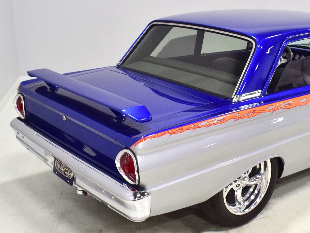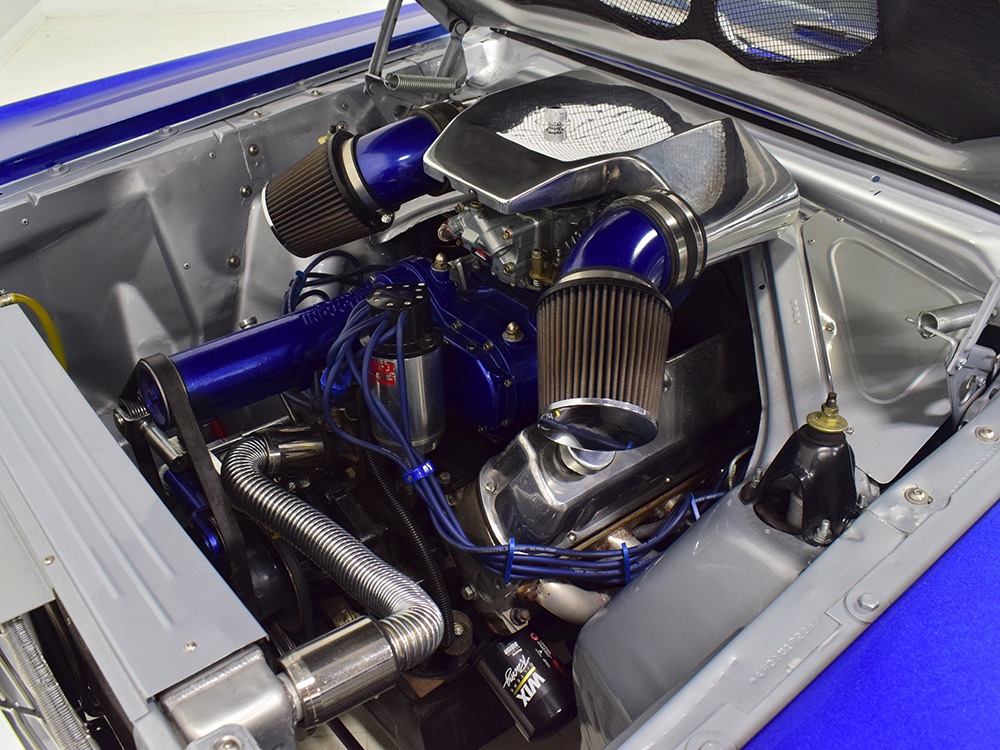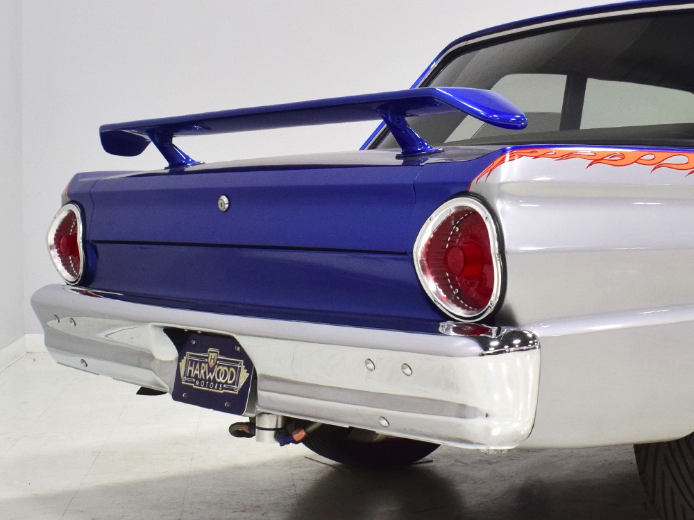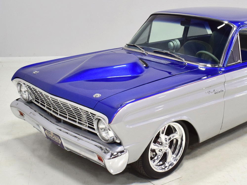 There’s still a small block Ford in the Falcon, a Ford Motorsports 302 cubic inch V8 that slots between the shock towers easily because the second-gen Falcon was designed to handle the 260/289/302 from the start. The way it was originally built, the V8 was rated at 295 horsepower but thanks to the B&M street blower on top, there’s considerably more on tap today. It’s a roots-style blower, so it makes full boost before you can even get your foot on the floor making this Falcon is a weapon on the street. Canfield aluminum heads handle the pressurized intake charge and there’s a good-sized blower cam inside that idles well but pulls like a freight train. Everything under the hood was painted blue or silver to match the bodywork and they obviously took a lot of extra time to hide the plumbing and wiring. A giant Griffin aluminum radiator with electric fan keeps it cool without too much drama and that trick air cleaner assembly pulls cold air through the functional hood scoop and into a 750 cfm Holley blower carb. Gorgeous long-tube headers feed a custom dual exhaust system with Flowmaster mufflers, so you know this thing sounds gnarly.