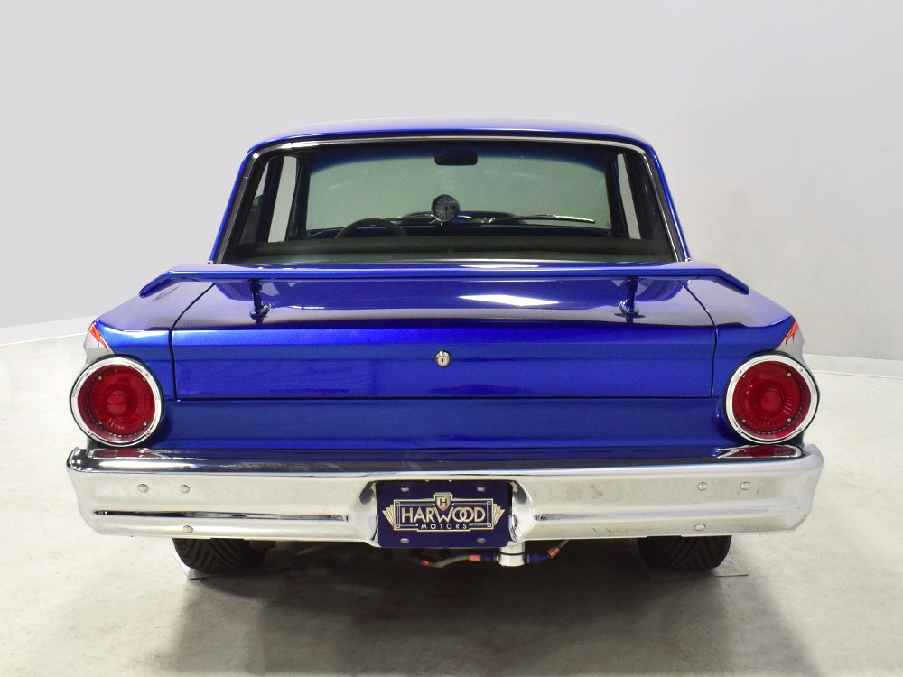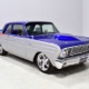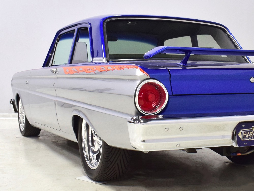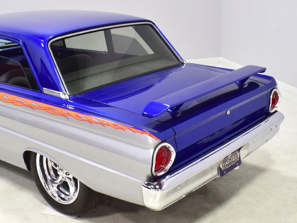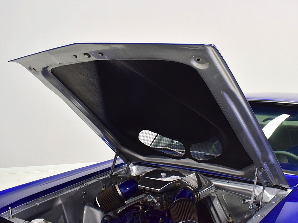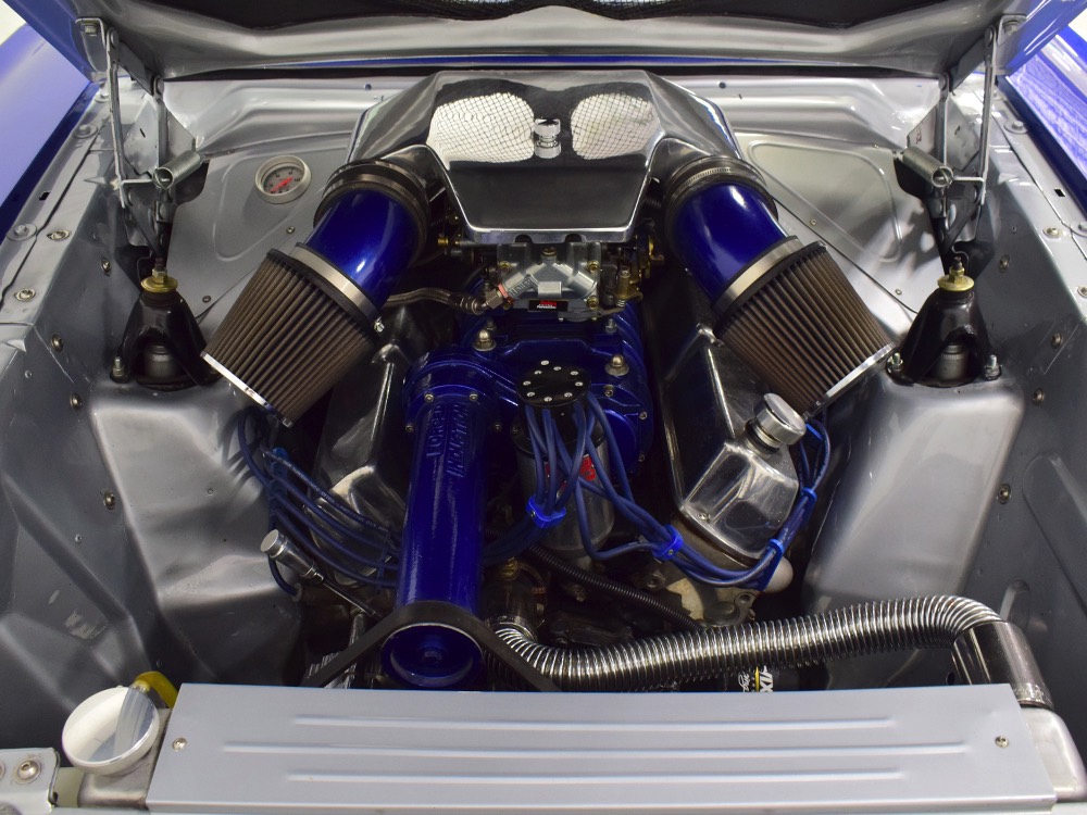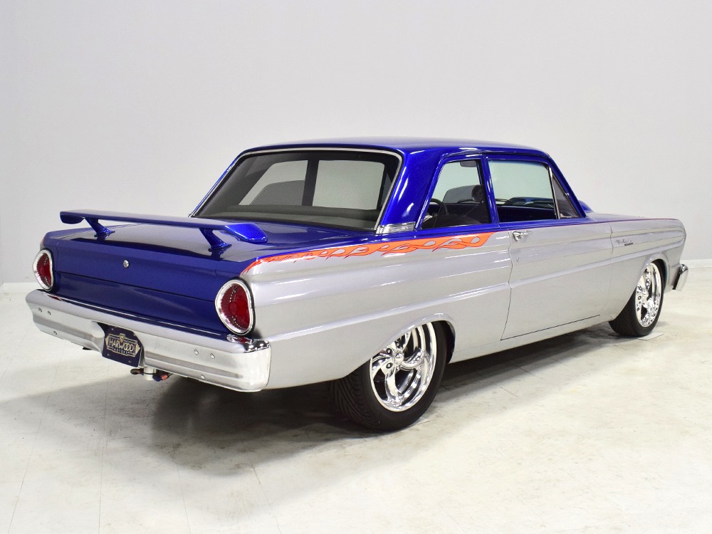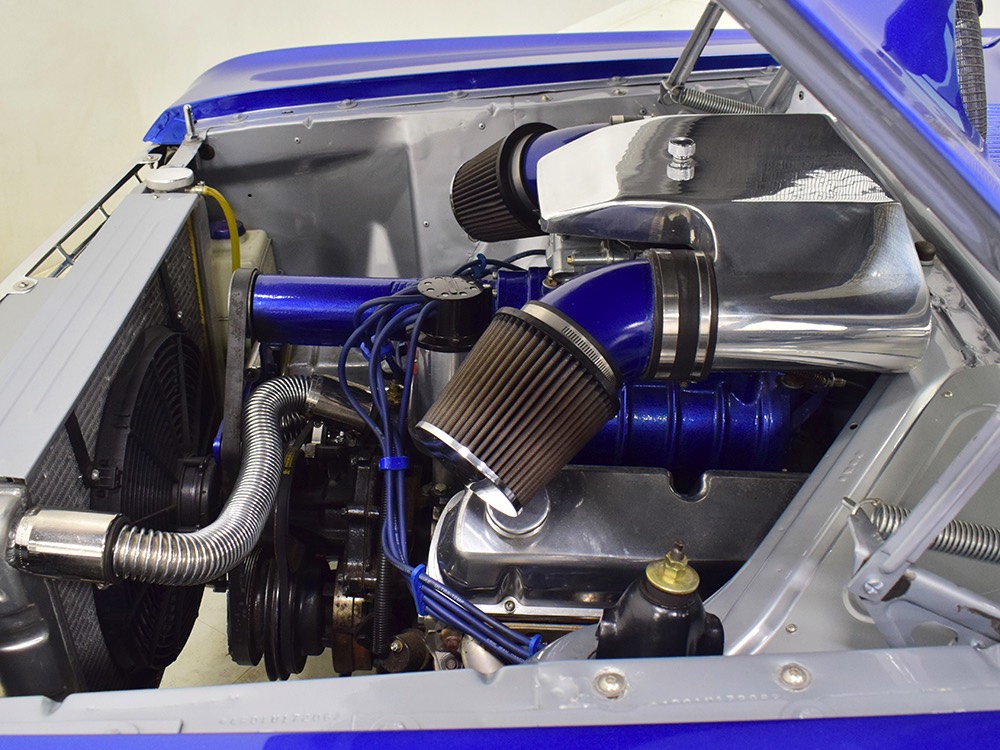 There’s still a small block Ford in the Falcon, a Ford Motorsports 302 cubic inch V8 that slots between the shock towers easily because the second-gen Falcon was designed to handle the 260/289/302 from the start. The way it was originally built, the V8 was rated at 295 horsepower but thanks to the B&M street blower on top, there’s considerably more on tap today. It’s a roots-style blower, so it makes full boost before you can even get your foot on the floor making this Falcon is a weapon on the street. Canfield aluminum heads handle the pressurized intake charge and there’s a good-sized blower cam inside that idles well but pulls like a freight train. Everything under the hood was painted blue or silver to match the bodywork and they obviously took a lot of extra time to hide the plumbing and wiring. A giant Griffin aluminum radiator with electric fan keeps it cool without too much drama and that trick air cleaner assembly pulls cold air through the functional hood scoop and into a 750 cfm Holley blower carb. Gorgeous long-tube headers feed a custom dual exhaust system with Flowmaster mufflers, so you know this thing sounds gnarly.