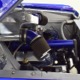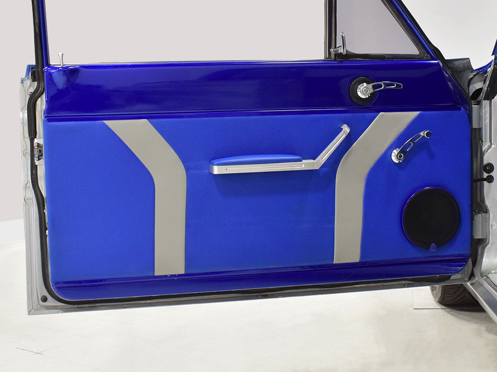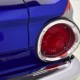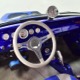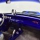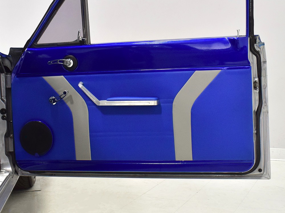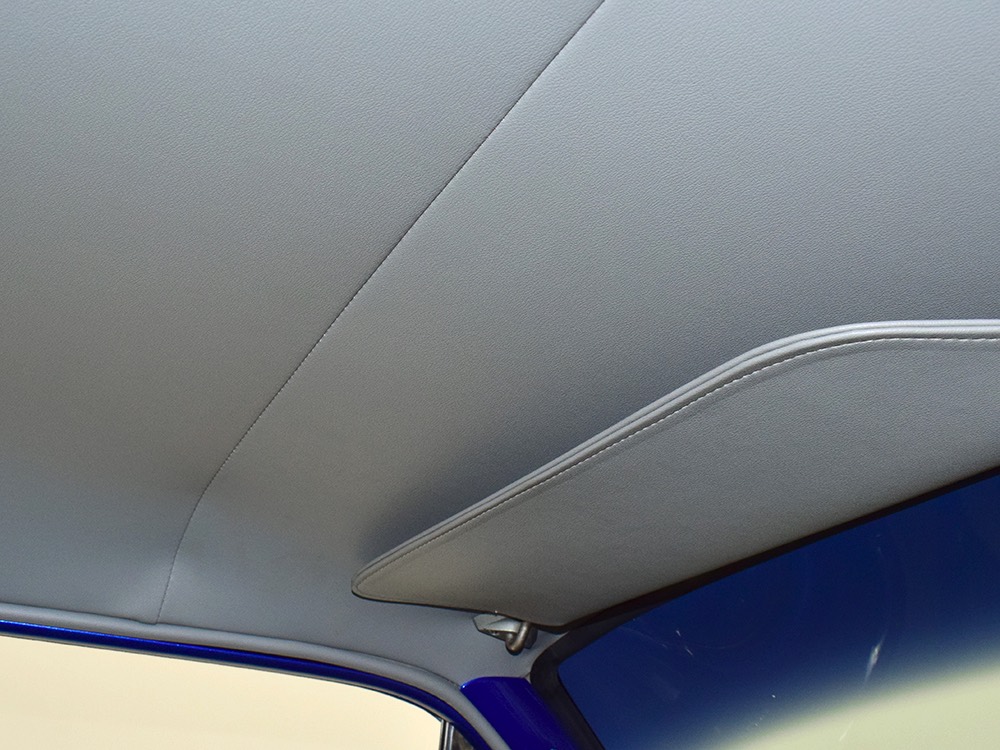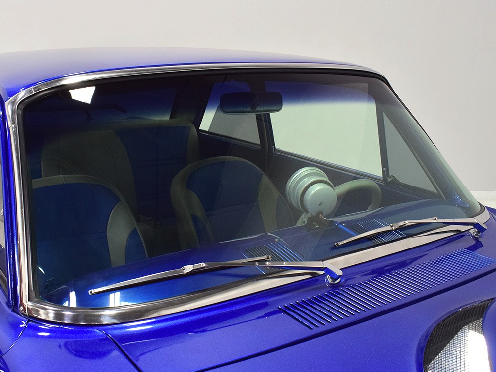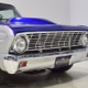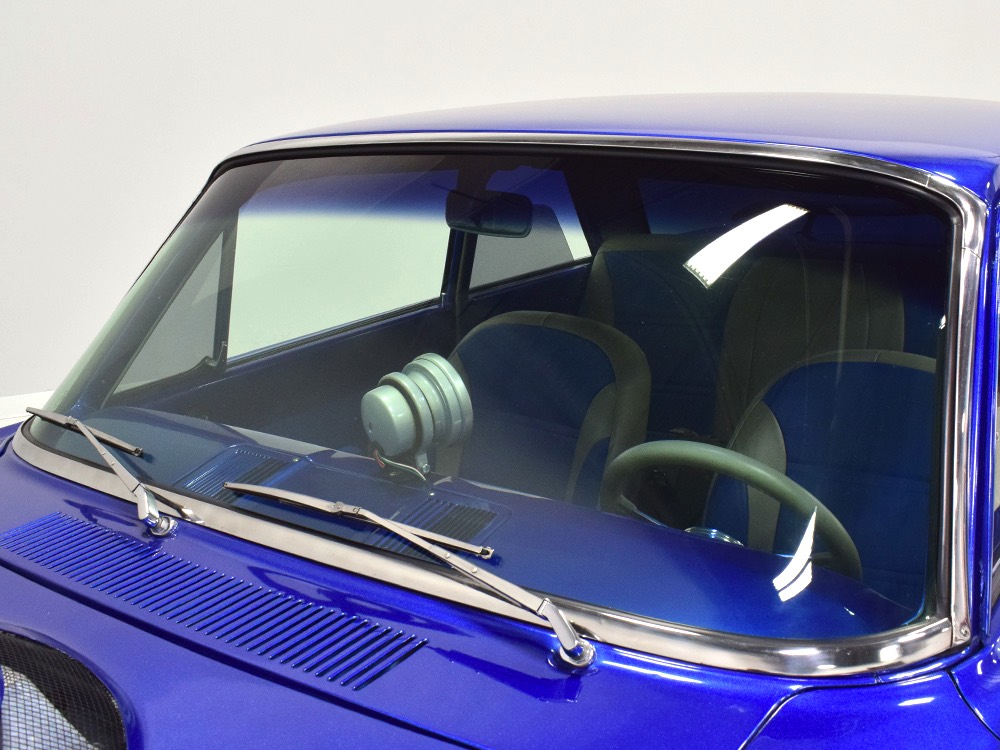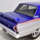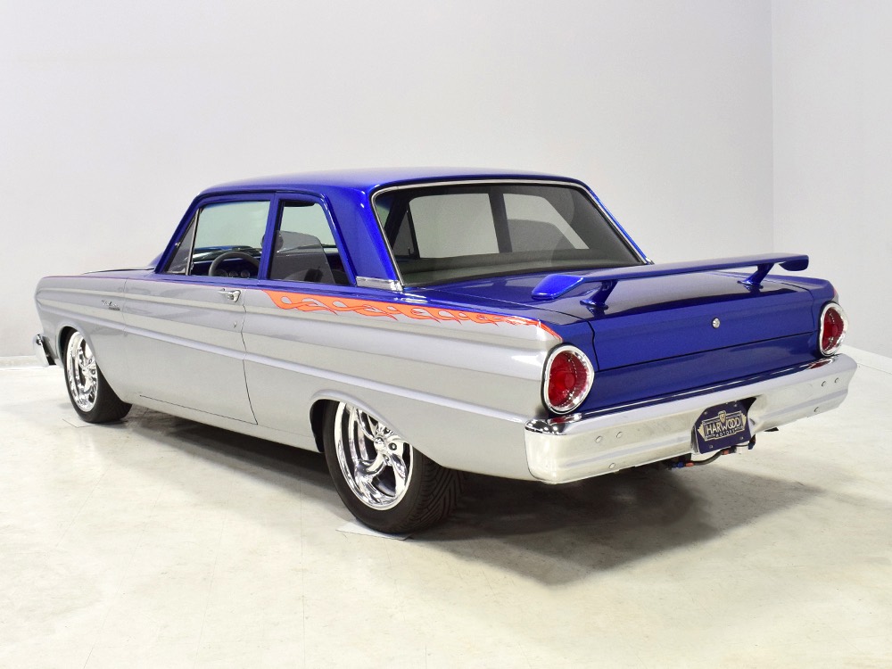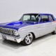 There’s still a small block Ford in the Falcon, a Ford Motorsports 302 cubic inch V8 that slots between the shock towers easily because the second-gen Falcon was designed to handle the 260/289/302 from the start. The way it was originally built, the V8 was rated at 295 horsepower but thanks to the B&M street blower on top, there’s considerably more on tap today. It’s a roots-style blower, so it makes full boost before you can even get your foot on the floor making this Falcon is a weapon on the street. Canfield aluminum heads handle the pressurized intake charge and there’s a good-sized blower cam inside that idles well but pulls like a freight train. Everything under the hood was painted blue or silver to match the bodywork and they obviously took a lot of extra time to hide the plumbing and wiring. A giant Griffin aluminum radiator with electric fan keeps it cool without too much drama and that trick air cleaner assembly pulls cold air through the functional hood scoop and into a 750 cfm Holley blower carb. Gorgeous long-tube headers feed a custom dual exhaust system with Flowmaster mufflers, so you know this thing sounds gnarly.