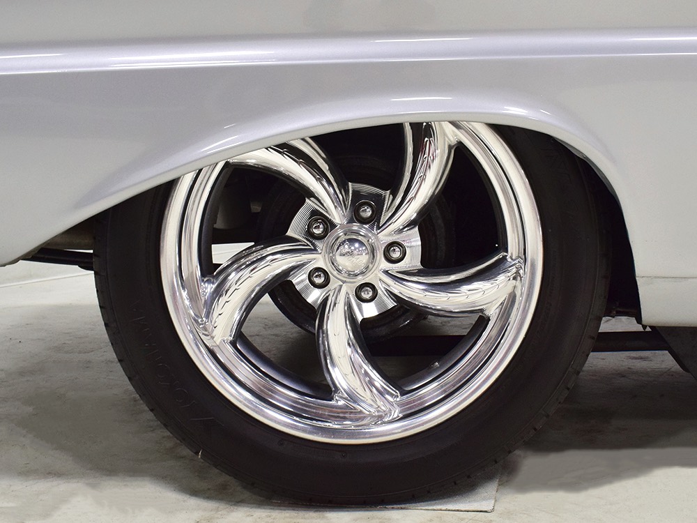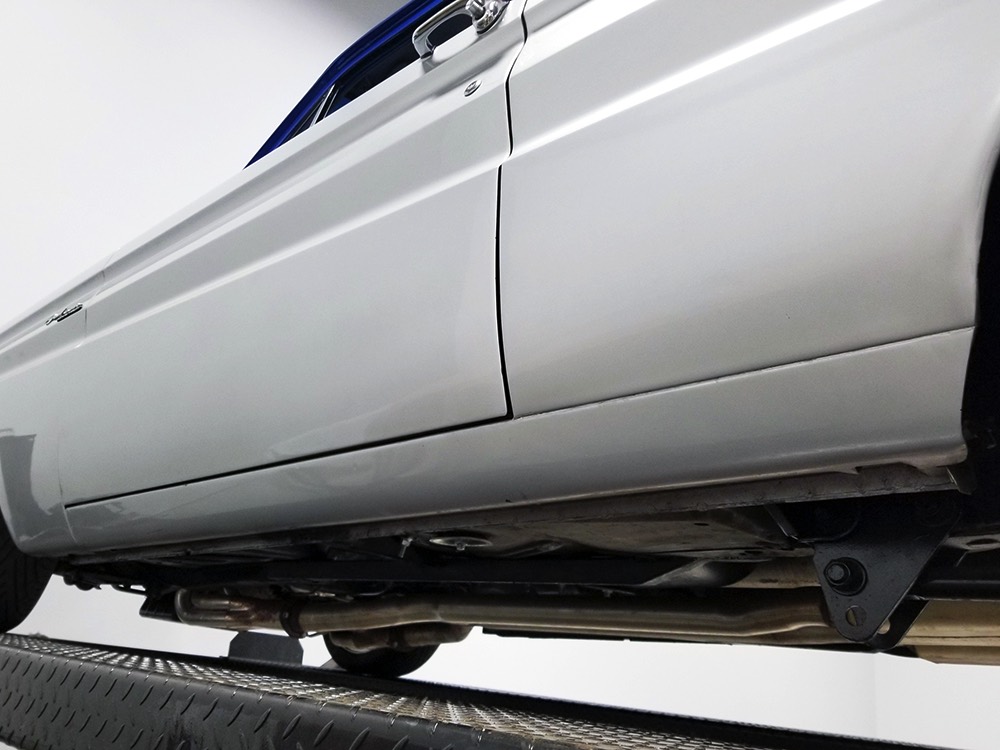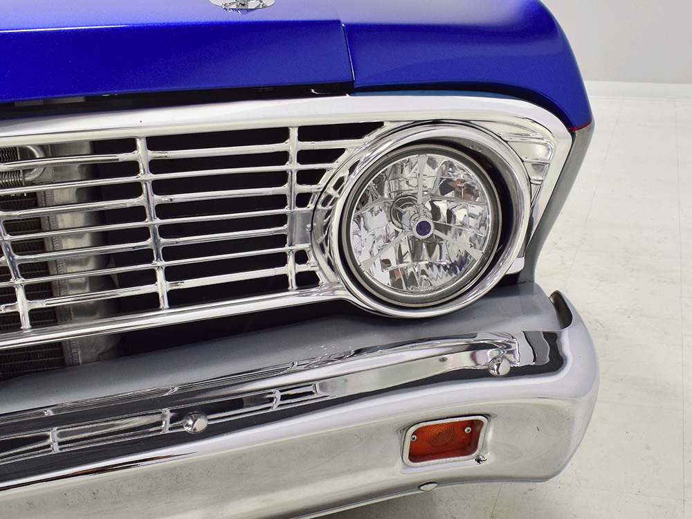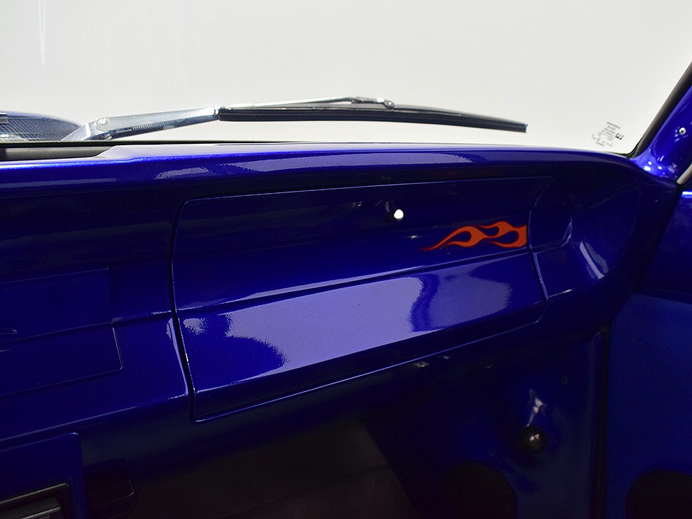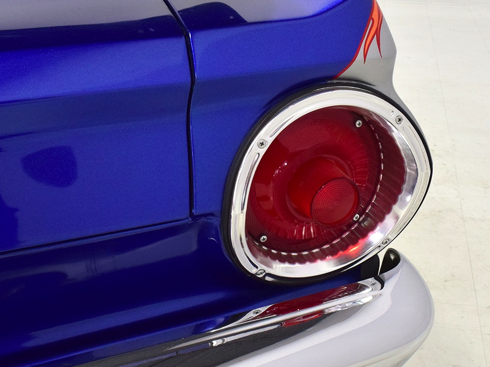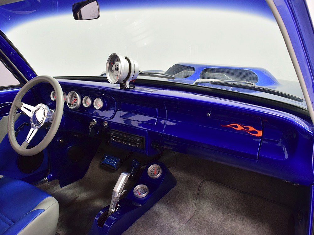 The Falcon was all-new in 1964, and the new look was a total home run. Looking more like a 7/8-scale Fairlane, the Falcon grew slightly and packed some muscle onto its formerly flyweight frame. Forward-canted front fenders and a pair of character lines stamped into the sheetmetal give it the illusion of motion, while the jet-inspired taillights remained a Ford trademark. Someone spent a great deal of money reworking this Falcon, starting with that awesome paint job. We believe it was finished 10 or 12 years ago, perhaps as a show car for the SEMA show (it’s full of JL Audio equipment and the JL Audio logo appears in several places on the car), and the two-tone combination still looks awesome. Laser-straight bodywork holds up under scrutiny and the electric blue paint seems to glow from within out in the sunlight. Graphics can be a make-or-break thing on a car like this, and they wisely chose to take a minimalist approach, adding some flames on the quarters just for effect, but not over done. Add in a teardrop hood inspired by the lightweight Thunderbolts and a modest wing on the deck lid and you get a car that looks right from any angle. Other neat details include the blue-dot high-intensity headlights, shaved emblems except the ‘Falcon’ badges on the front fenders, and nicely restored chrome bumpers.