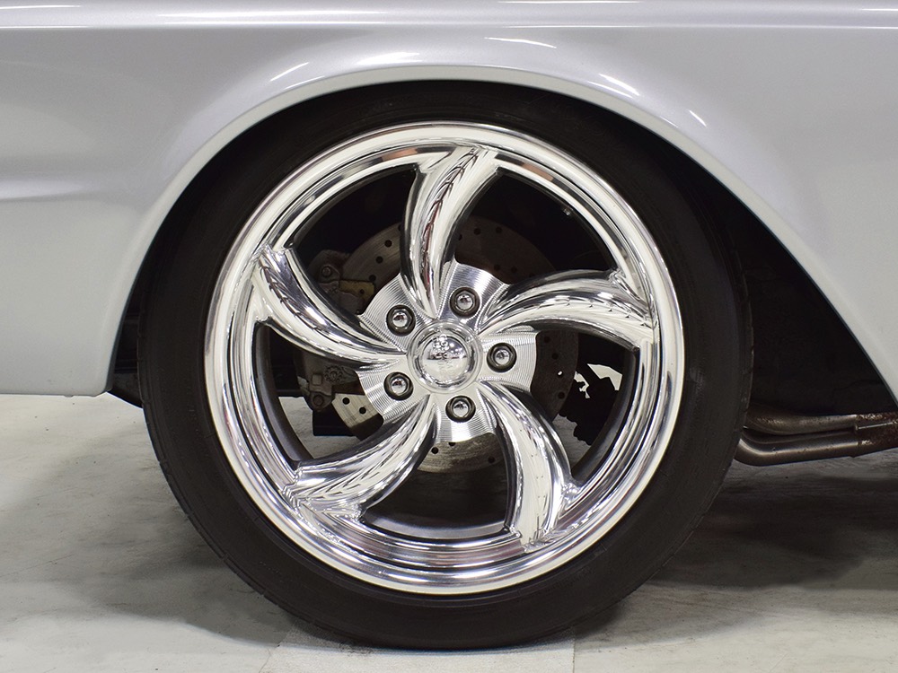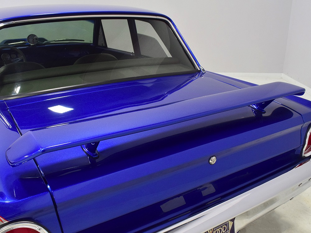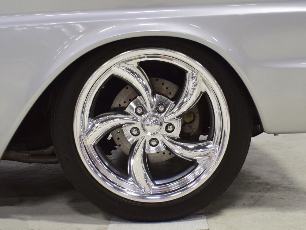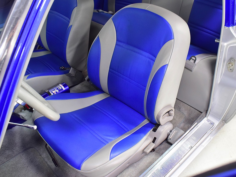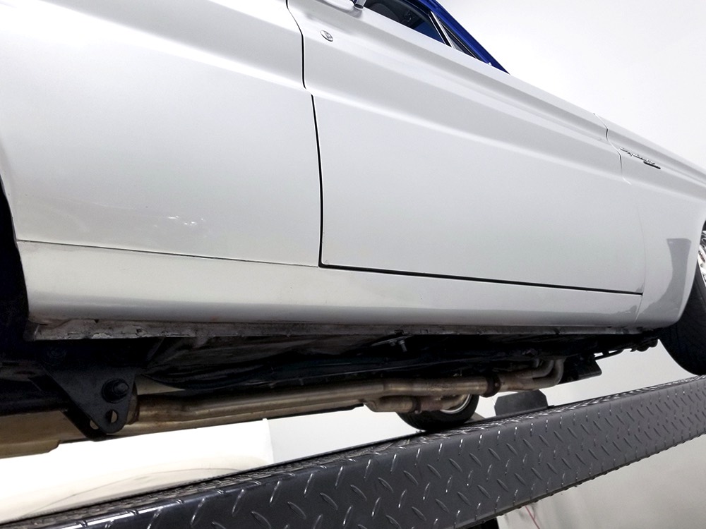 The Falcon was all-new in 1964, and the new look was a total home run. Looking more like a 7/8-scale Fairlane, the Falcon grew slightly and packed some muscle onto its formerly flyweight frame. Forward-canted front fenders and a pair of character lines stamped into the sheetmetal give it the illusion of motion, while the jet-inspired taillights remained a Ford trademark. Someone spent a great deal of money reworking this Falcon, starting with that awesome paint job. We believe it was finished 10 or 12 years ago, perhaps as a show car for the SEMA show (it’s full of JL Audio equipment and the JL Audio logo appears in several places on the car), and the two-tone combination still looks awesome. Laser-straight bodywork holds up under scrutiny and the electric blue paint seems to glow from within out in the sunlight. Graphics can be a make-or-break thing on a car like this, and they wisely chose to take a minimalist approach, adding some flames on the quarters just for effect, but not over done. Add in a teardrop hood inspired by the lightweight Thunderbolts and a modest wing on the deck lid and you get a car that looks right from any angle. Other neat details include the blue-dot high-intensity headlights, shaved emblems except the ‘Falcon’ badges on the front fenders, and nicely restored chrome bumpers.