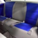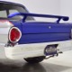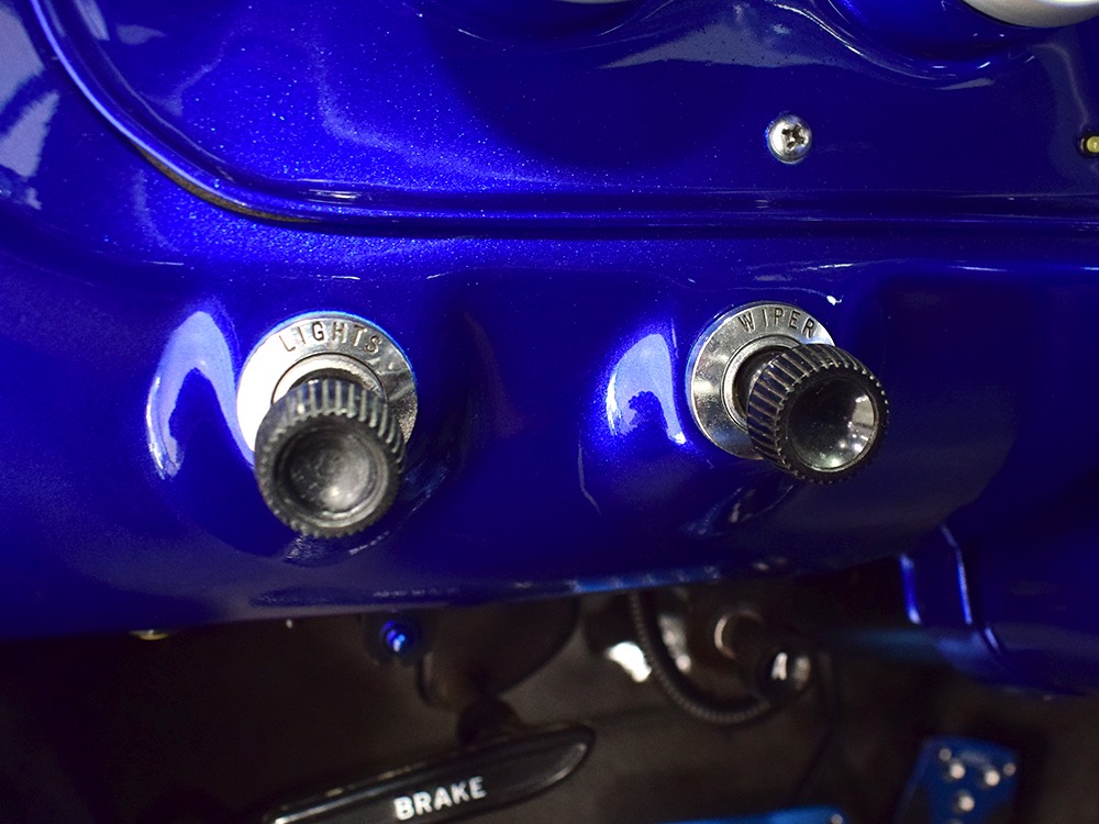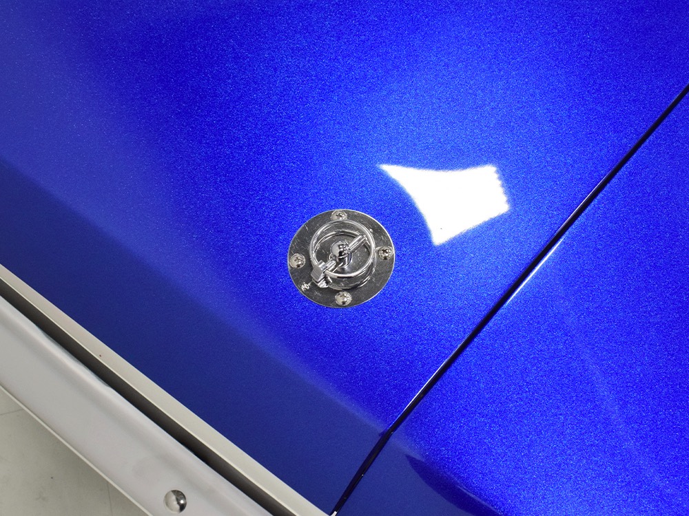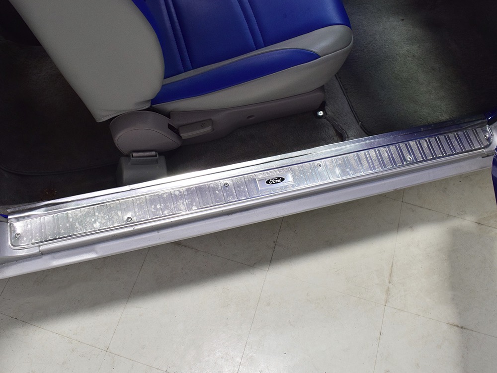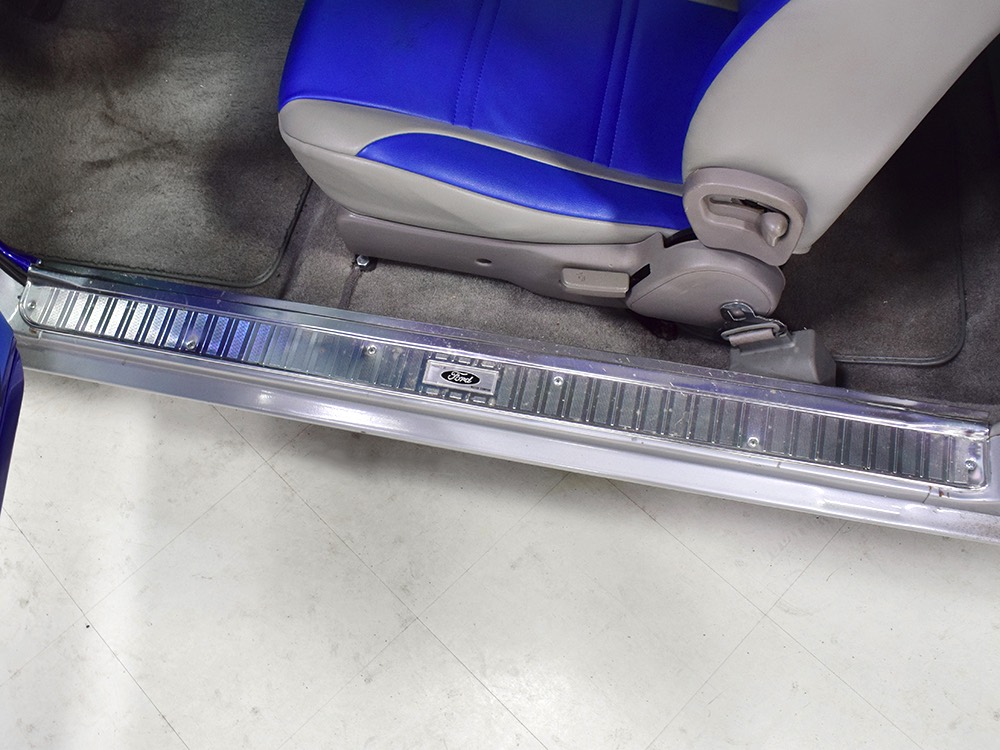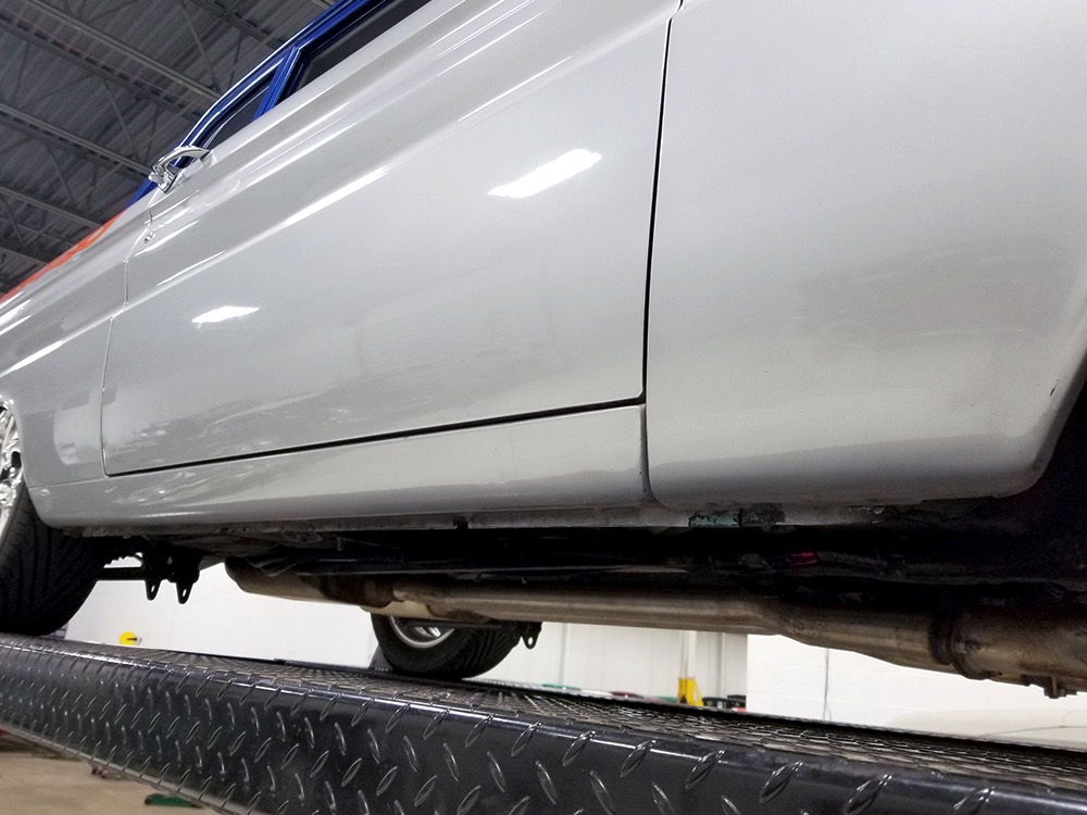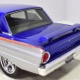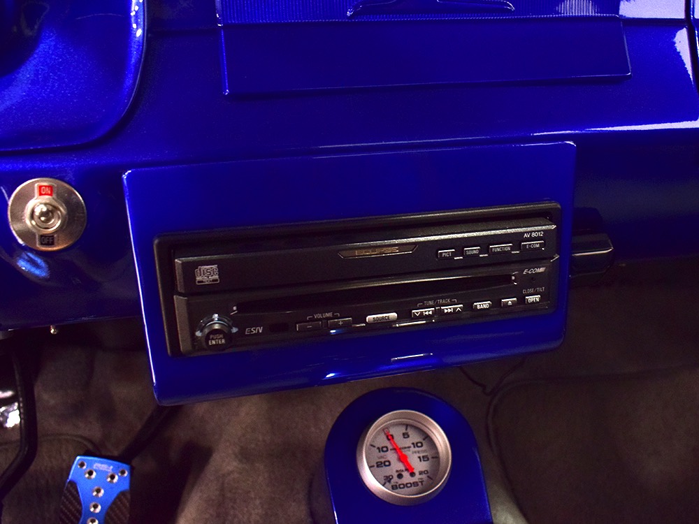The Falcon was all-new in 1964, and the new look was a total home run. Looking more like a 7/8-scale Fairlane, the Falcon grew slightly and packed some muscle onto its formerly flyweight frame. Forward-canted front fenders and a pair of character lines stamped into the sheetmetal give it the illusion of motion, while the jet-inspired taillights remained a Ford trademark. Someone spent a great deal of money reworking this Falcon, starting with that awesome paint job. We believe it was finished 10 or 12 years ago, perhaps as a show car for the SEMA show (it’s full of JL Audio equipment and the JL Audio logo appears in several places on the car), and the two-tone combination still looks awesome. Laser-straight bodywork holds up under scrutiny and the electric blue paint seems to glow from within out in the sunlight. Graphics can be a make-or-break thing on a car like this, and they wisely chose to take a minimalist approach, adding some flames on the quarters just for effect, but not over done. Add in a teardrop hood inspired by the lightweight Thunderbolts and a modest wing on the deck lid and you get a car that looks right from any angle. Other neat details include the blue-dot high-intensity headlights, shaved emblems except the ‘Falcon’ badges on the front fenders, and nicely restored chrome bumpers.