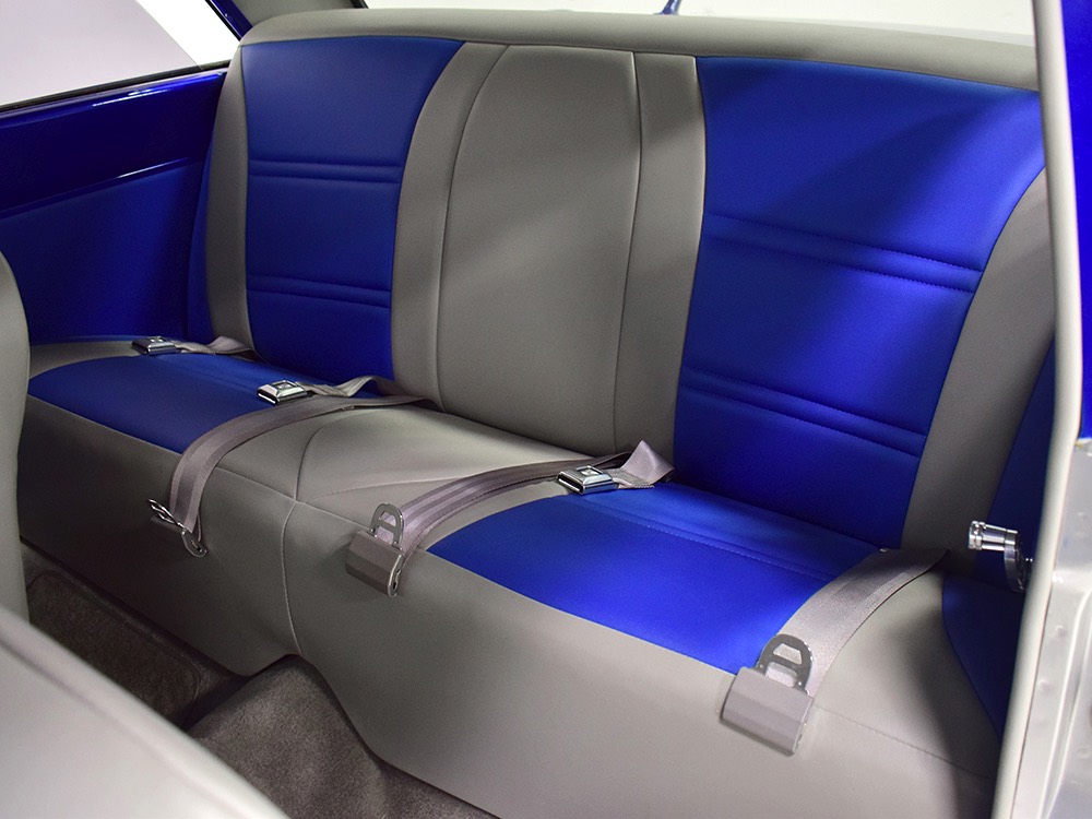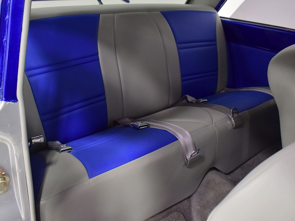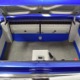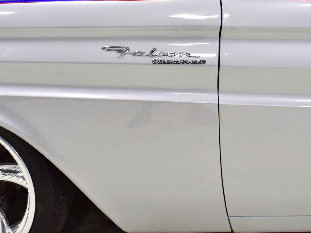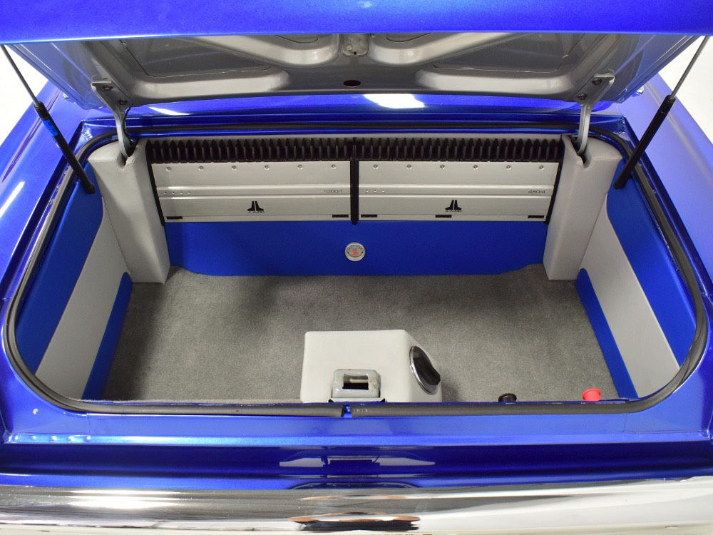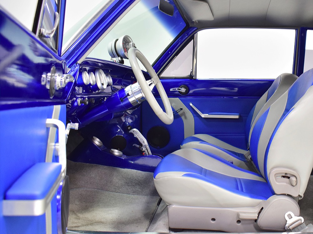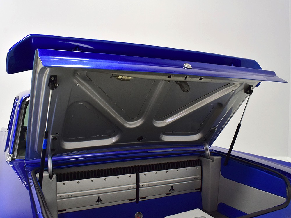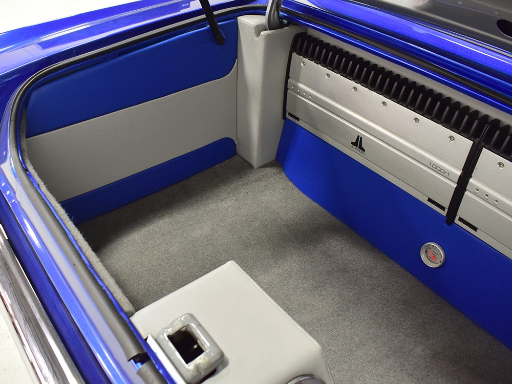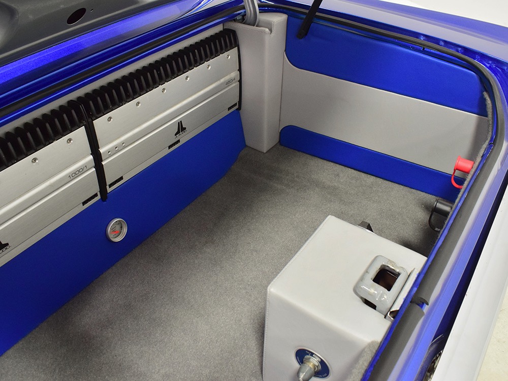 The blue and silver theme continues inside with a fully custom interior that’s a lot more comfortable than the original Falcon bench seat. Low-back buckets borrowed from a late-model and modified for use here look like they were born in the Falcon and they do a far better job of keeping you in place. The original dash was retained, albeit subtly reshaped and filled with Auto Meter gauges, including a big Monster tach on top of the dash where it belongs. A small center console was fabricated for the trick B&M shifter and another set of gauges: boost and transmission temperature. Even the fire extinguisher was color-matched to the bodywork. There’s a significant entertainment system, as you’d imagine, with a touch screen that folds out of the head unit in the center of the dash and a DVD player hidden under the passenger seat. They wisely retained the rear seat, making this a very usable hot rod and you can see that it’s highly detailed throughout, including the taut, wrinkle-free headliner and color-matched garnish moldings. And just check out that trunk! All the audio equipment was neatly installed to become part of the design so it can hide in plain sight, and there’s even a separate voltage gauge so the system can be monitored. Pneumatic struts hold the trunk open, which is a nice touch, and they thoughtfully added a set of charging posts for the two hidden batteries that power everything.