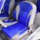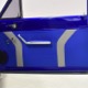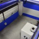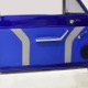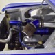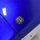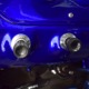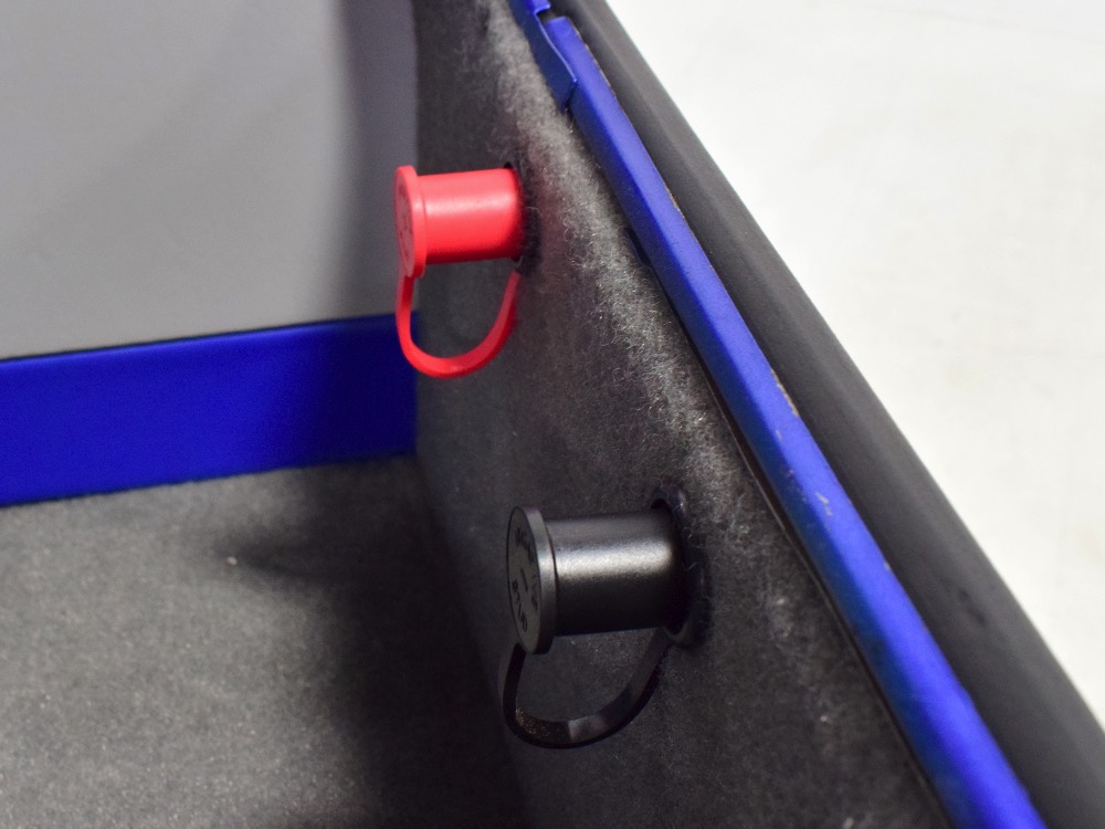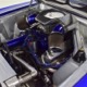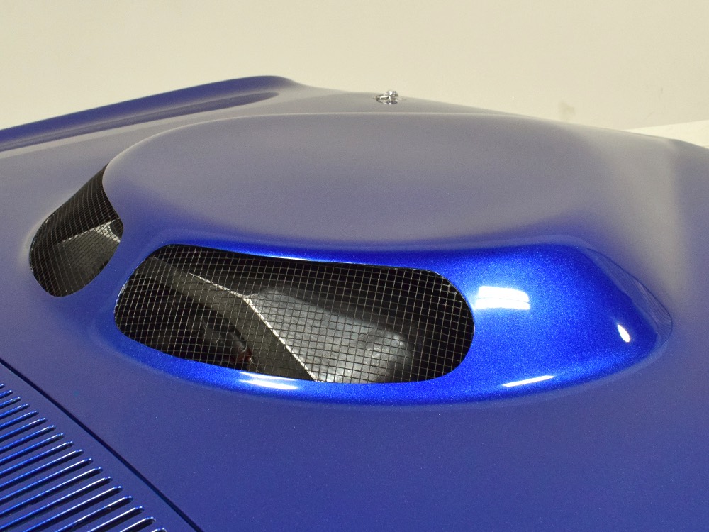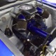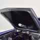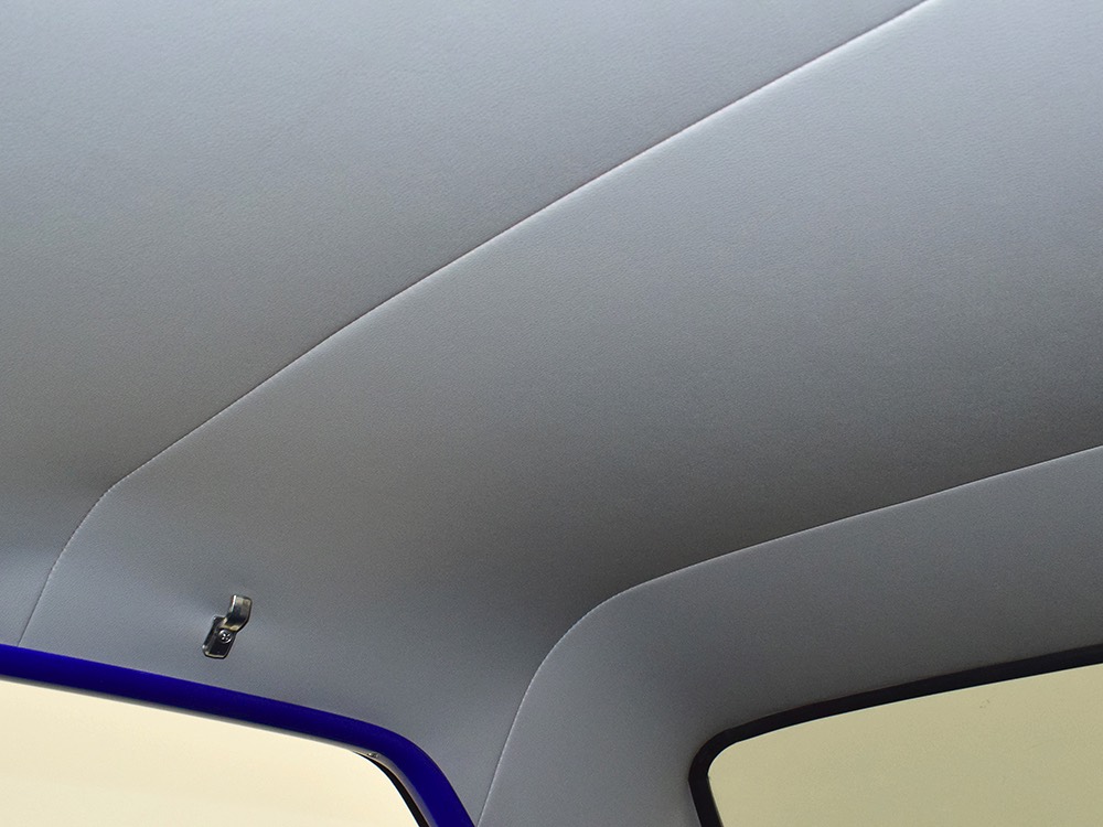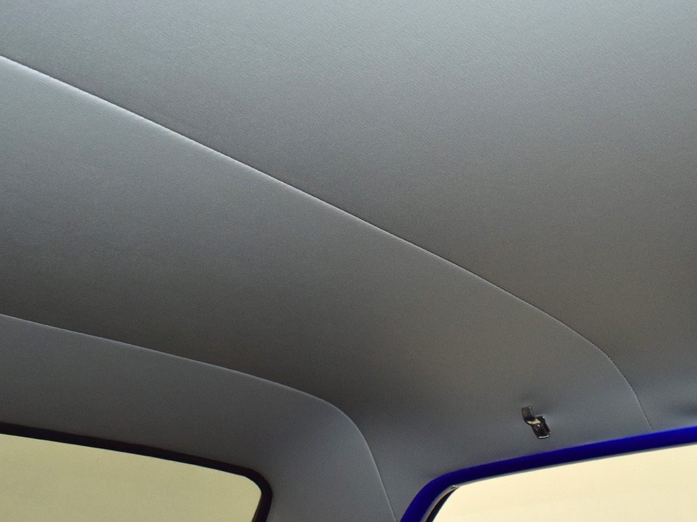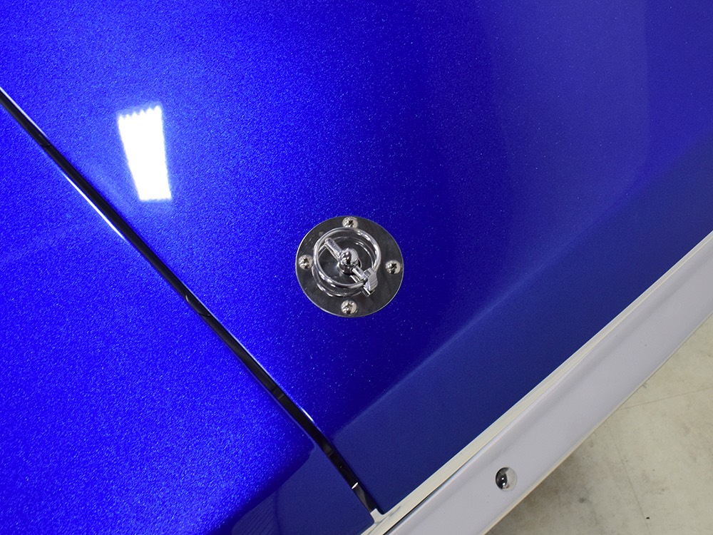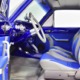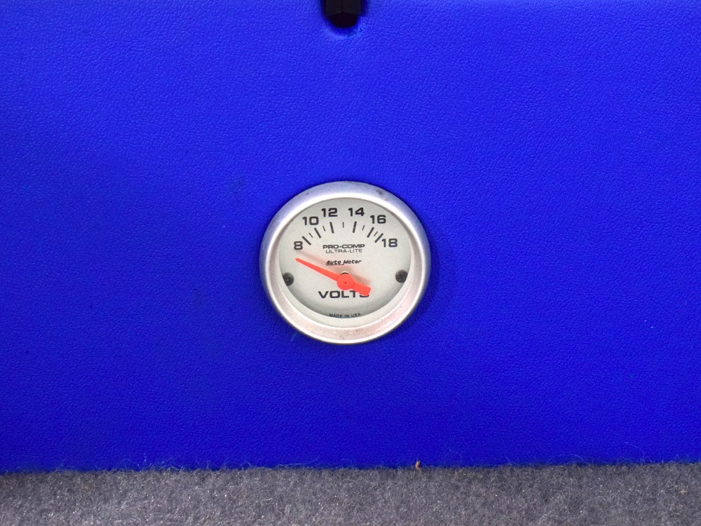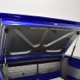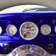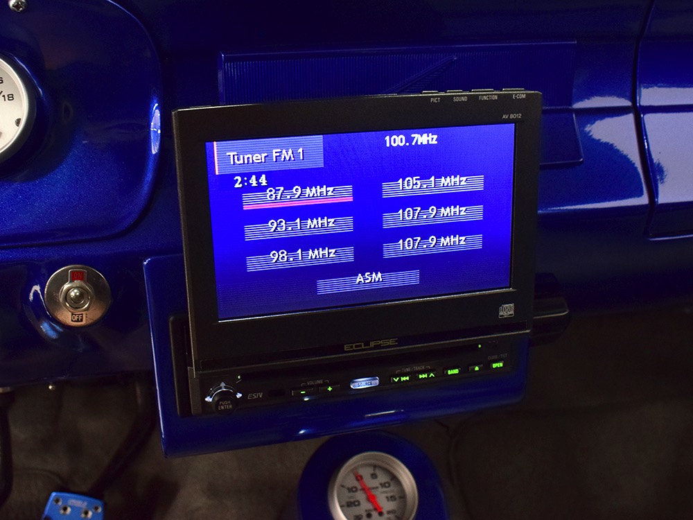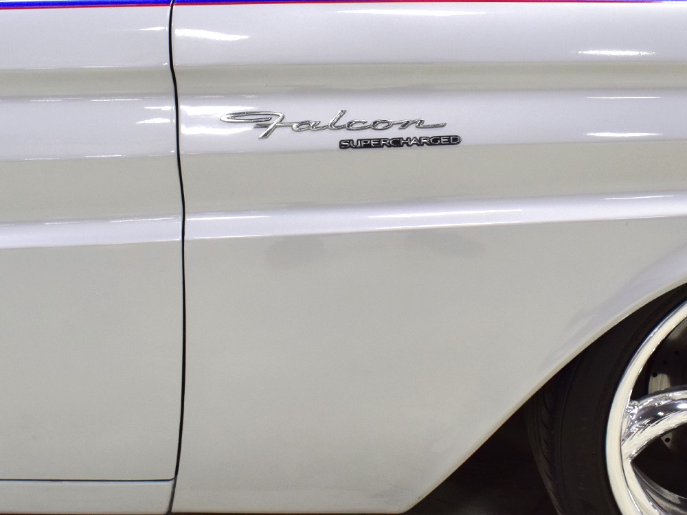 The blue and silver theme continues inside with a fully custom interior that’s a lot more comfortable than the original Falcon bench seat. Low-back buckets borrowed from a late-model and modified for use here look like they were born in the Falcon and they do a far better job of keeping you in place. The original dash was retained, albeit subtly reshaped and filled with Auto Meter gauges, including a big Monster tach on top of the dash where it belongs. A small center console was fabricated for the trick B&M shifter and another set of gauges: boost and transmission temperature. Even the fire extinguisher was color-matched to the bodywork. There’s a significant entertainment system, as you’d imagine, with a touch screen that folds out of the head unit in the center of the dash and a DVD player hidden under the passenger seat. They wisely retained the rear seat, making this a very usable hot rod and you can see that it’s highly detailed throughout, including the taut, wrinkle-free headliner and color-matched garnish moldings. And just check out that trunk! All the audio equipment was neatly installed to become part of the design so it can hide in plain sight, and there’s even a separate voltage gauge so the system can be monitored. Pneumatic struts hold the trunk open, which is a nice touch, and they thoughtfully added a set of charging posts for the two hidden batteries that power everything.