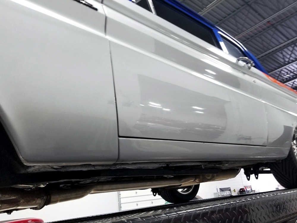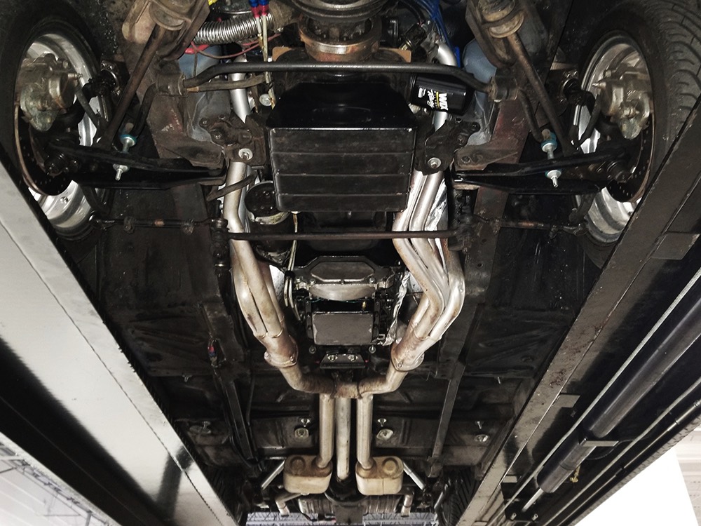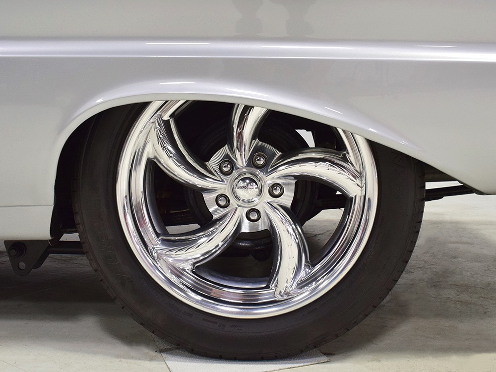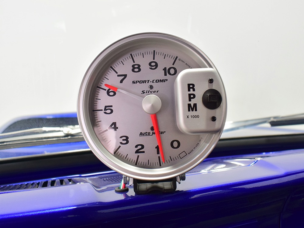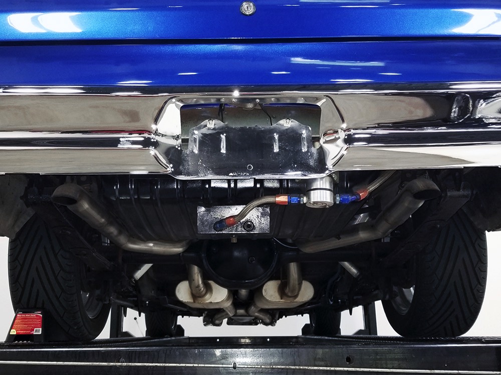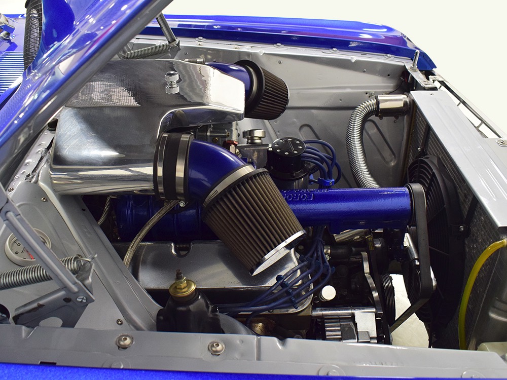 Underneath you can tell it has been driven and enjoyed properly, but there’s also a lot more high-quality workmanship. Subframe connectors reinforce the tub in a way that you can actually feel and it has been fitted with vented and cross-drilled disc brakes that are a big step up from the puny 9-inch drums it carried originally. The C4 3-speed automatic transmission has a 2200 RPM stall torque converter and a reverse manual valve body, so you’ll need to yank that shifter through the gears yourself—don’t worry, it’s fun. 4.11 gears in the 8-inch rear end make it punchy as hell, and traction bars on the rear springs help plant the tires to get the power where it needs to go. The entire fuel system was plumbed in -10 AN braided stainless to feed the blown V8. You’ll also note the original gas tank was fitted with a custom sump and an electric fuel pump to supply the go-juice. Nothing exotic, just proven hardware that’s sorted out and works like it should. The stance is exactly right, too, complements of Colorado Custom wheels measuring 17x7 in front and 18x8 in back and wearing staggered 205/50/17 and 235/50/18 Yokohama radials.