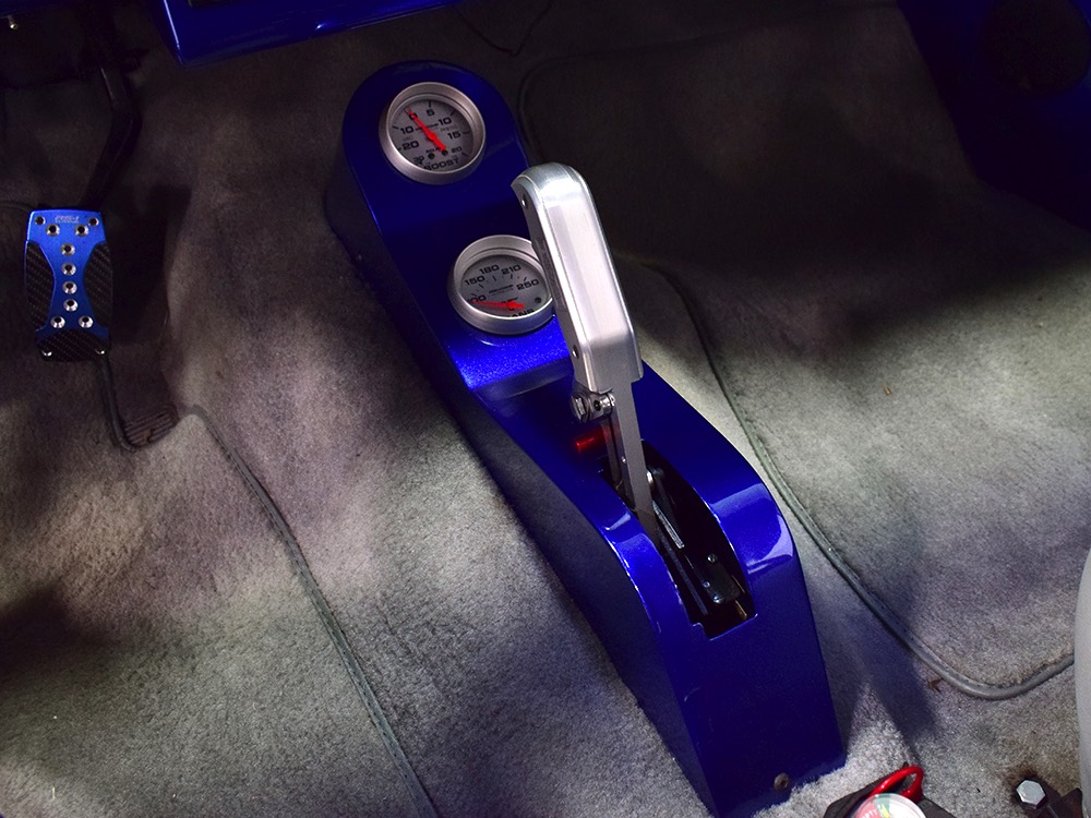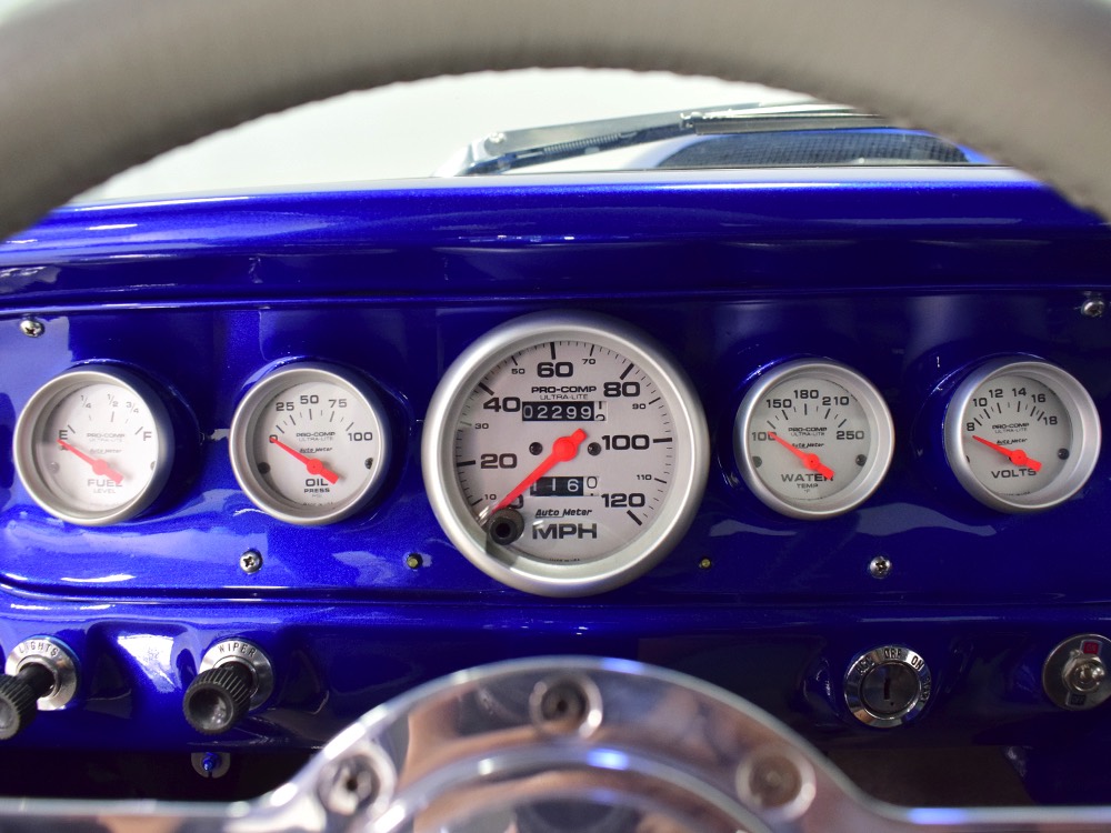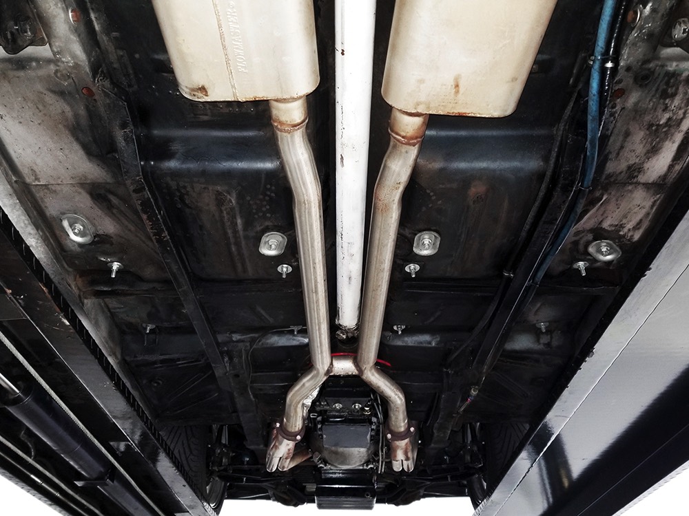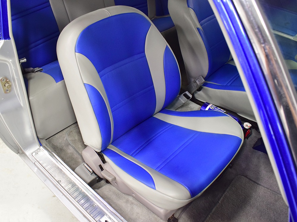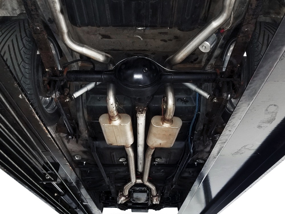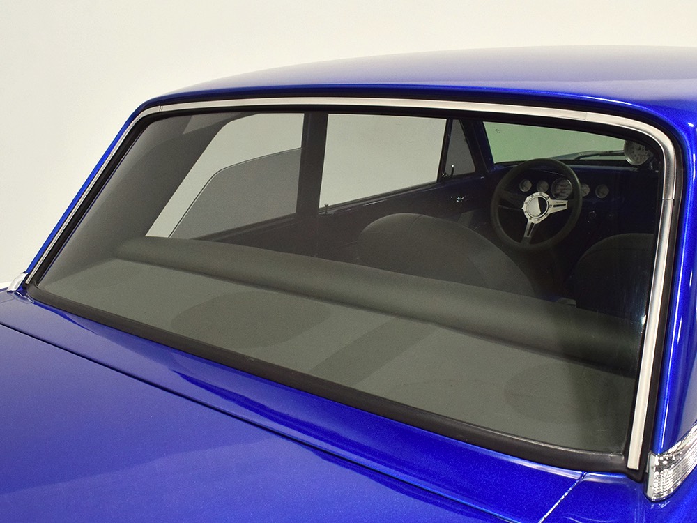 Underneath you can tell it has been driven and enjoyed properly, but there’s also a lot more high-quality workmanship. Subframe connectors reinforce the tub in a way that you can actually feel and it has been fitted with vented and cross-drilled disc brakes that are a big step up from the puny 9-inch drums it carried originally. The C4 3-speed automatic transmission has a 2200 RPM stall torque converter and a reverse manual valve body, so you’ll need to yank that shifter through the gears yourself—don’t worry, it’s fun. 4.11 gears in the 8-inch rear end make it punchy as hell, and traction bars on the rear springs help plant the tires to get the power where it needs to go. The entire fuel system was plumbed in -10 AN braided stainless to feed the blown V8. You’ll also note the original gas tank was fitted with a custom sump and an electric fuel pump to supply the go-juice. Nothing exotic, just proven hardware that’s sorted out and works like it should. The stance is exactly right, too, complements of Colorado Custom wheels measuring 17x7 in front and 18x8 in back and wearing staggered 205/50/17 and 235/50/18 Yokohama radials.