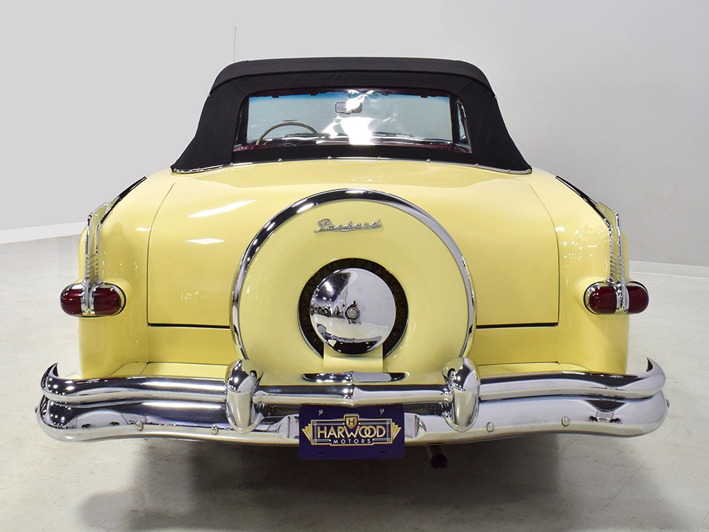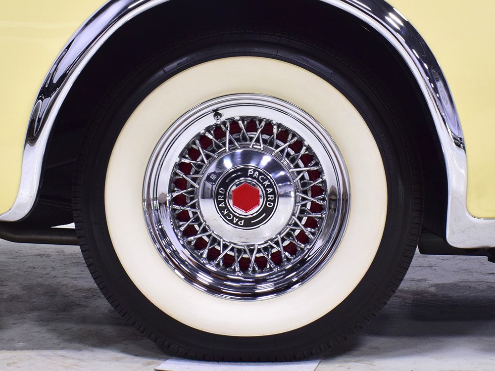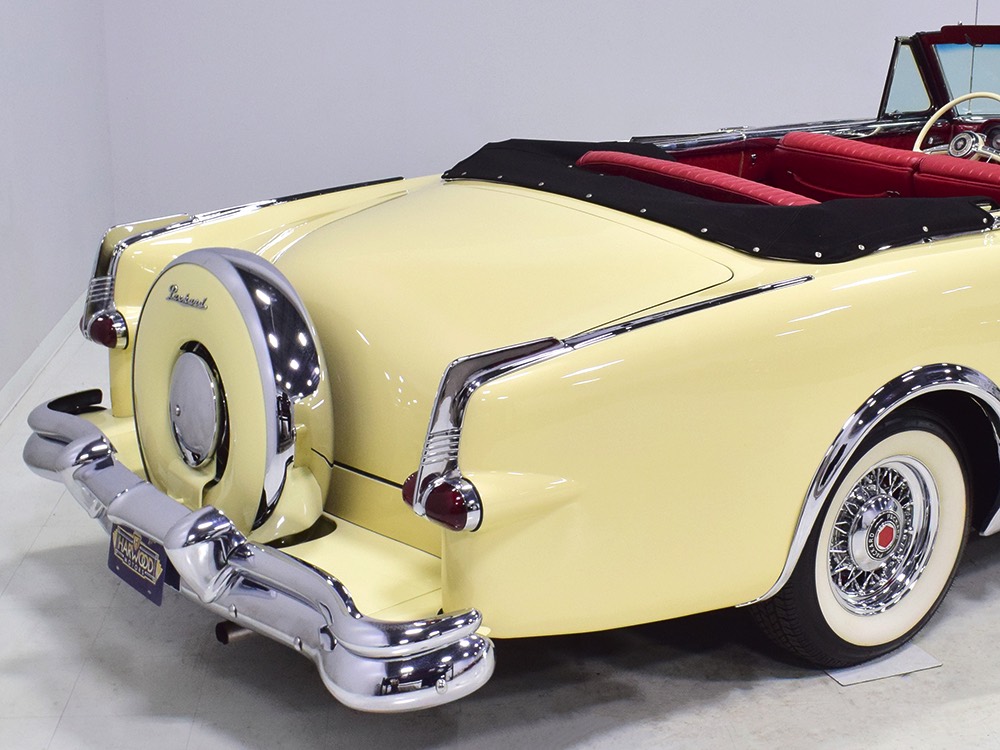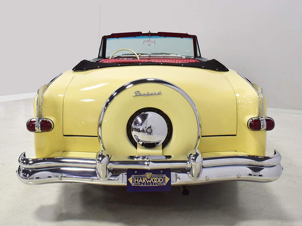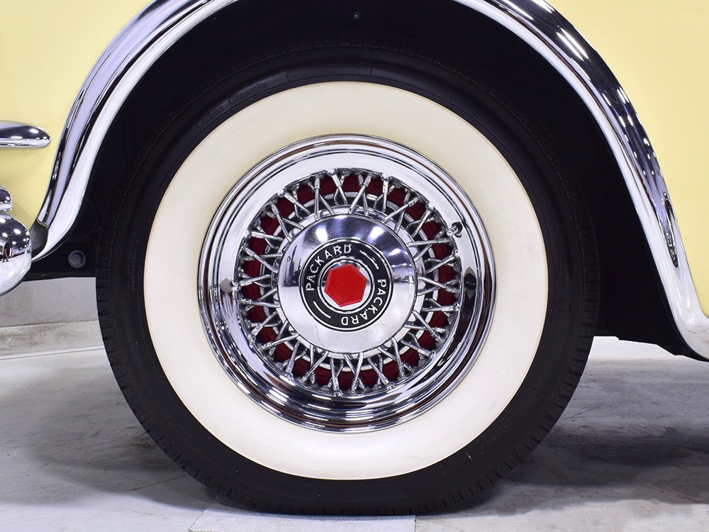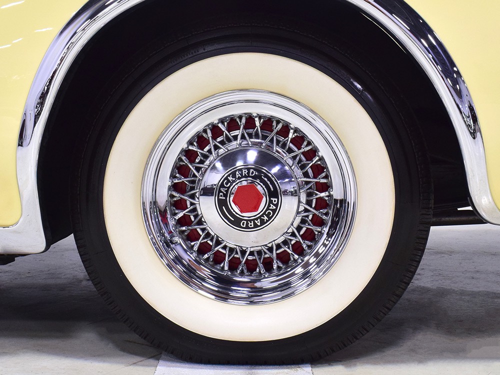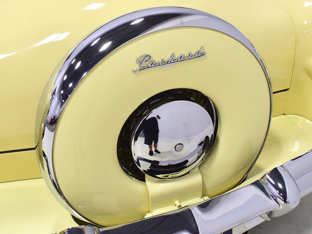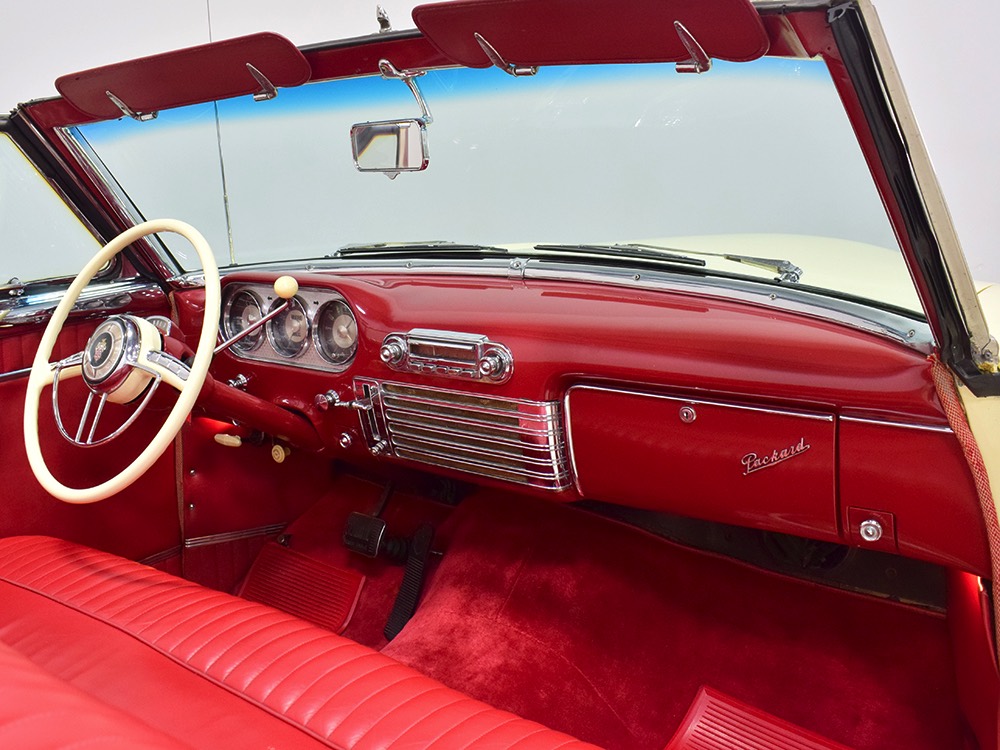 The red leather interior is exactly the right choice with the Ivory bodywork, creating a flashy yet sophisticated contrast that feels sporting not dated. The hides are in great condition with only minimal signs of use and no tears, splits, or scuffs on the seating surfaces. Matching red carpets are deep and plush, helping to keep the interior quiet and comfortable and the simple door panels are an exercise in good taste and restraint. The standard Packard dashboard puts a three-gauge pod ahead of the driver, and this car carries original, unrestored gauges that are the only part of the interior that hasn’t been freshened. All the gauges work except the speedometer and clock, and things like the innovative warning lights, heater/defroster, and even the radio and power antenna are fully operational. The big ivory plastic steering wheel has obviously been restored and shows quite well with no cracking and the horn ring looks good, showing only very, very minor pitting that suggests it’s original. Packard logo floor mats protect those plush carpets and this car is equipped with optional power windows that all go up and down easily and the power seat works as it should. There’s also a black canvas power convertible top that folds easily and stows under a matching black boot, and we have to admit that this is one great-looking convertible. The trunk is positively massive and has been trimmed with matching red carpets—note that the spare tire well is still in place but obviously the spare tire is on the rear bumper in the continental kit.