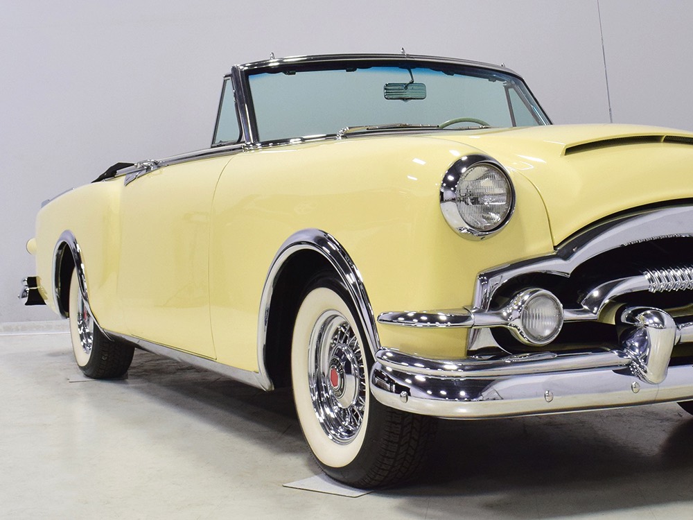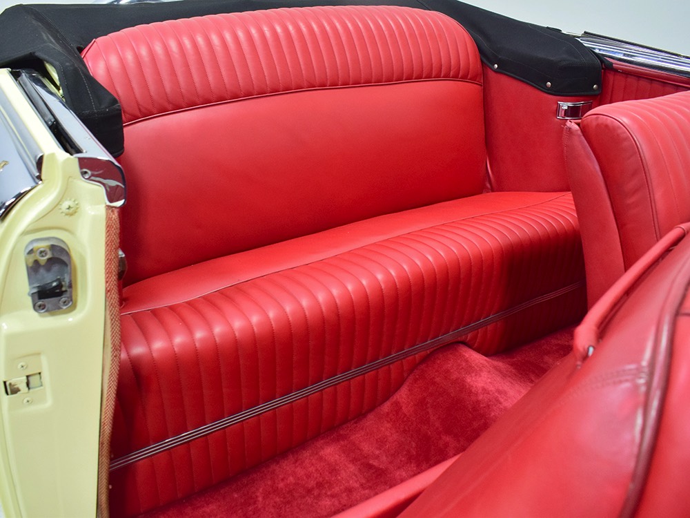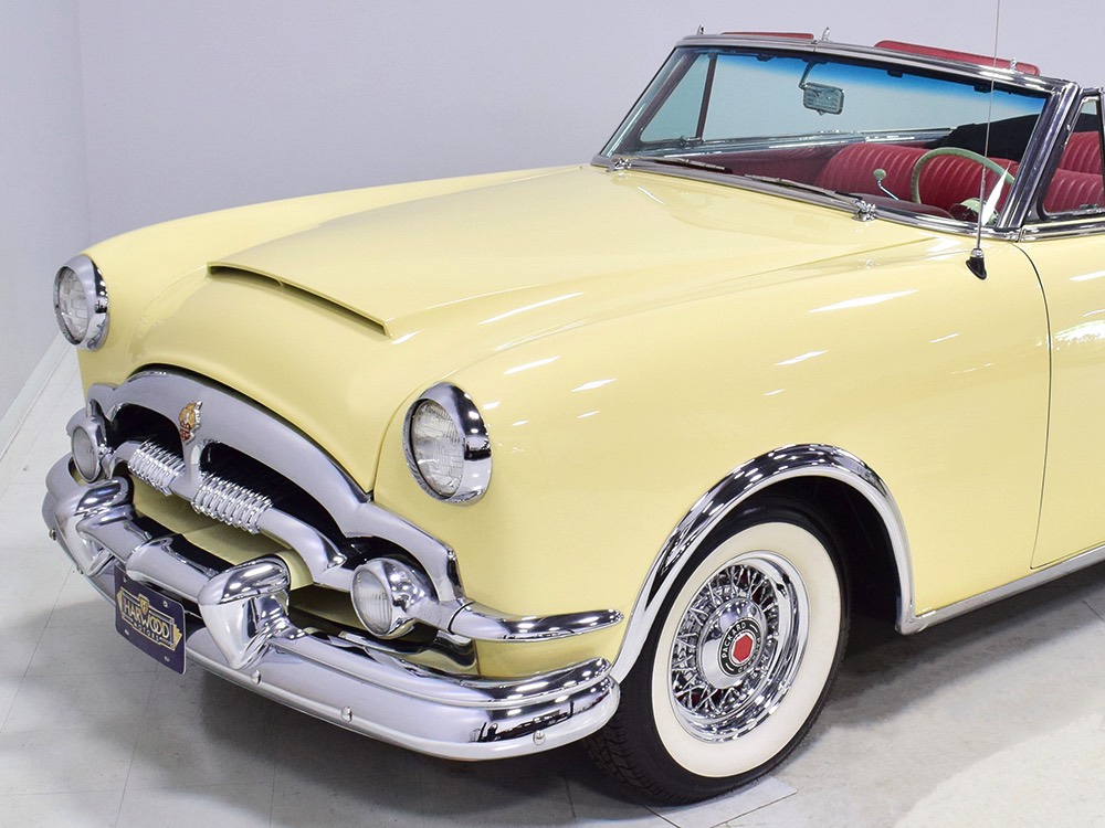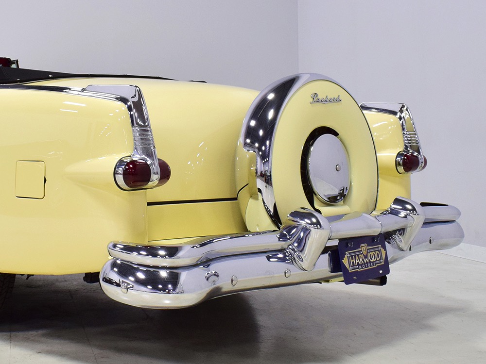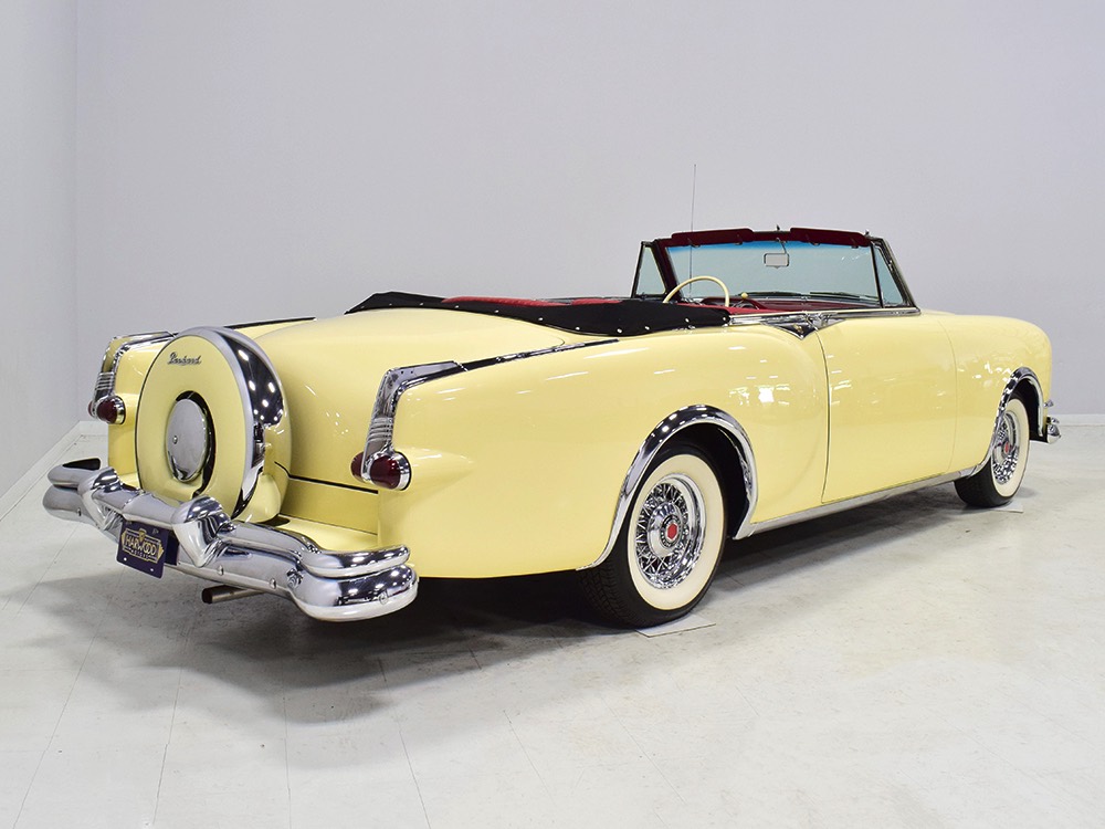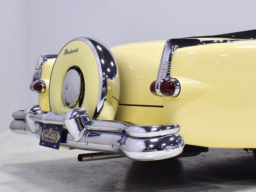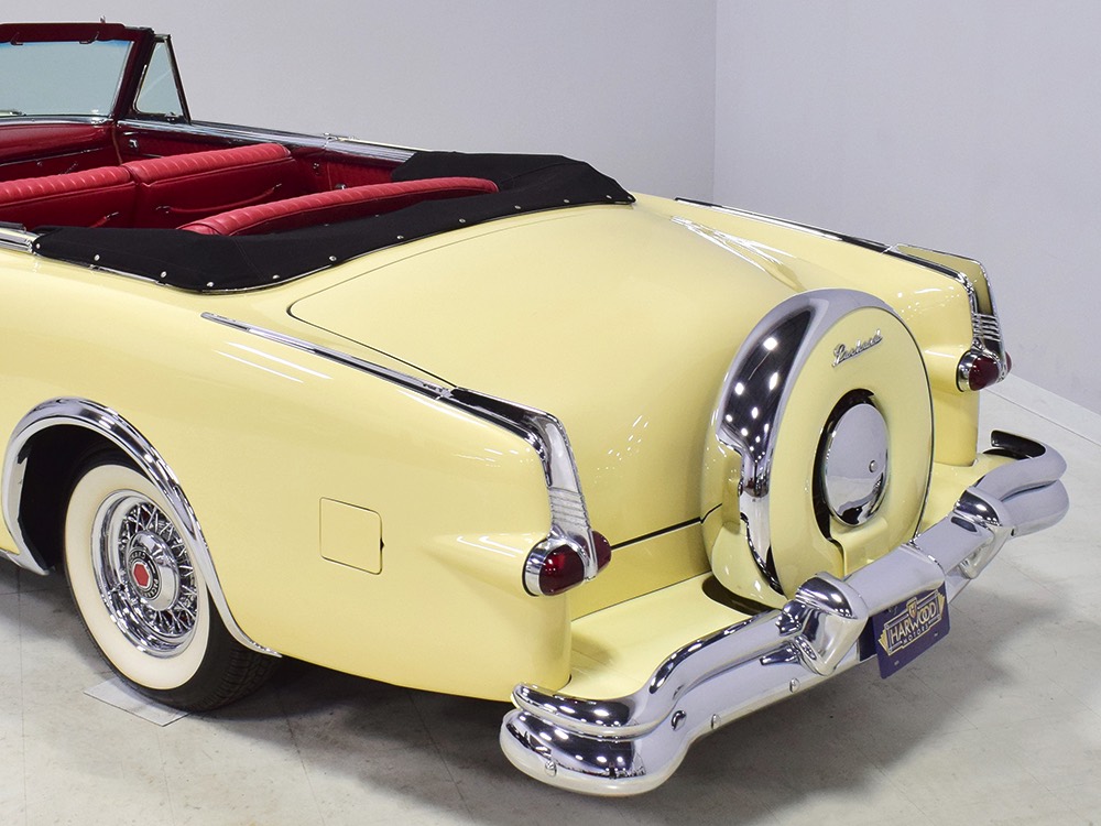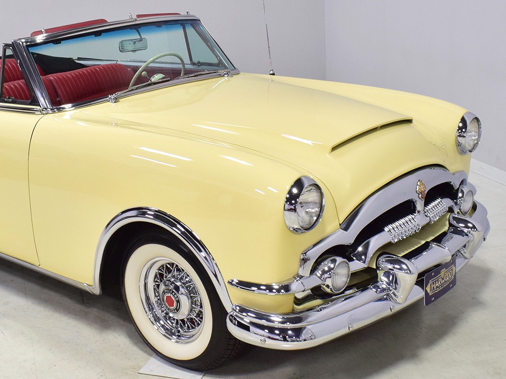 The red leather interior is exactly the right choice with the Ivory bodywork, creating a flashy yet sophisticated contrast that feels sporting not dated. The hides are in great condition with only minimal signs of use and no tears, splits, or scuffs on the seating surfaces. Matching red carpets are deep and plush, helping to keep the interior quiet and comfortable and the simple door panels are an exercise in good taste and restraint. The standard Packard dashboard puts a three-gauge pod ahead of the driver, and this car carries original, unrestored gauges that are the only part of the interior that hasn’t been freshened. All the gauges work except the speedometer and clock, and things like the innovative warning lights, heater/defroster, and even the radio and power antenna are fully operational. The big ivory plastic steering wheel has obviously been restored and shows quite well with no cracking and the horn ring looks good, showing only very, very minor pitting that suggests it’s original. Packard logo floor mats protect those plush carpets and this car is equipped with optional power windows that all go up and down easily and the power seat works as it should. There’s also a black canvas power convertible top that folds easily and stows under a matching black boot, and we have to admit that this is one great-looking convertible. The trunk is positively massive and has been trimmed with matching red carpets—note that the spare tire well is still in place but obviously the spare tire is on the rear bumper in the continental kit.
