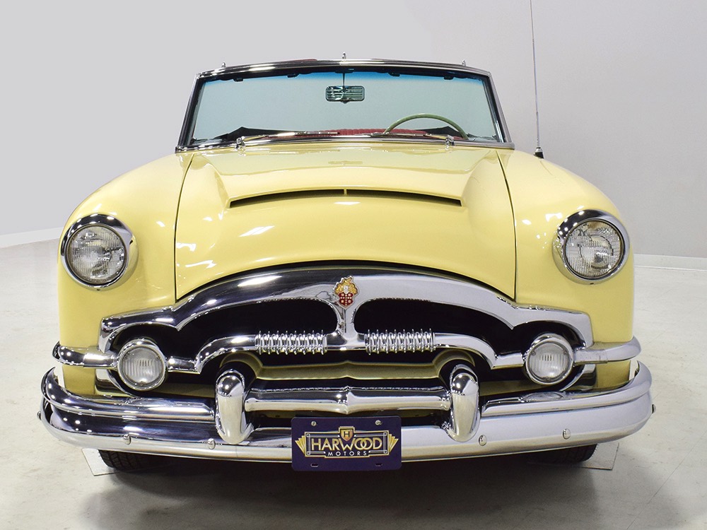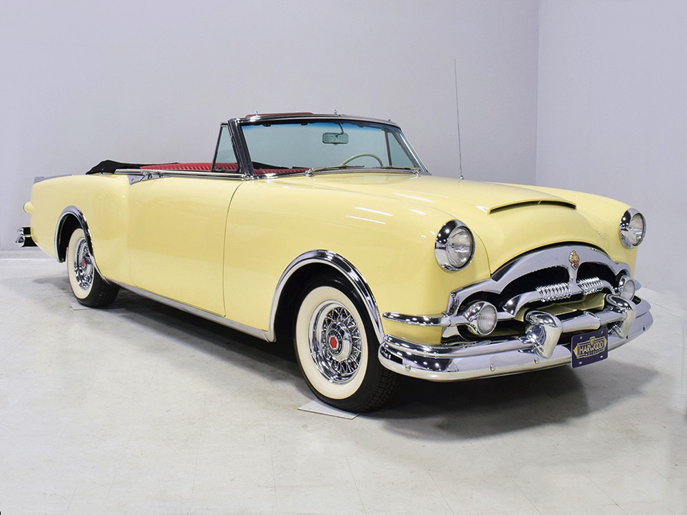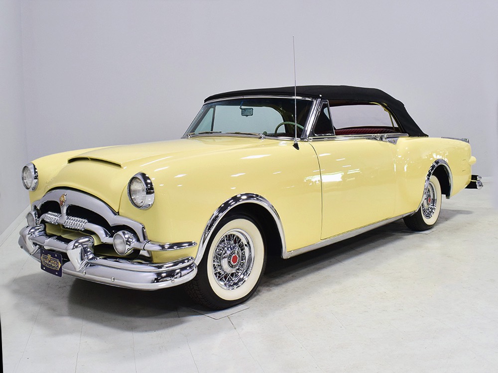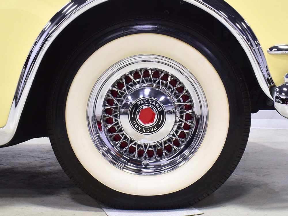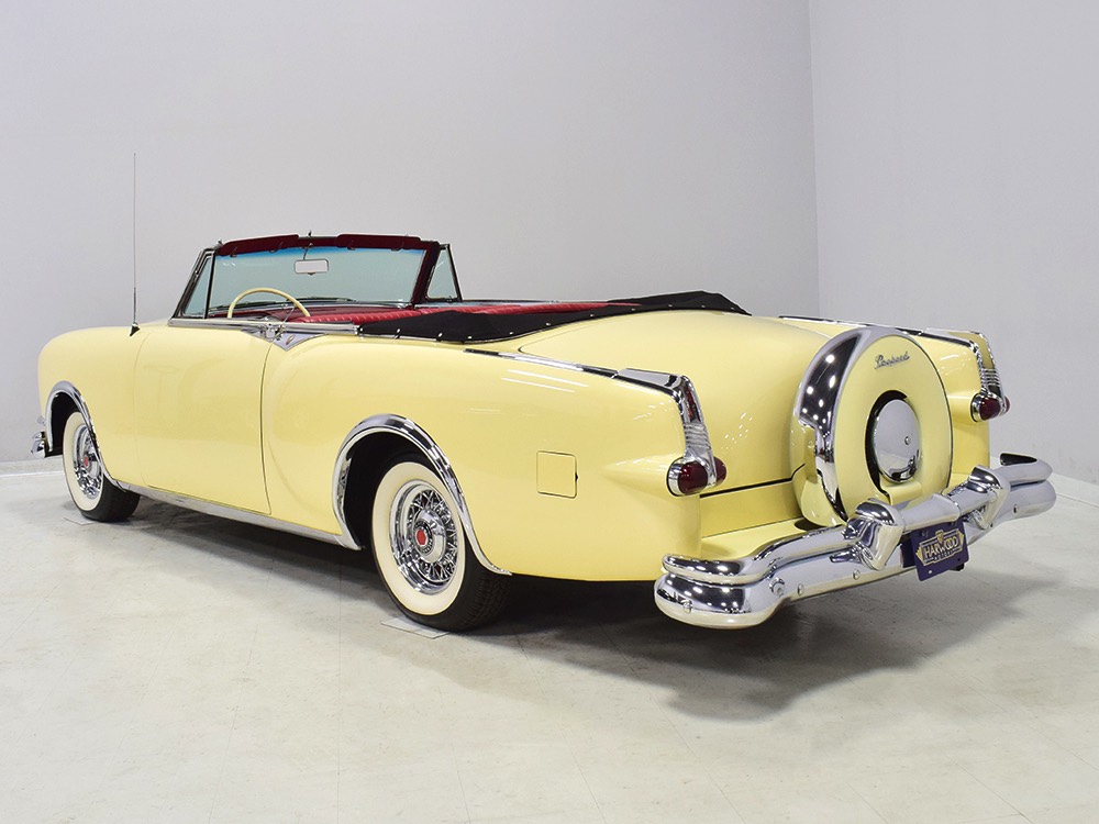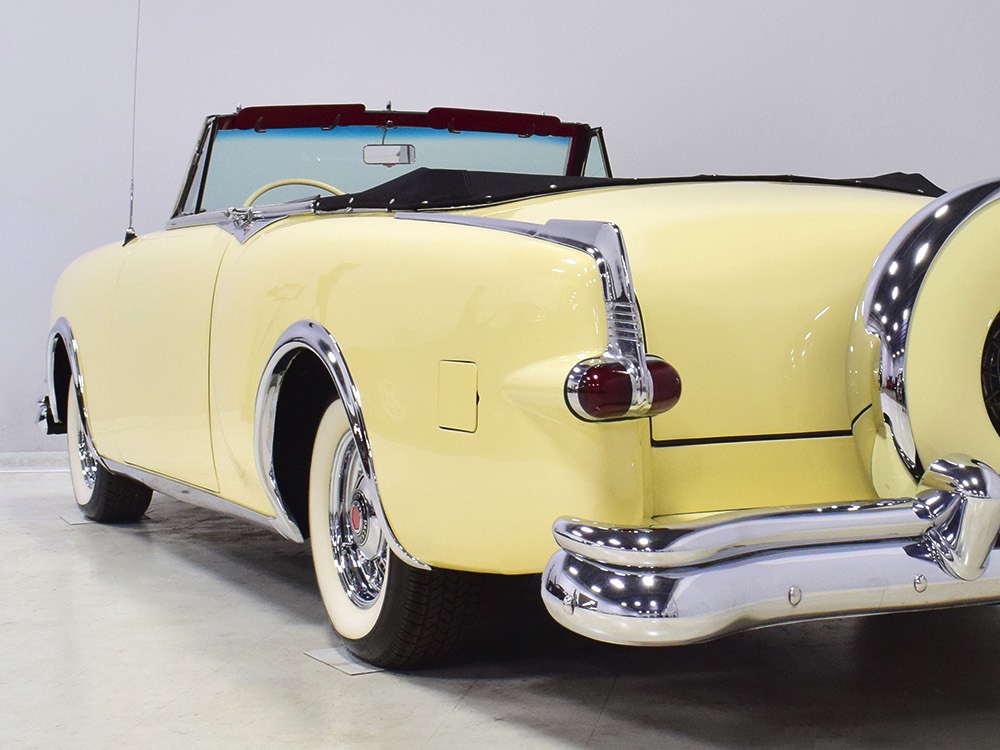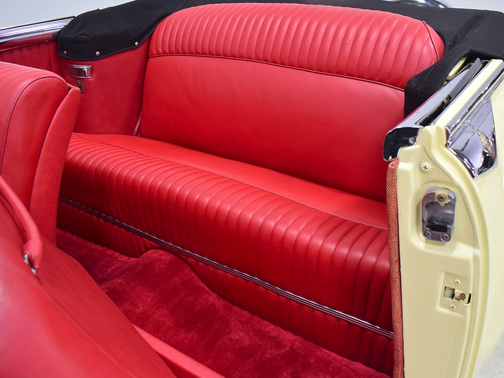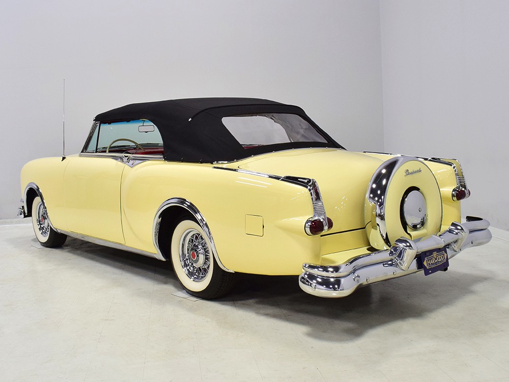 The red leather interior is exactly the right choice with the Ivory bodywork, creating a flashy yet sophisticated contrast that feels sporting not dated. The hides are in great condition with only minimal signs of use and no tears, splits, or scuffs on the seating surfaces. Matching red carpets are deep and plush, helping to keep the interior quiet and comfortable and the simple door panels are an exercise in good taste and restraint. The standard Packard dashboard puts a three-gauge pod ahead of the driver, and this car carries original, unrestored gauges that are the only part of the interior that hasn’t been freshened. All the gauges work except the speedometer and clock, and things like the innovative warning lights, heater/defroster, and even the radio and power antenna are fully operational. The big ivory plastic steering wheel has obviously been restored and shows quite well with no cracking and the horn ring looks good, showing only very, very minor pitting that suggests it’s original. Packard logo floor mats protect those plush carpets and this car is equipped with optional power windows that all go up and down easily and the power seat works as it should. There’s also a black canvas power convertible top that folds easily and stows under a matching black boot, and we have to admit that this is one great-looking convertible. The trunk is positively massive and has been trimmed with matching red carpets—note that the spare tire well is still in place but obviously the spare tire is on the rear bumper in the continental kit.
