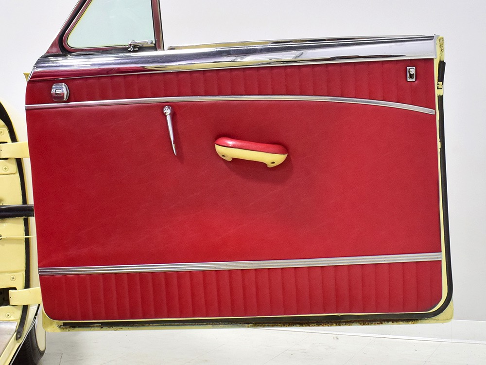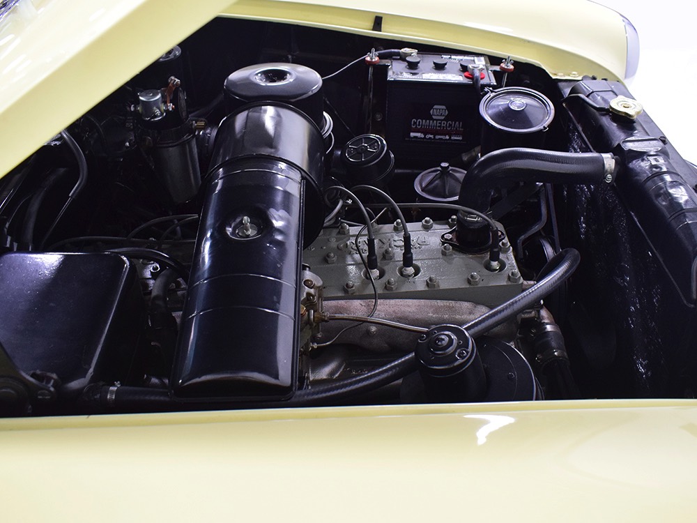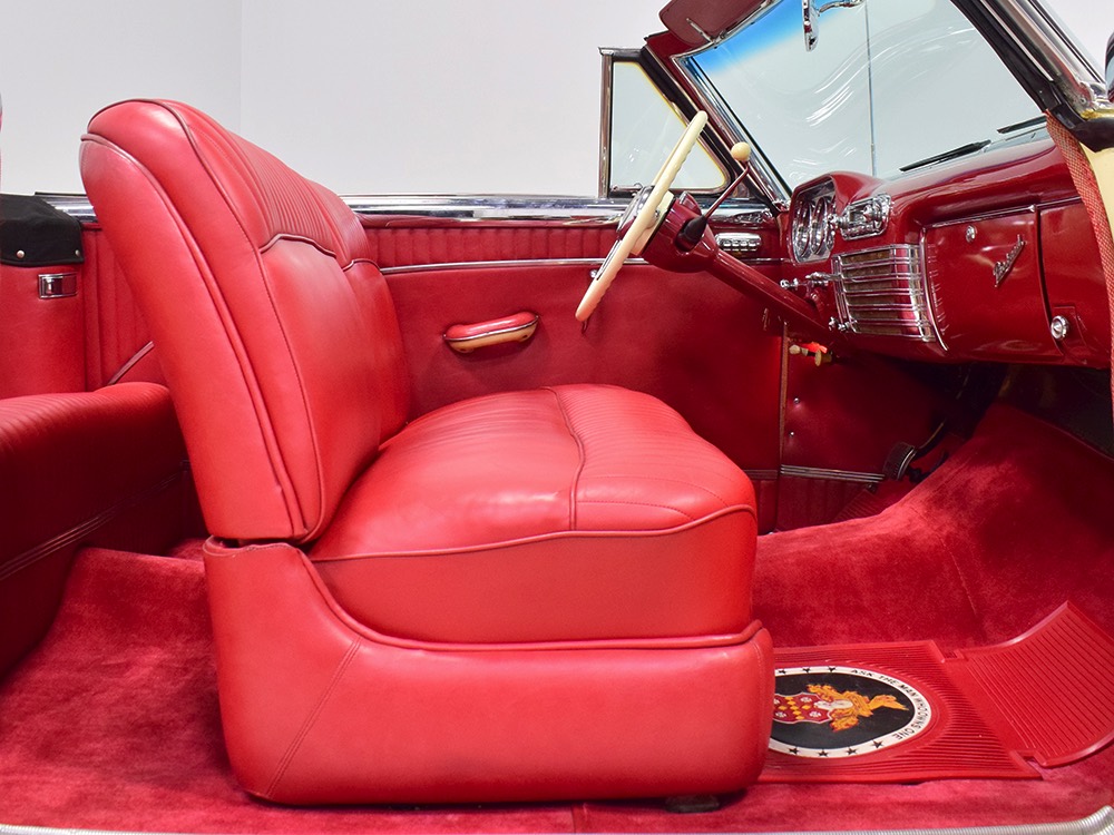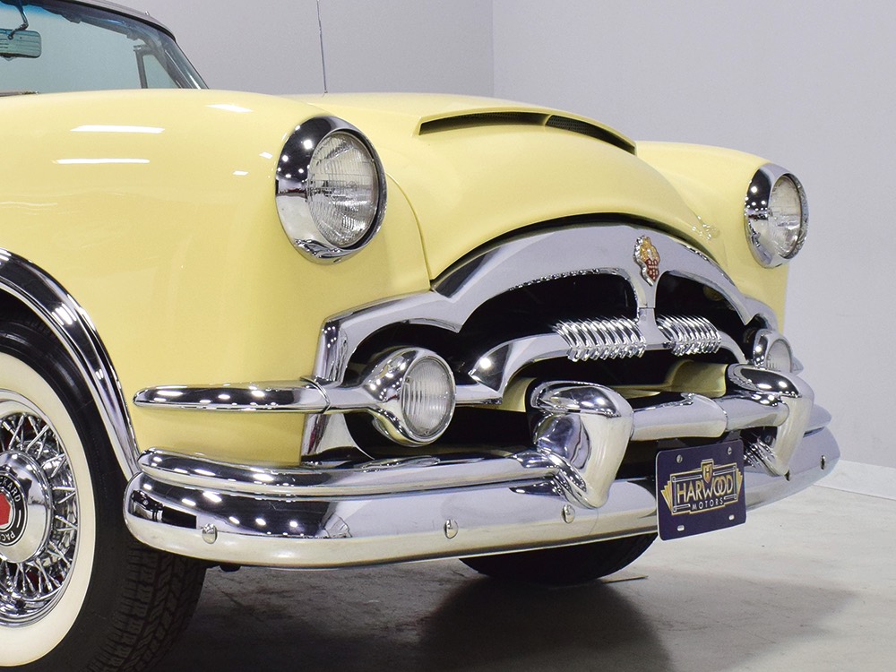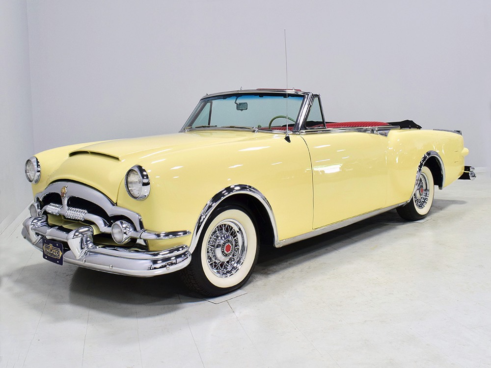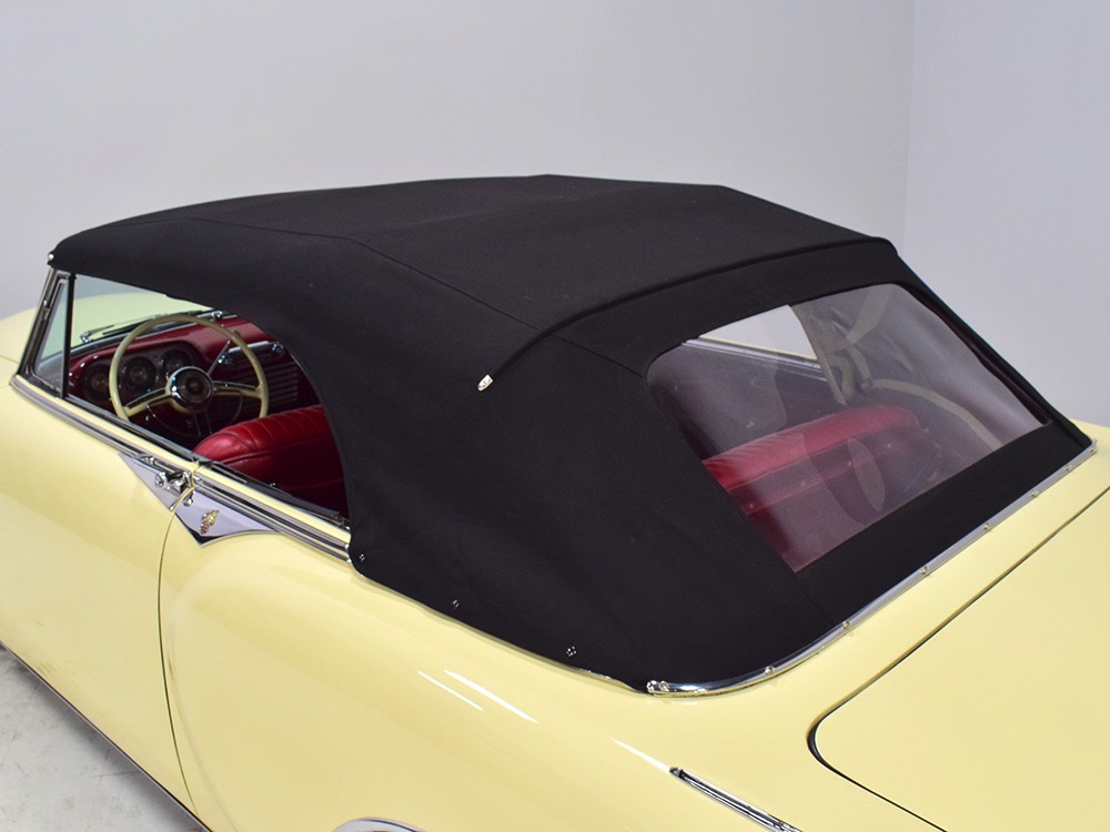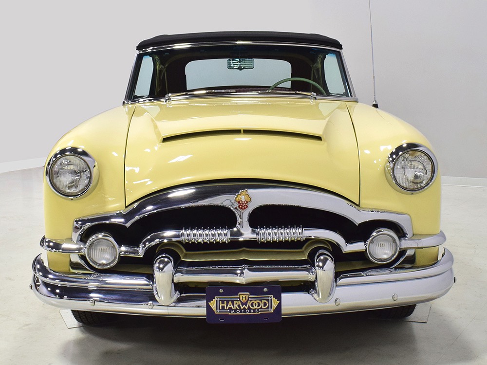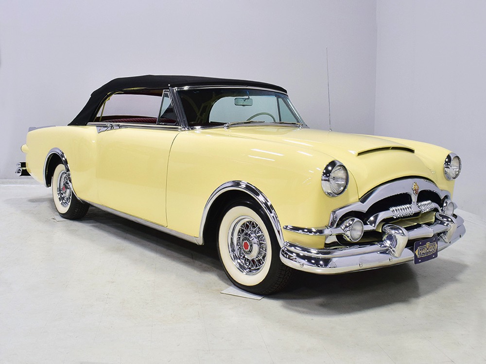 The red leather interior is exactly the right choice with the Ivory bodywork, creating a flashy yet sophisticated contrast that feels sporting not dated. The hides are in great condition with only minimal signs of use and no tears, splits, or scuffs on the seating surfaces. Matching red carpets are deep and plush, helping to keep the interior quiet and comfortable and the simple door panels are an exercise in good taste and restraint. The standard Packard dashboard puts a three-gauge pod ahead of the driver, and this car carries original, unrestored gauges that are the only part of the interior that hasn’t been freshened. All the gauges work except the speedometer and clock, and things like the innovative warning lights, heater/defroster, and even the radio and power antenna are fully operational. The big ivory plastic steering wheel has obviously been restored and shows quite well with no cracking and the horn ring looks good, showing only very, very minor pitting that suggests it’s original. Packard logo floor mats protect those plush carpets and this car is equipped with optional power windows that all go up and down easily and the power seat works as it should. There’s also a black canvas power convertible top that folds easily and stows under a matching black boot, and we have to admit that this is one great-looking convertible. The trunk is positively massive and has been trimmed with matching red carpets—note that the spare tire well is still in place but obviously the spare tire is on the rear bumper in the continental kit.