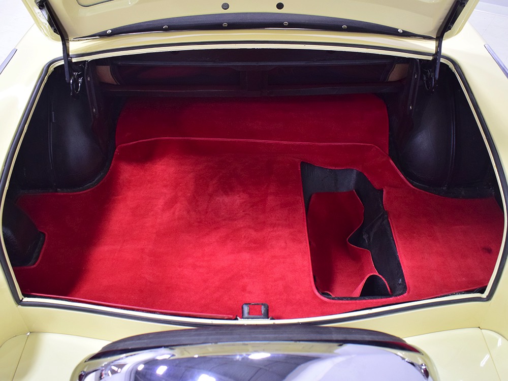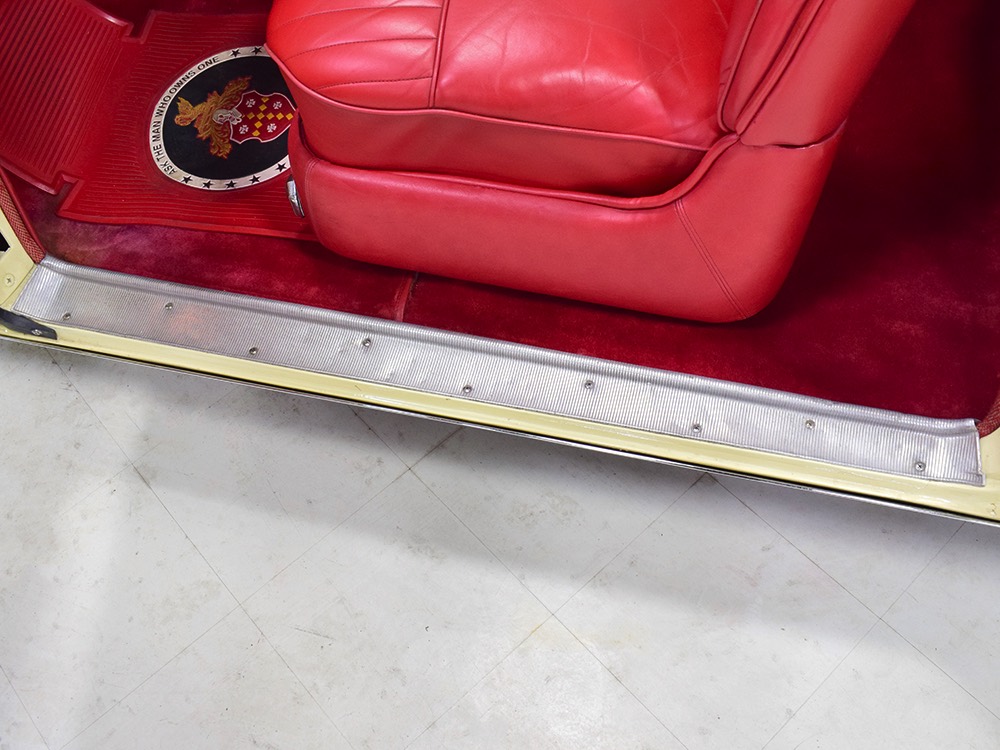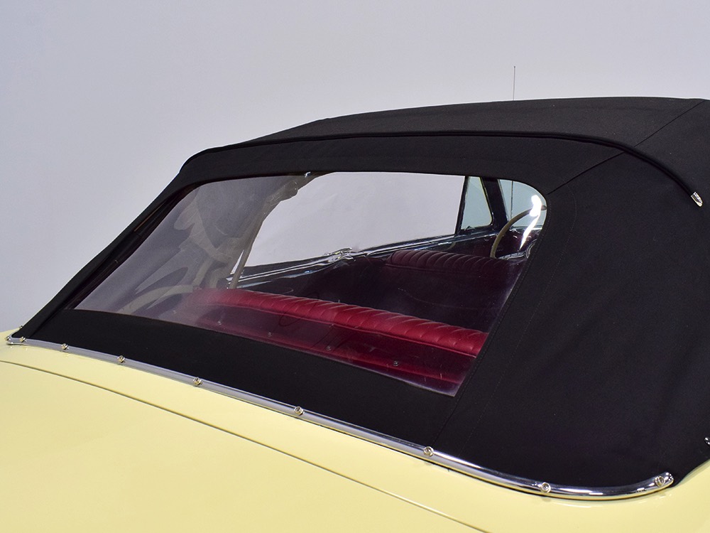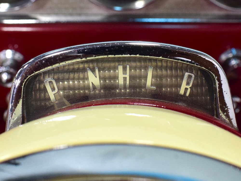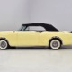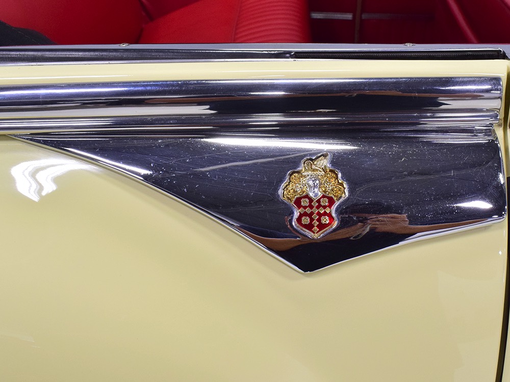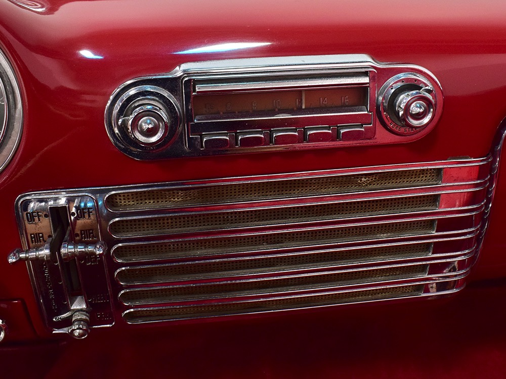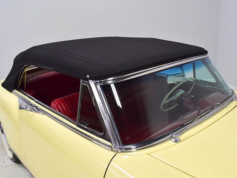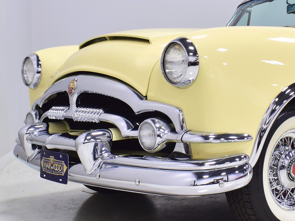 The red leather interior is exactly the right choice with the Ivory bodywork, creating a flashy yet sophisticated contrast that feels sporting not dated. The hides are in great condition with only minimal signs of use and no tears, splits, or scuffs on the seating surfaces. Matching red carpets are deep and plush, helping to keep the interior quiet and comfortable and the simple door panels are an exercise in good taste and restraint. The standard Packard dashboard puts a three-gauge pod ahead of the driver, and this car carries original, unrestored gauges that are the only part of the interior that hasn’t been freshened. All the gauges work except the speedometer and clock, and things like the innovative warning lights, heater/defroster, and even the radio and power antenna are fully operational. The big ivory plastic steering wheel has obviously been restored and shows quite well with no cracking and the horn ring looks good, showing only very, very minor pitting that suggests it’s original. Packard logo floor mats protect those plush carpets and this car is equipped with optional power windows that all go up and down easily and the power seat works as it should. There’s also a black canvas power convertible top that folds easily and stows under a matching black boot, and we have to admit that this is one great-looking convertible. The trunk is positively massive and has been trimmed with matching red carpets—note that the spare tire well is still in place but obviously the spare tire is on the rear bumper in the continental kit.
