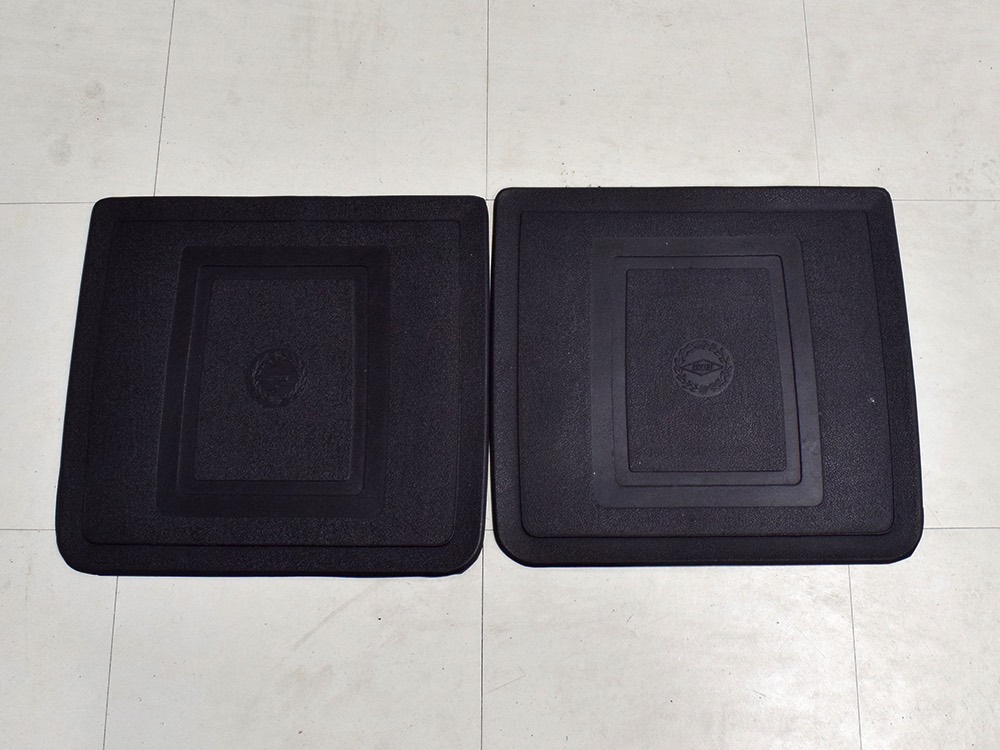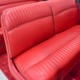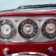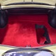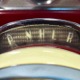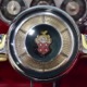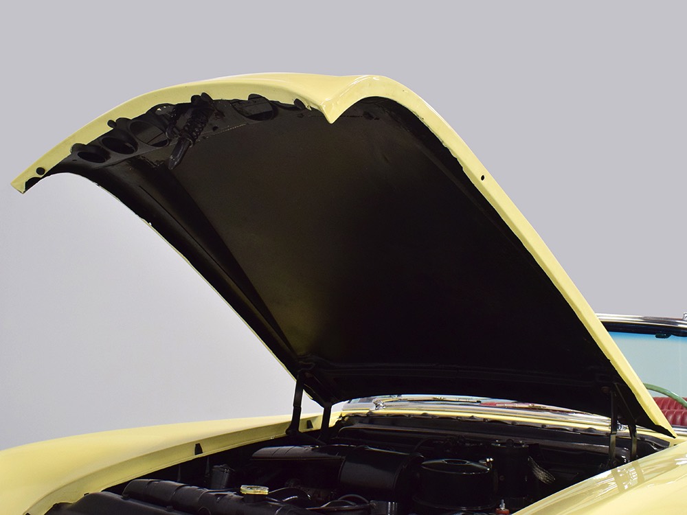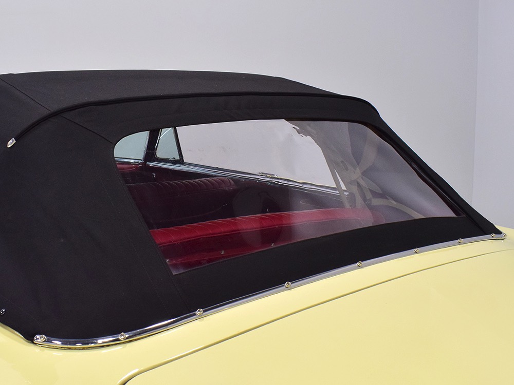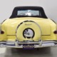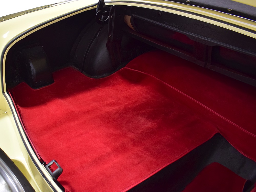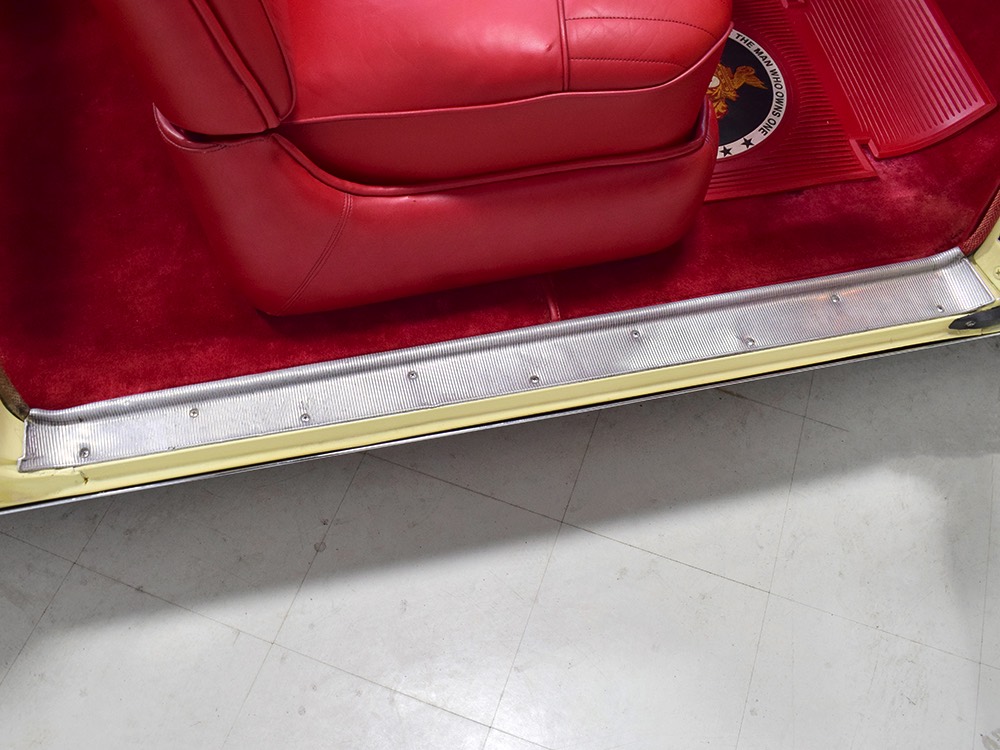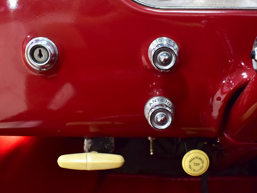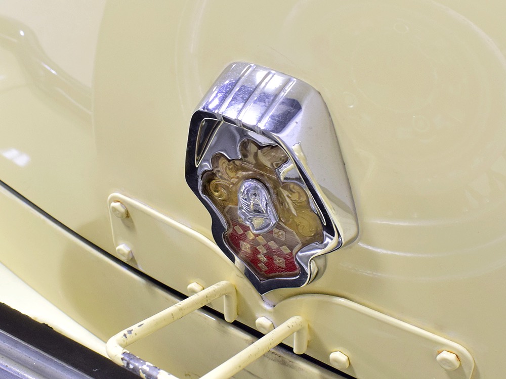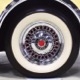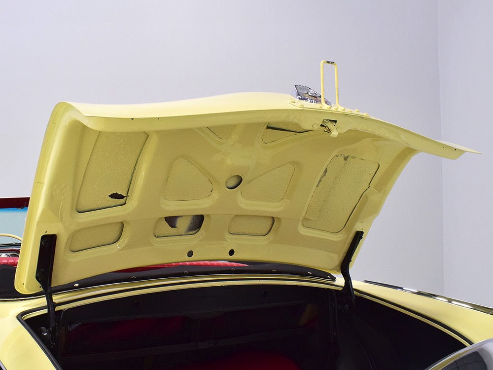 The red leather interior is exactly the right choice with the Ivory bodywork, creating a flashy yet sophisticated contrast that feels sporting not dated. The hides are in great condition with only minimal signs of use and no tears, splits, or scuffs on the seating surfaces. Matching red carpets are deep and plush, helping to keep the interior quiet and comfortable and the simple door panels are an exercise in good taste and restraint. The standard Packard dashboard puts a three-gauge pod ahead of the driver, and this car carries original, unrestored gauges that are the only part of the interior that hasn’t been freshened. All the gauges work except the speedometer and clock, and things like the innovative warning lights, heater/defroster, and even the radio and power antenna are fully operational. The big ivory plastic steering wheel has obviously been restored and shows quite well with no cracking and the horn ring looks good, showing only very, very minor pitting that suggests it’s original. Packard logo floor mats protect those plush carpets and this car is equipped with optional power windows that all go up and down easily and the power seat works as it should. There’s also a black canvas power convertible top that folds easily and stows under a matching black boot, and we have to admit that this is one great-looking convertible. The trunk is positively massive and has been trimmed with matching red carpets—note that the spare tire well is still in place but obviously the spare tire is on the rear bumper in the continental kit.