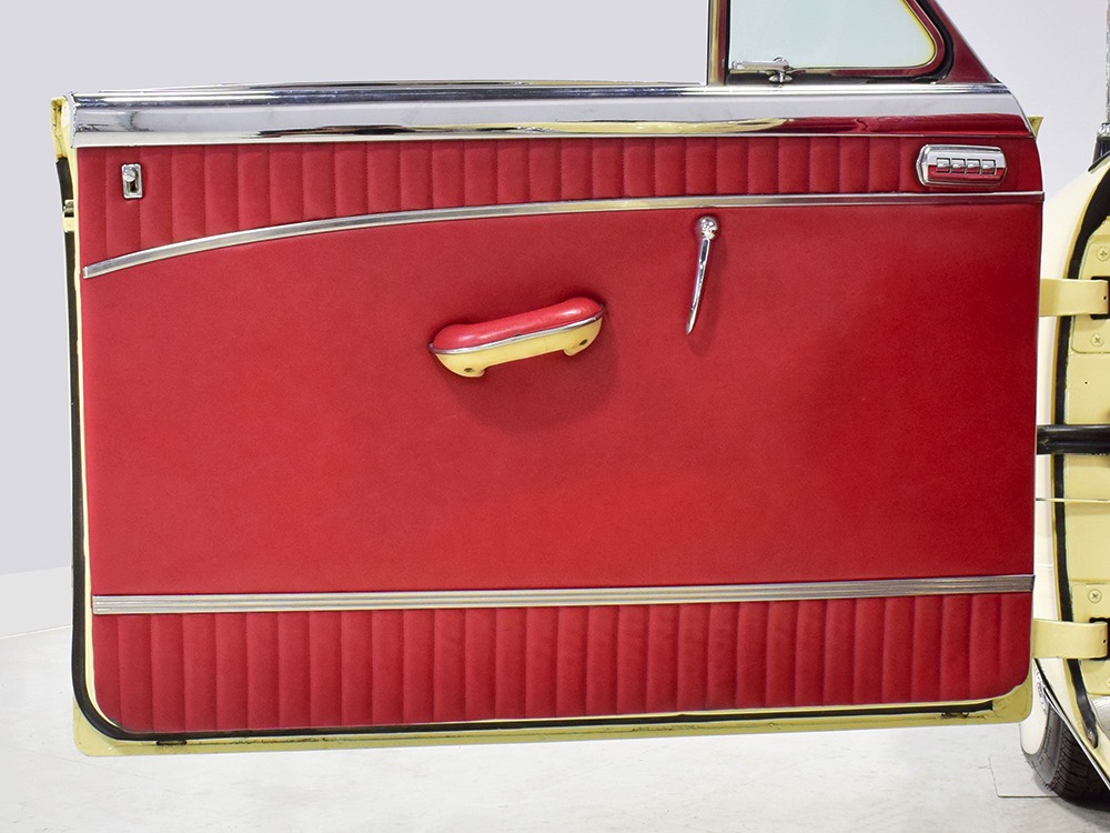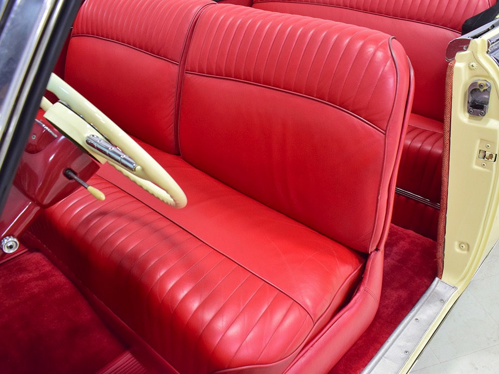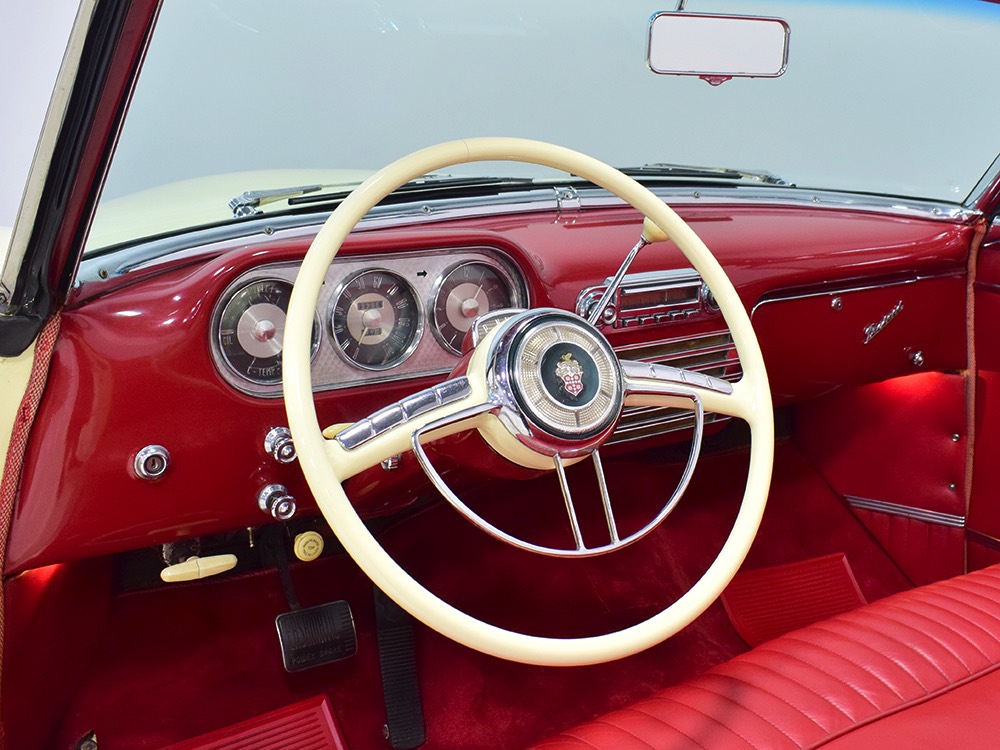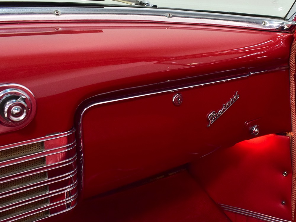 The Caribbean was built for four years, and each enthusiast has their own favorite style, but a great many believe that the 1953 Caribbean was the purest, most elegant design and the last of the truly great straight-8 Packards. The radiused rear wheel openings are the primary difference and it’s significant—the ’53 looks sporting and lithe, while later cars with skirts tended towards heavy and ponderous. Then there’s the color combination on this car, which is Packard Ivory over red leather, a late addition to the roster and available as special-order only. Some estimates suggest that fewer than 10 (out of 750 total 1953 Caribbeans) were painted this color, making it a highly desirable car among highly desirable cars. In 2012, this Caribbean was treated to a bare metal respray and the finish still shows extremely well, with a soft shine that’s entirely appropriate for a product of the 1950s. Gaps are very good, and yes, that hood scoop—which was hand-fashioned out of lead on the assembly line—looks better than ever. Most of the chrome was refinished at that same time and shows beautifully today, particularly the distinctive trim around the wheel arches and along the sills. The Caribbean also wears unique chrome details along the belt line and on the rear quarters, forming miniature tail fins before such things were truly fashionable. The result is a car that looks fantastic from any angle.