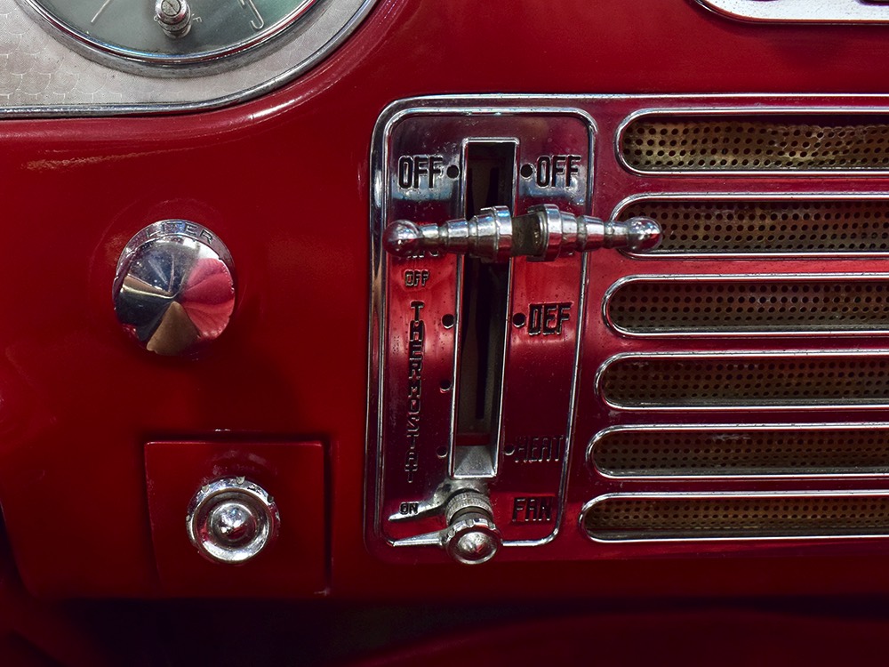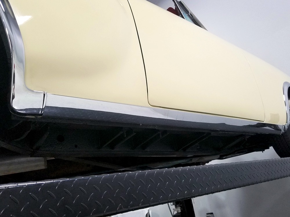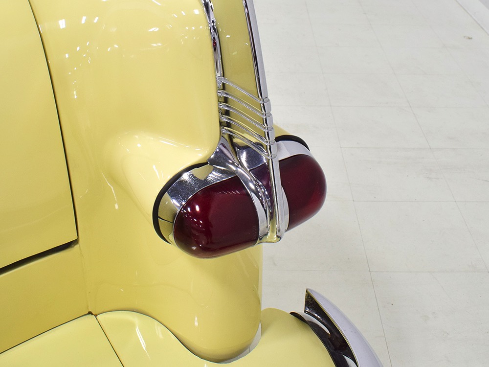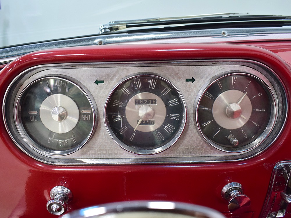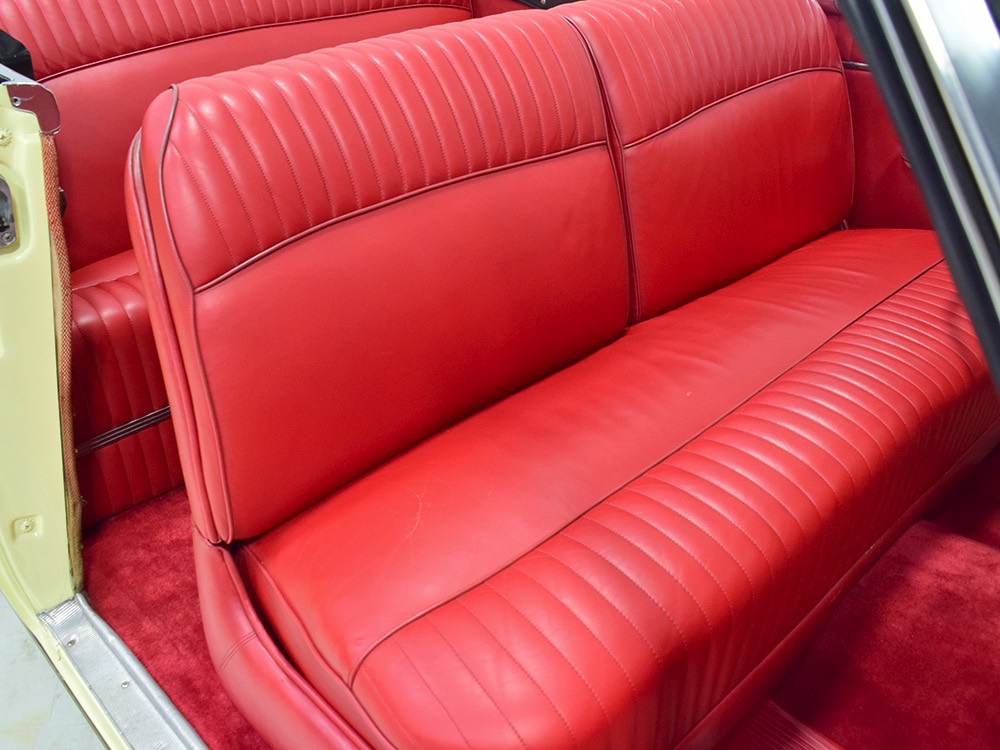 The Caribbean was built for four years, and each enthusiast has their own favorite style, but a great many believe that the 1953 Caribbean was the purest, most elegant design and the last of the truly great straight-8 Packards. The radiused rear wheel openings are the primary difference and it’s significant—the ’53 looks sporting and lithe, while later cars with skirts tended towards heavy and ponderous. Then there’s the color combination on this car, which is Packard Ivory over red leather, a late addition to the roster and available as special-order only. Some estimates suggest that fewer than 10 (out of 750 total 1953 Caribbeans) were painted this color, making it a highly desirable car among highly desirable cars. In 2012, this Caribbean was treated to a bare metal respray and the finish still shows extremely well, with a soft shine that’s entirely appropriate for a product of the 1950s. Gaps are very good, and yes, that hood scoop—which was hand-fashioned out of lead on the assembly line—looks better than ever. Most of the chrome was refinished at that same time and shows beautifully today, particularly the distinctive trim around the wheel arches and along the sills. The Caribbean also wears unique chrome details along the belt line and on the rear quarters, forming miniature tail fins before such things were truly fashionable. The result is a car that looks fantastic from any angle.