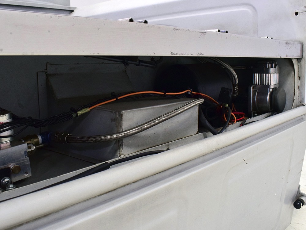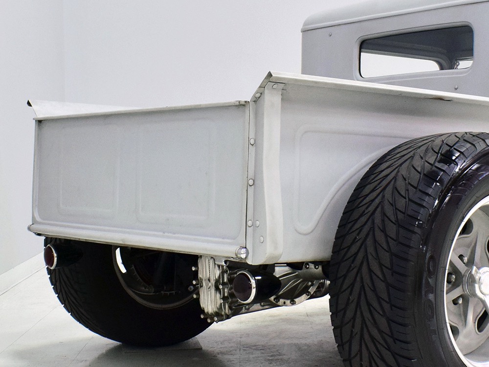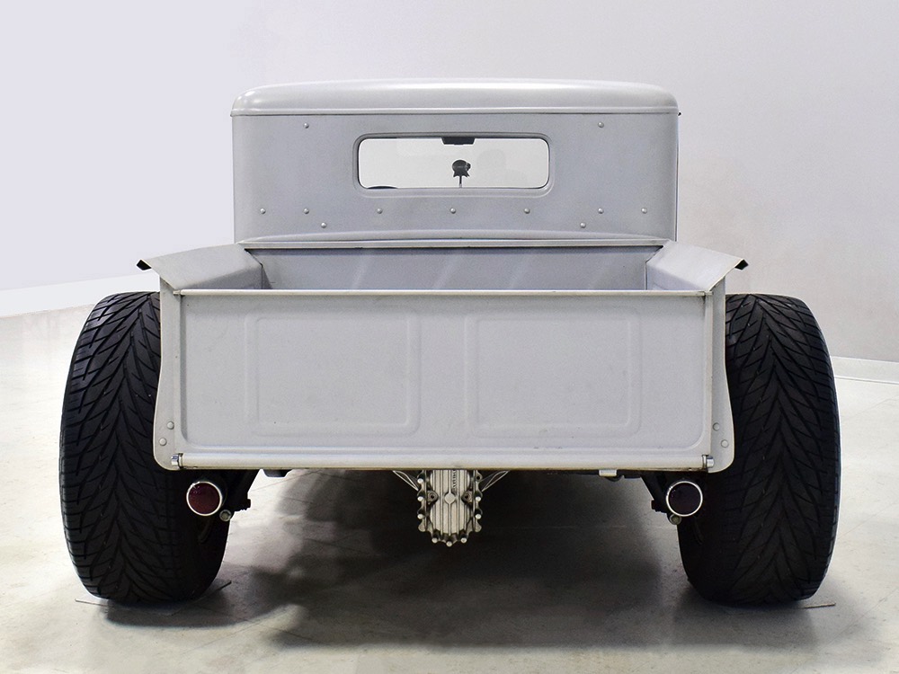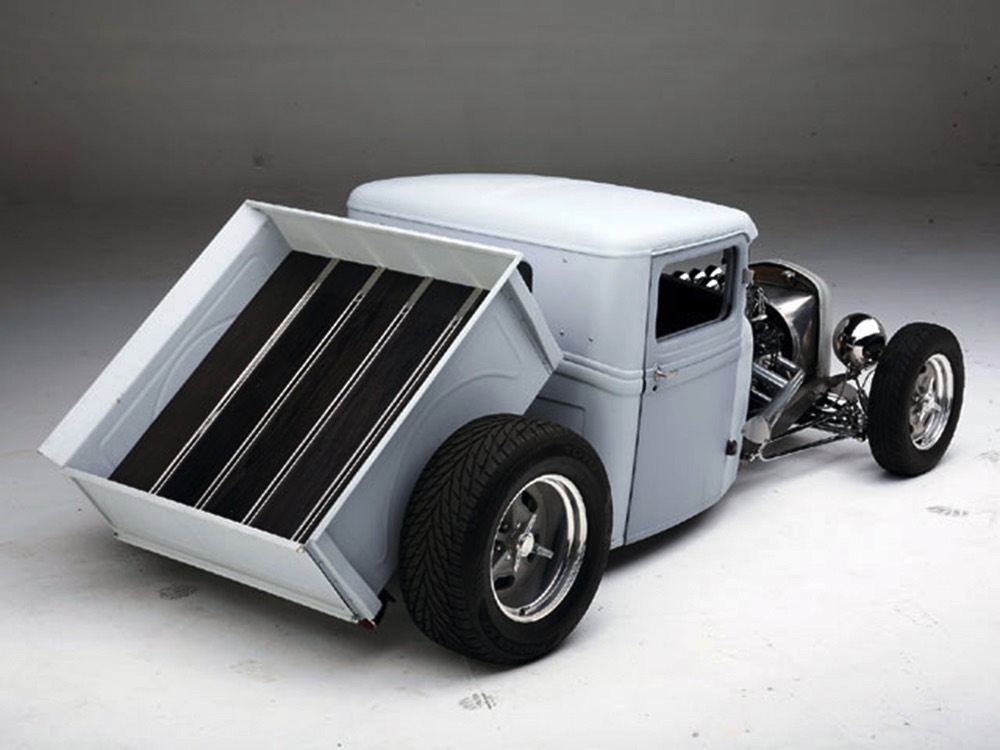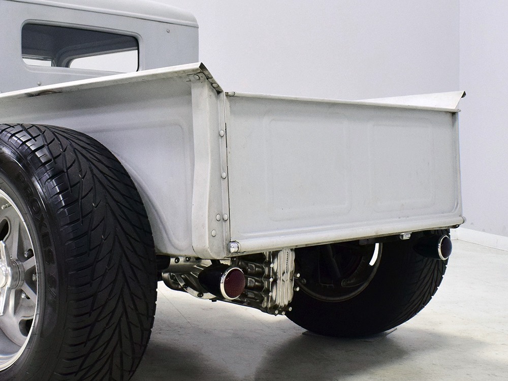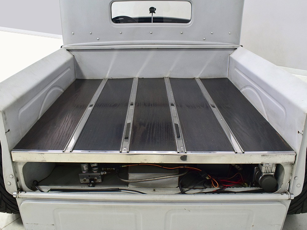 Now, back to the cab. Once it was on that bare metal frame, it just looked so right that they left it alone. Who needs paint? Low maintenance was the intent and what’s more maintenance-free than no paint at all? Rain, bugs, whatever, this truck doesn’t care. It has a raw, unfussy look that we find extremely appealing in this age of guys walking around their cars at shows burning through Quick Detailer by the quart. Yep, you’re seeing that right, the exhaust header has started to discolor the door paint at the lower hinge—I only wish I could accelerate the process to really make it look nasty. But while you’re looking at the non-paint job, please also note how well the doors fit, the tight gaps, and the beautifully finished oak planks in the bed, which were stained ebony to add some contrast. The tailgate drops down easily and under the bed you’ll find the controls for the Air Ride system, and it tilts at the front to give you access to the spun aluminum gas tank underneath. And while you’re in there, check out all those beautiful welds, which are the work of an artist. ’32 Ford commercial headlights always look better than generic King Bees and ’37 Ford taillights tucked under the bed look like they were born there.
