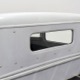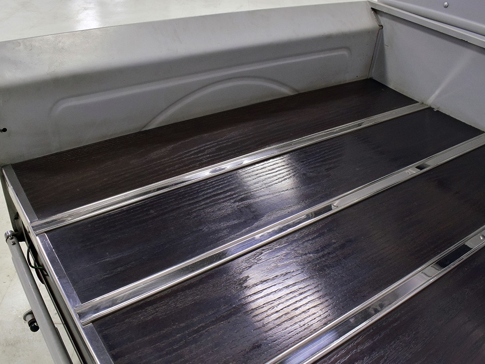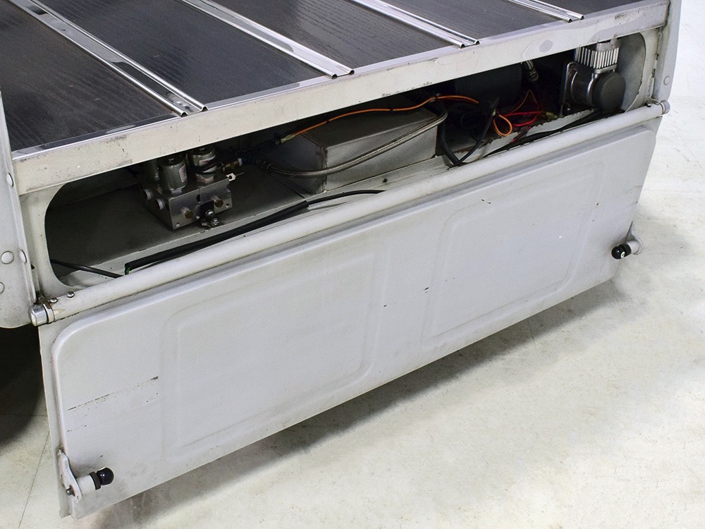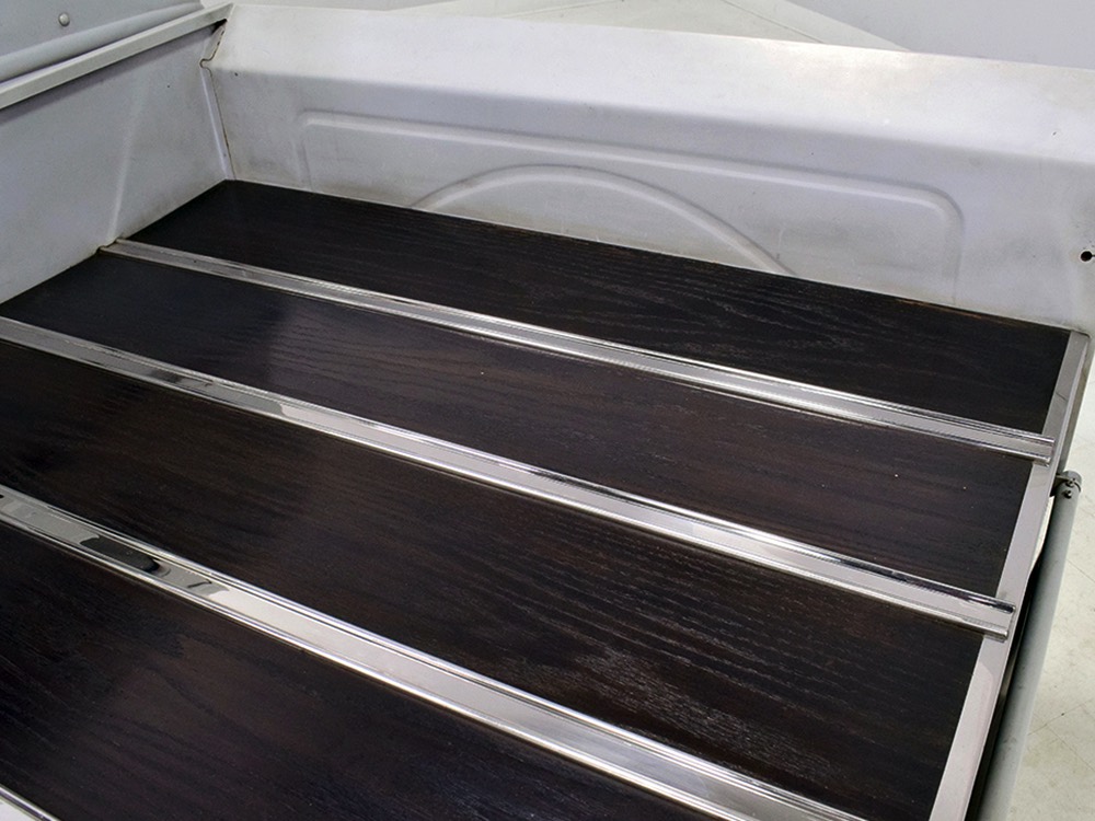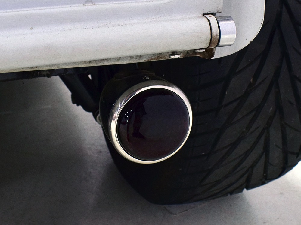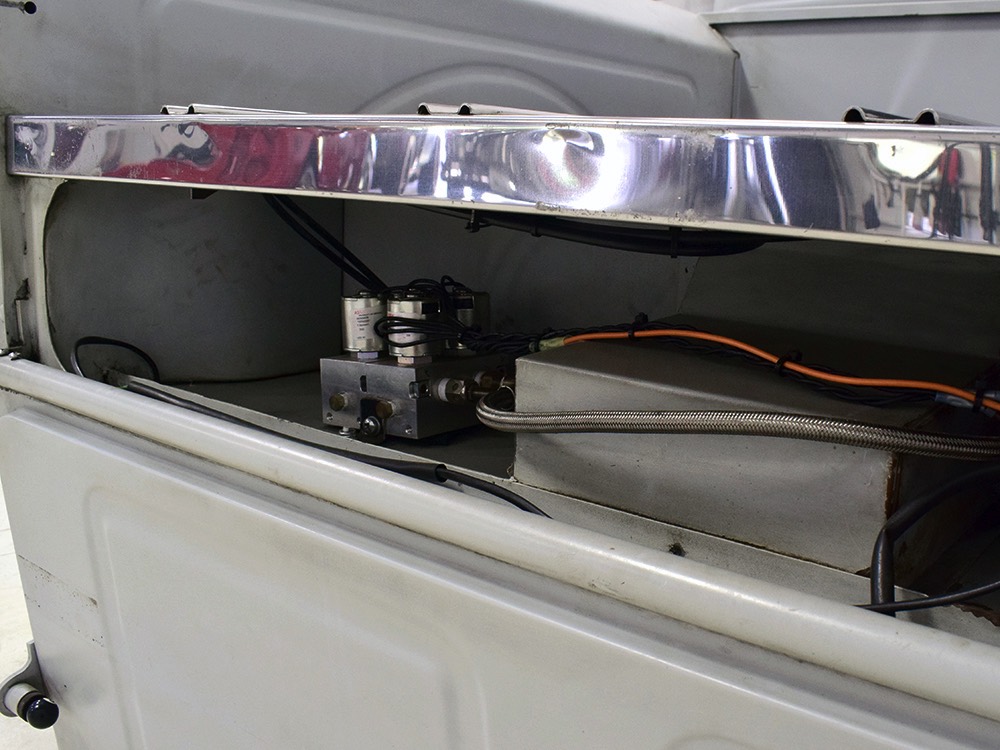 Now, back to the cab. Once it was on that bare metal frame, it just looked so right that they left it alone. Who needs paint? Low maintenance was the intent and what’s more maintenance-free than no paint at all? Rain, bugs, whatever, this truck doesn’t care. It has a raw, unfussy look that we find extremely appealing in this age of guys walking around their cars at shows burning through Quick Detailer by the quart. Yep, you’re seeing that right, the exhaust header has started to discolor the door paint at the lower hinge—I only wish I could accelerate the process to really make it look nasty. But while you’re looking at the non-paint job, please also note how well the doors fit, the tight gaps, and the beautifully finished oak planks in the bed, which were stained ebony to add some contrast. The tailgate drops down easily and under the bed you’ll find the controls for the Air Ride system, and it tilts at the front to give you access to the spun aluminum gas tank underneath. And while you’re in there, check out all those beautiful welds, which are the work of an artist. ’32 Ford commercial headlights always look better than generic King Bees and ’37 Ford taillights tucked under the bed look like they were born there.