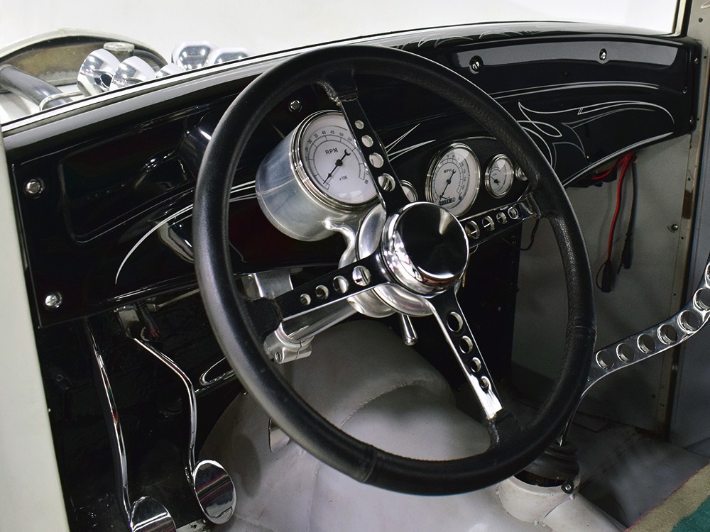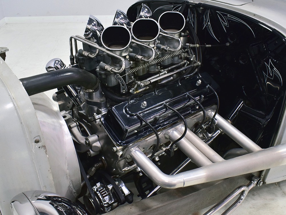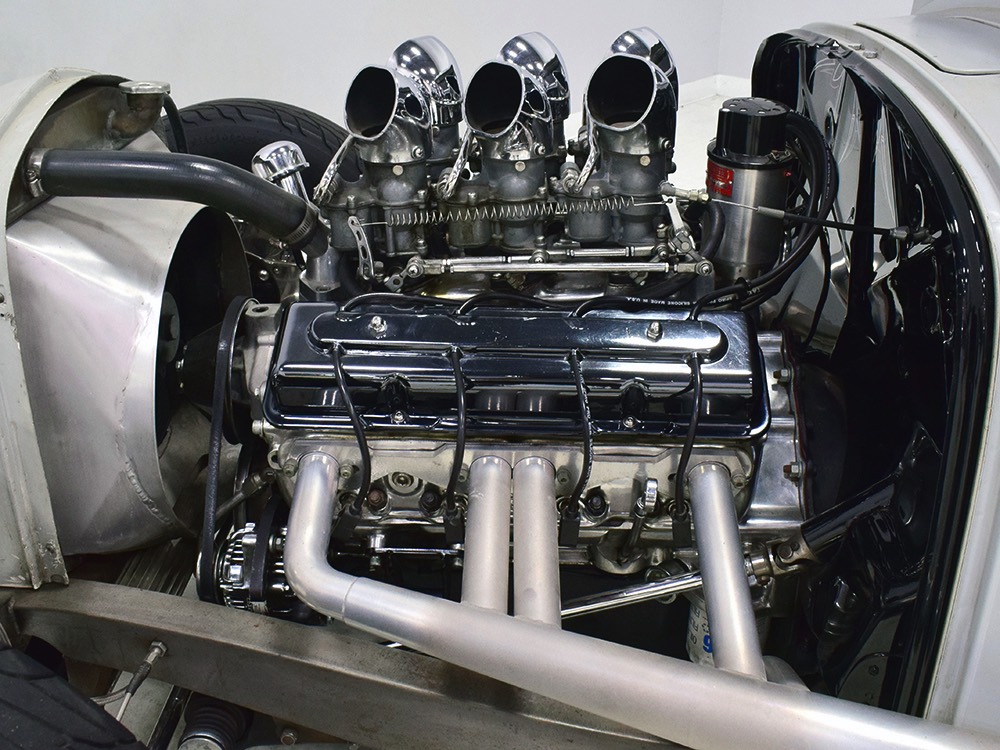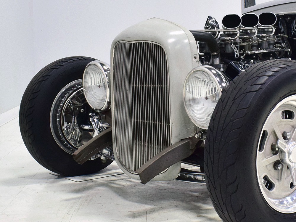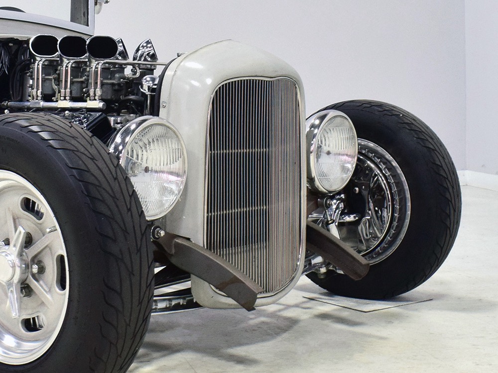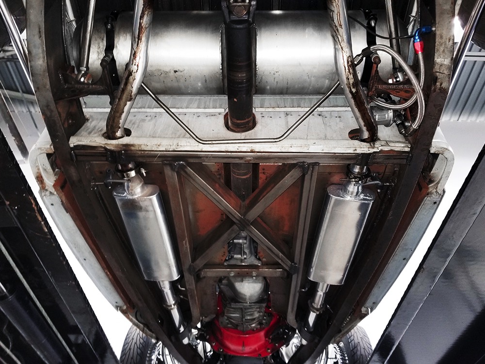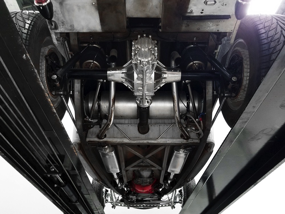Back at the shop, he already had the chassis ready to go, a custom-fabricated piece that was based on a pair of Hot Rods & Custom Stuff ’32 frame rails, but that’s as far as he went—no kit, no pre-engineered rolling chassis, no bolt-on stuff. No, he wanted to do it his way, and that meant fabricating everything. He started by stretching it three inches to give it just the right stance and to push the front axle well ahead of the motor for that awesome rake. He left the whole thing in bare steel so you could see his gorgeous TIG welds and exceptional fabrication on the brackets, mounts, crossmembers, and other critical parts. Up close this thing is a master class in the fabricator’s art. There’s a beefy X-frame reinforcing the center of the boxed frame rails, but it’s designed so the Tremec TKO600 5-speed manual gearbox can drop right out using a removable crossmember. All the plumbing and wiring runs inside the frame rails, too, so you can’t see any of it, and there’s a light patina on the metal that’s just plain awesome. Not rusty, but a little bit used. That was the whole point. Look around and you’ll also see a chrome Magnum 5-inch dropped I-beam axle and leaf spring, along with matching hairpin radius rods, all chosen because they were going to be visible. On the ends you’ll find Buick finned aluminum brake drums with disc brakes cleverly hidden inside for an old-school look and improved performance. The aforementioned Tremec 5-speed gearbox feeds a custom-made Inland Empire driveshaft and a genuine polished aluminum Halibrand champ car quick-change rear end, currently set up for 4.11 gearing. That Halibrand hangs on a set of Air Ride springs so it’ll slam itself on the ground or give you the perfect rake, your call. All the lines are stainless, as is the polished exhaust system, which tucks up in the frame so you don’t have to worry about clearance, even on something this low. Oh, and those are real Halibrand wheels up front, with 18-inch replicas out back.