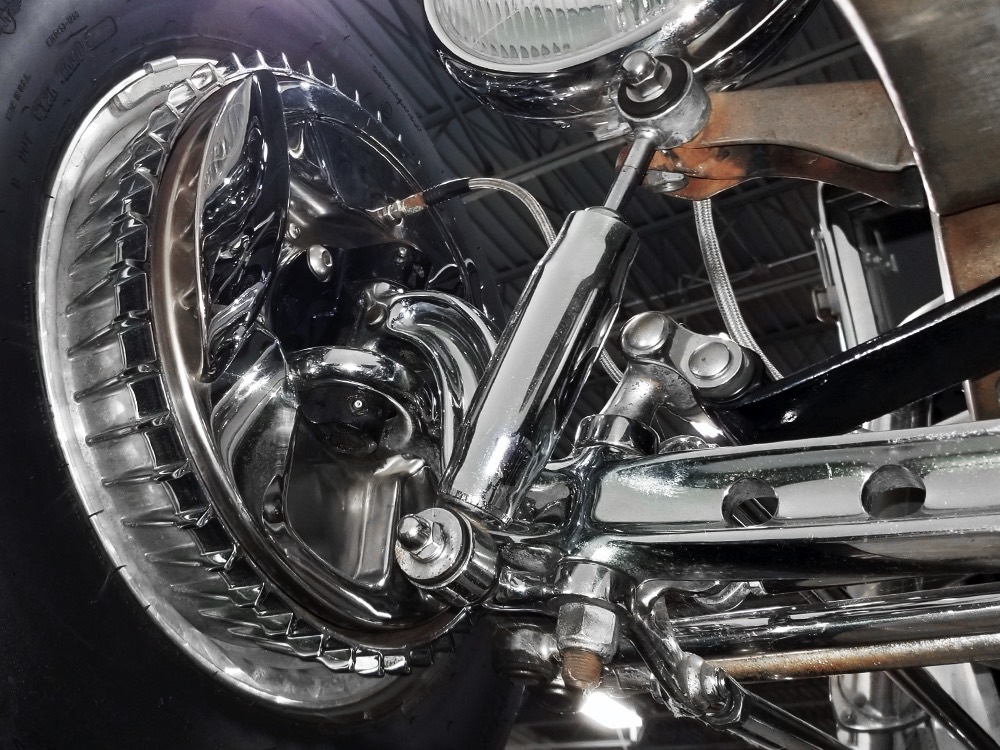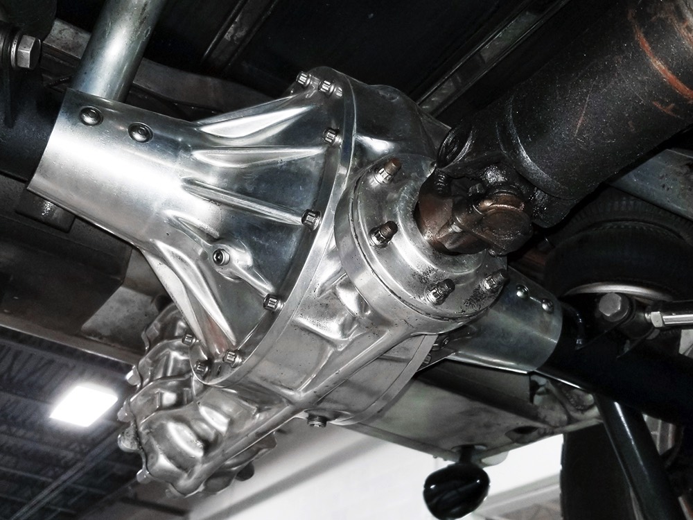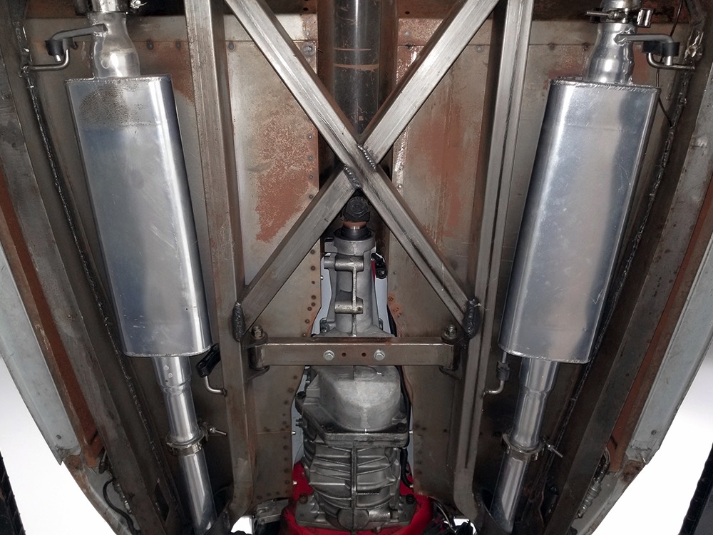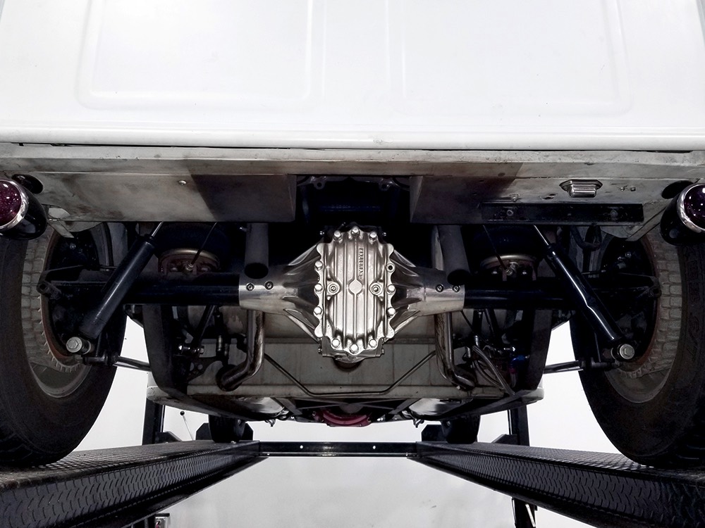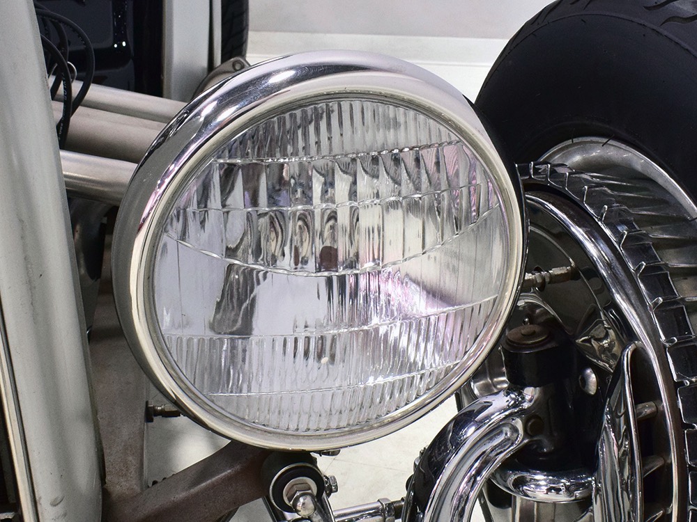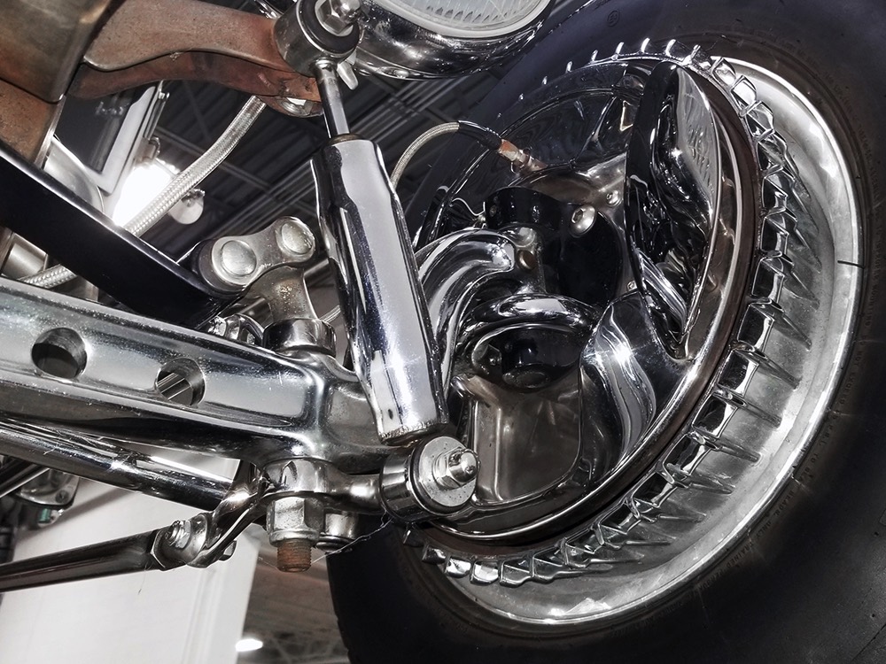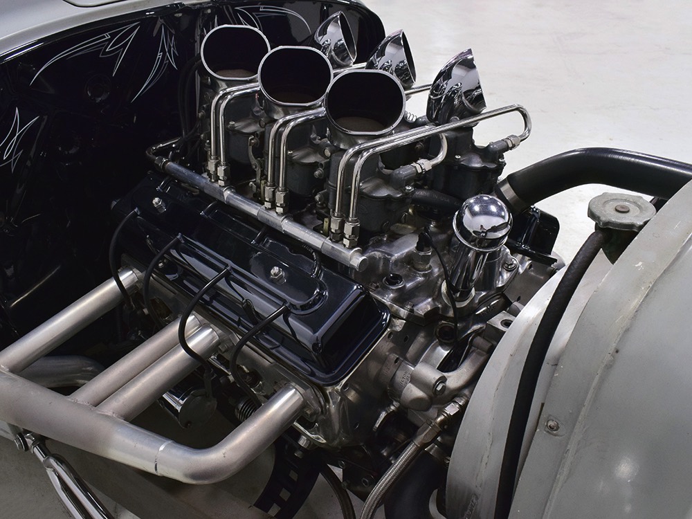 Back at the shop, he already had the chassis ready to go, a custom-fabricated piece that was based on a pair of Hot Rods & Custom Stuff ’32 frame rails, but that’s as far as he went—no kit, no pre-engineered rolling chassis, no bolt-on stuff. No, he wanted to do it his way, and that meant fabricating everything. He started by stretching it three inches to give it just the right stance and to push the front axle well ahead of the motor for that awesome rake. He left the whole thing in bare steel so you could see his gorgeous TIG welds and exceptional fabrication on the brackets, mounts, crossmembers, and other critical parts. Up close this thing is a master class in the fabricator’s art. There’s a beefy X-frame reinforcing the center of the boxed frame rails, but it’s designed so the Tremec TKO600 5-speed manual gearbox can drop right out using a removable crossmember. All the plumbing and wiring runs inside the frame rails, too, so you can’t see any of it, and there’s a light patina on the metal that’s just plain awesome. Not rusty, but a little bit used. That was the whole point. Look around and you’ll also see a chrome Magnum 5-inch dropped I-beam axle and leaf spring, along with matching hairpin radius rods, all chosen because they were going to be visible. On the ends you’ll find Buick finned aluminum brake drums with disc brakes cleverly hidden inside for an old-school look and improved performance. The aforementioned Tremec 5-speed gearbox feeds a custom-made Inland Empire driveshaft and a genuine polished aluminum Halibrand champ car quick-change rear end, currently set up for 4.11 gearing. That Halibrand hangs on a set of Air Ride springs so it’ll slam itself on the ground or give you the perfect rake, your call. All the lines are stainless, as is the polished exhaust system, which tucks up in the frame so you don’t have to worry about clearance, even on something this low. Oh, and those are real Halibrand wheels up front, with 18-inch replicas out back.