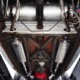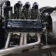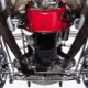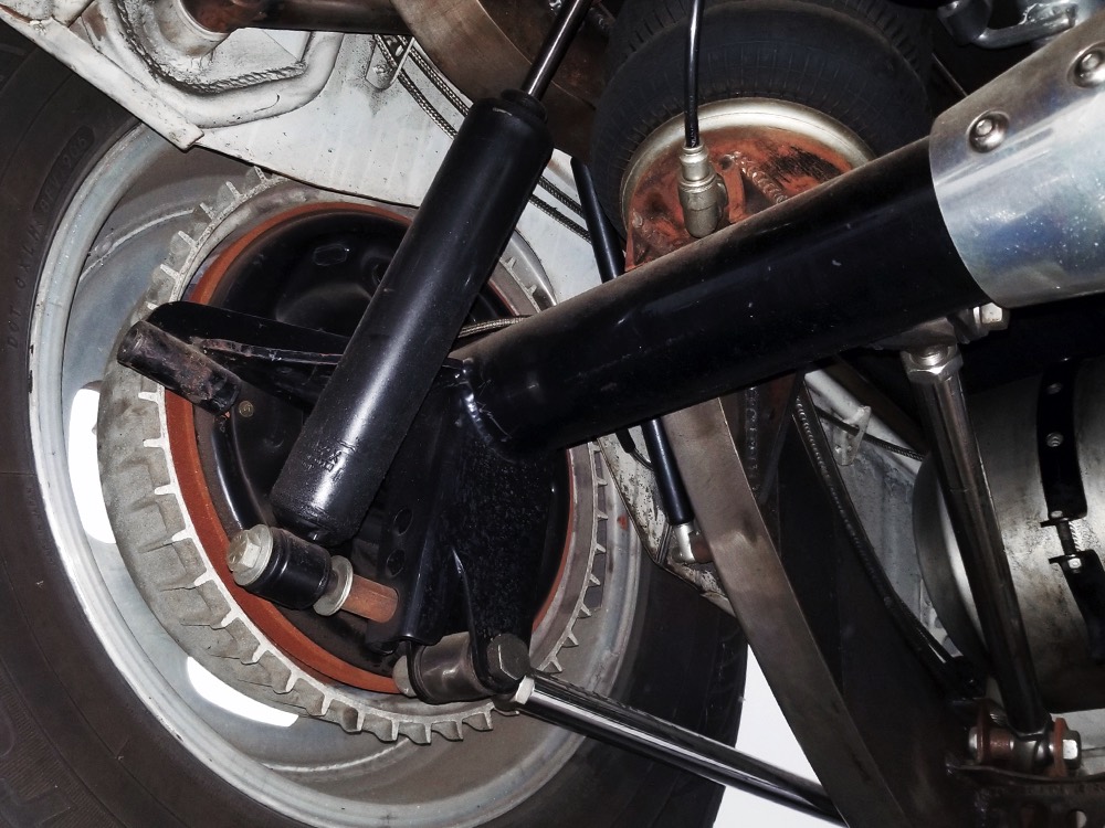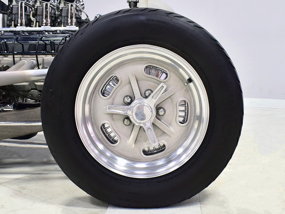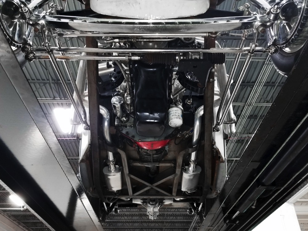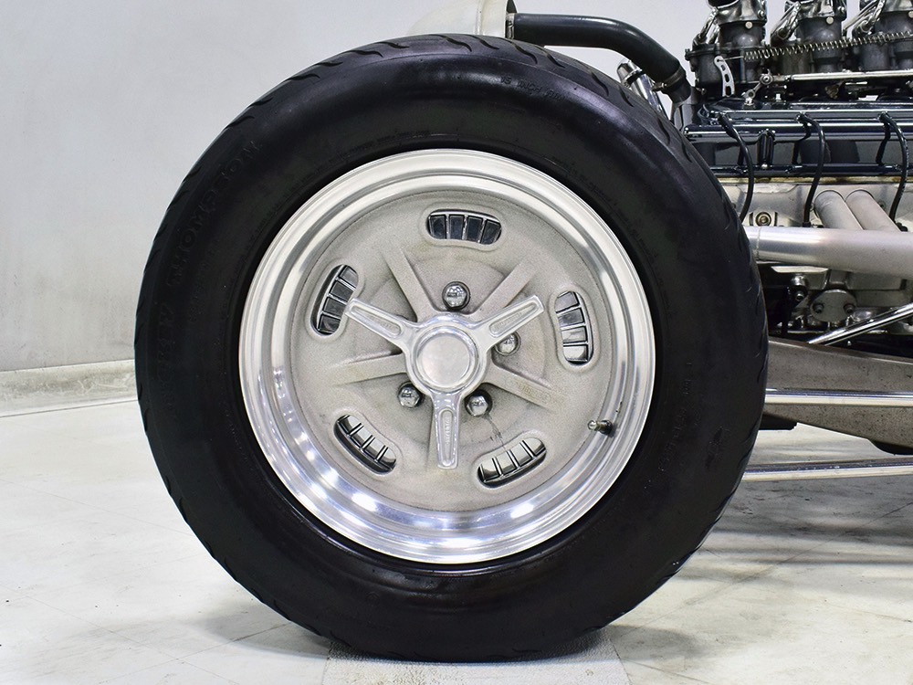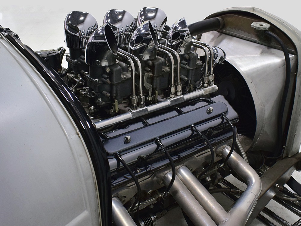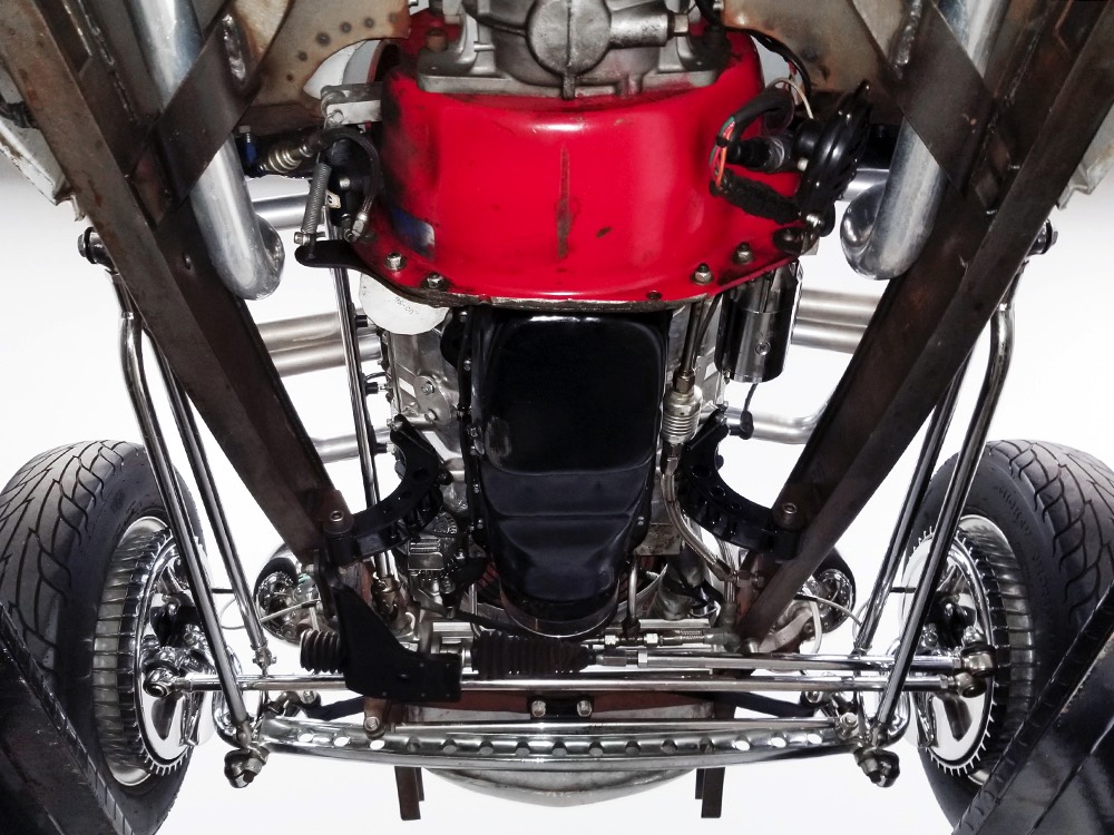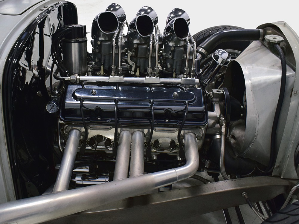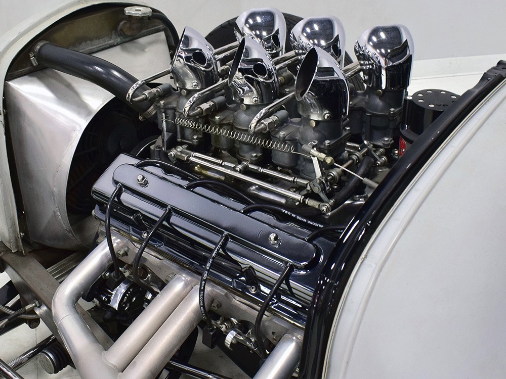 You’ve probably notice the sextet of Holley carbs on top of the engine, but that’s probably the LEAST interesting part of the whole thing. Underneath you’ll find an all-aluminum Hawk small block Chevy V8 that comes from the legendary Lil’ John Buttera himself, one of his leftover Indy competition engines. Yeah, no kidding. It was sleeved and punched out to 412 cubic inches, all in a package that doesn’t weigh any more than a 4-cylinder Toyota engine. Those Holley 94s are on a vintage Offenhauser aluminum intake designed to emulate an Olds J2 setup and there are a pair of Edelbrock aluminum heads with custom valve covers, again designed to duplicate Oldsmobile hardware for a period vibe. It’s currently running only on the center carbs, and I promise you won’t need or want the others online—this sucker starts instantly, idles like it should, stays cool, and will flat-out terrify you if you’re brave enough to put your foot on the floor. Don’t say you weren’t warned. The custom-fabricated headers were also left raw, but they dump into a full stainless exhaust system or they can be left wide-open, which is obviously the preferred choice. A Taylor Vertex distributor looks just like a vintage magneto and there’s a fabricated aluminum shroud for the custom radiator up front built by Hoffman Radiator. There’s even a little tiny alternator tucked down low supplying plenty of juice for the minimalist rod.