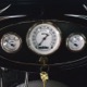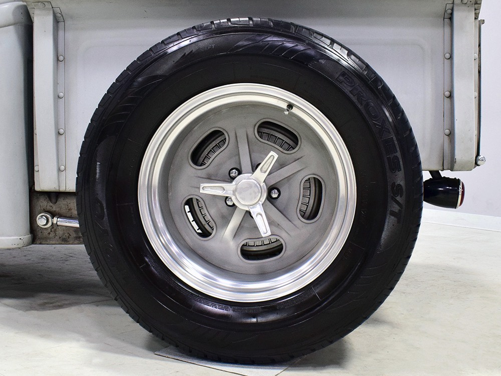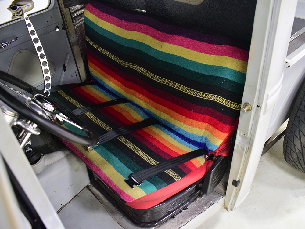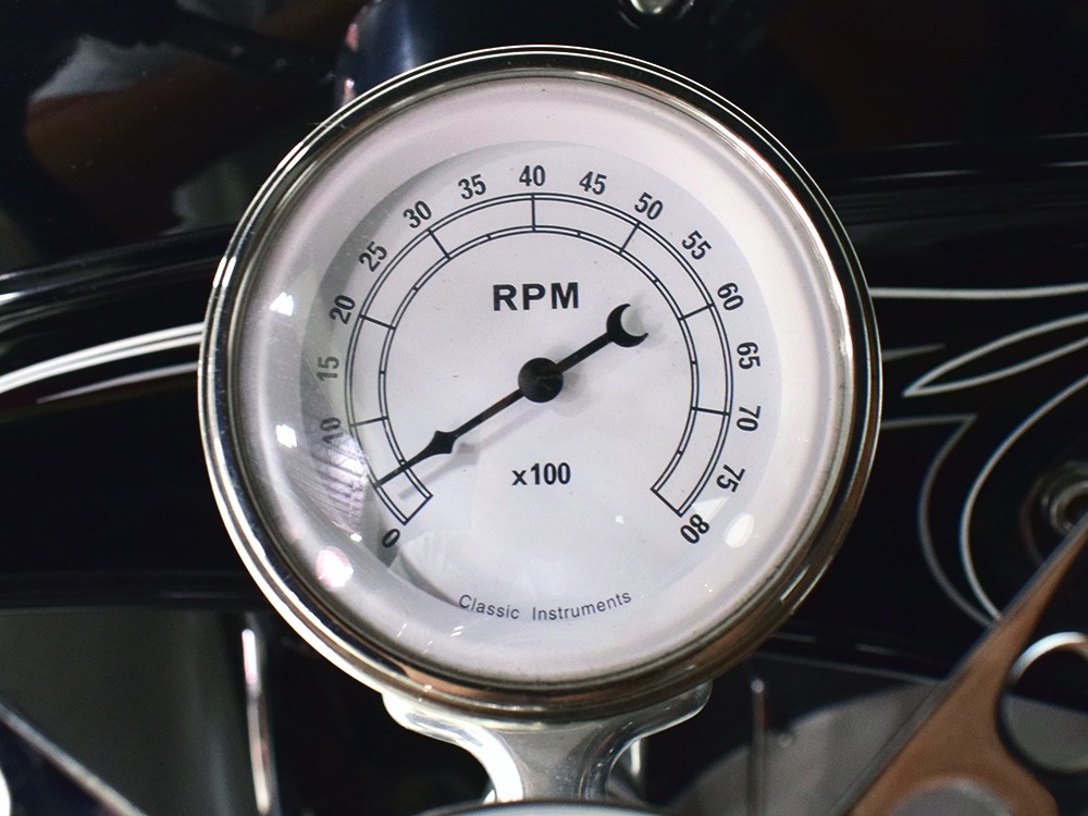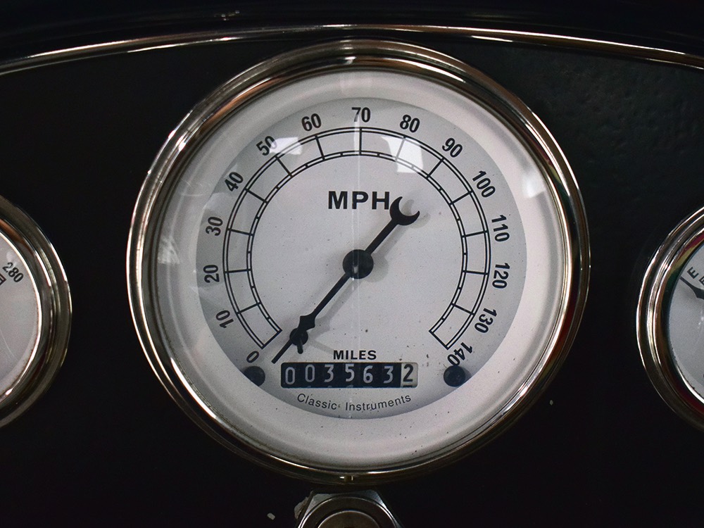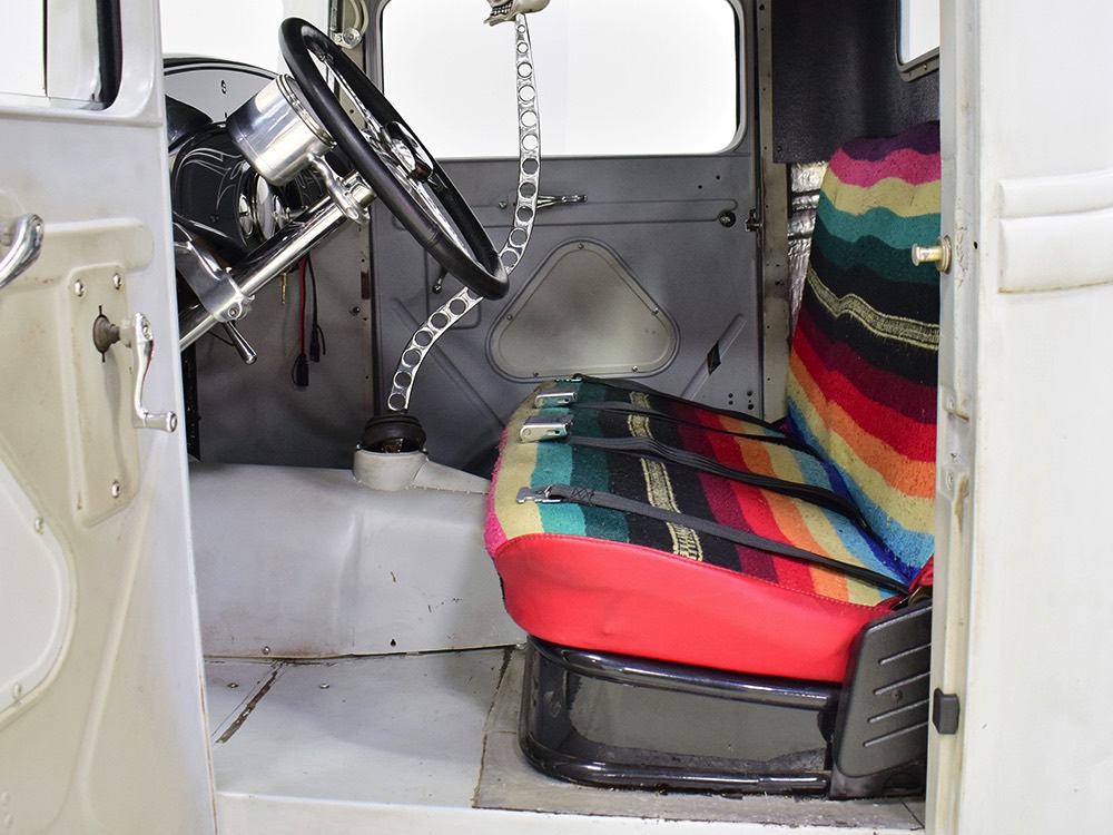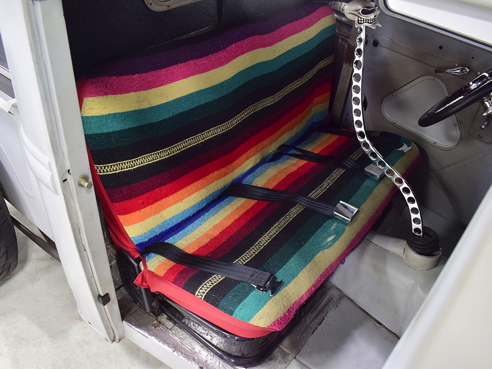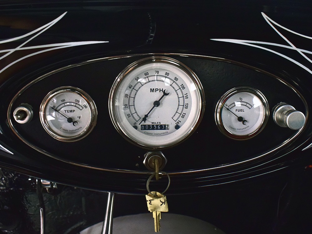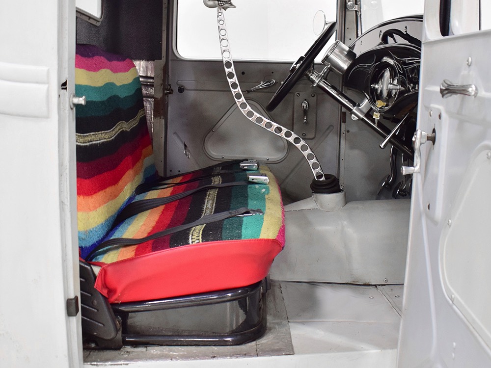 It’s bare-bones inside but it’s no less beautifully crafted. A brand new Glide Engineering bench seat drops right in and it has been upholstered with a traditional Mexican blanket, but it’s not covering ruined upholstery—it’s 100% intentional. A Bell 4-spoke dirt track-style steering wheel lives on top of a custom-made steering column, which also houses a trick tach mount that was whittled out of a single chunk of aluminum. Chrome pedals add some contrast against the primer-colored floors, but even those are beautifully finished to show off the craftsmanship—check out that shifter mount! The firewall and original Ford dash were the only parts of the truck to be painted, wearing gloss black with traditional white pinstripes. Gauges from Classic Instruments monitor the basics and as you can see, with 3563 miles on it, this truck is far from a trailer queen. That wild shifter lever was obviously hand-crafted and chromed, and the one-off shifter knob looks cool and feels surprisingly right in your hand. There’s a bit of insulation to ensure that it’s reasonably comfortable and quiet in there and the headliner is surprisingly well-finished. Nice!